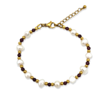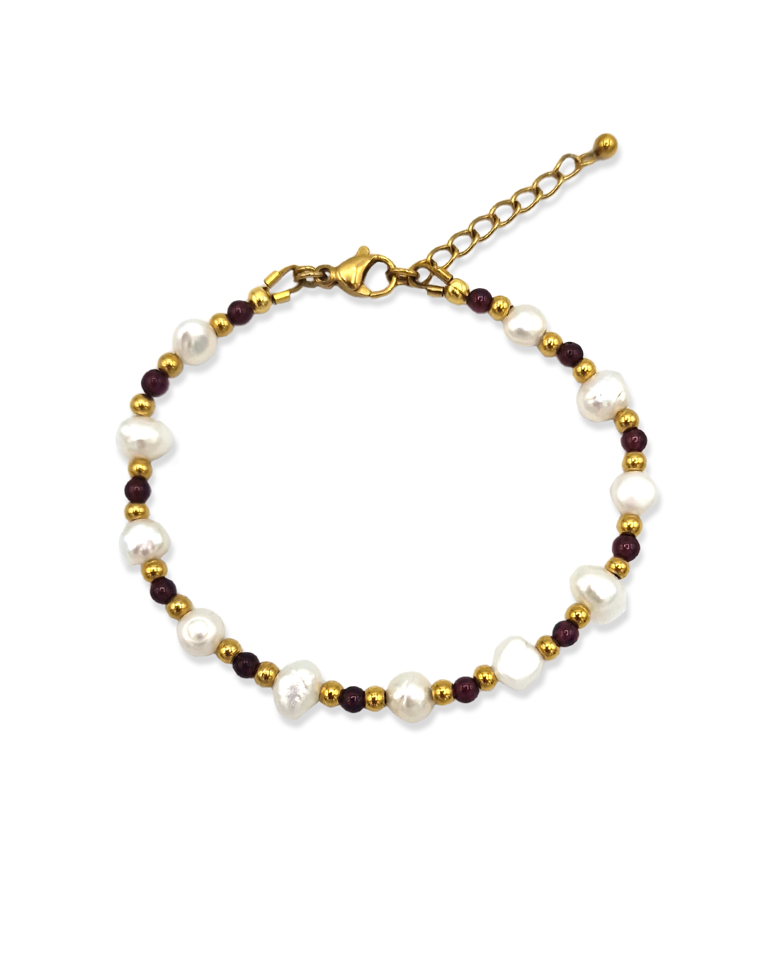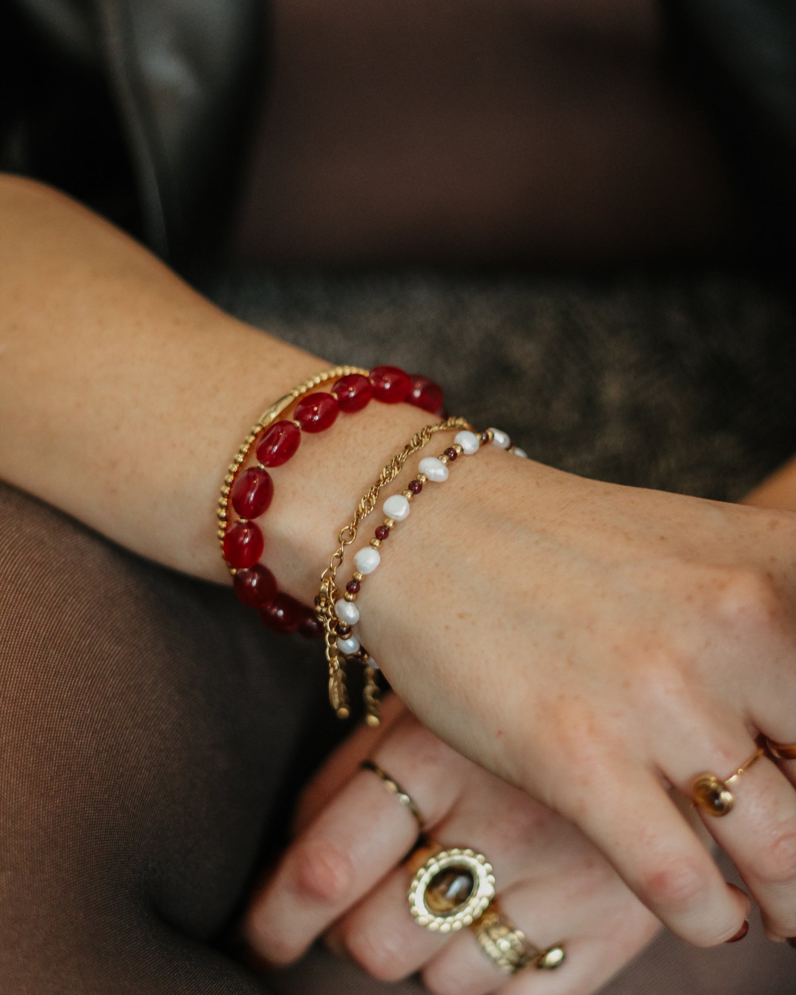 Gemaakt met zoetwaterparels en chalchedoon natuursteenkralen.