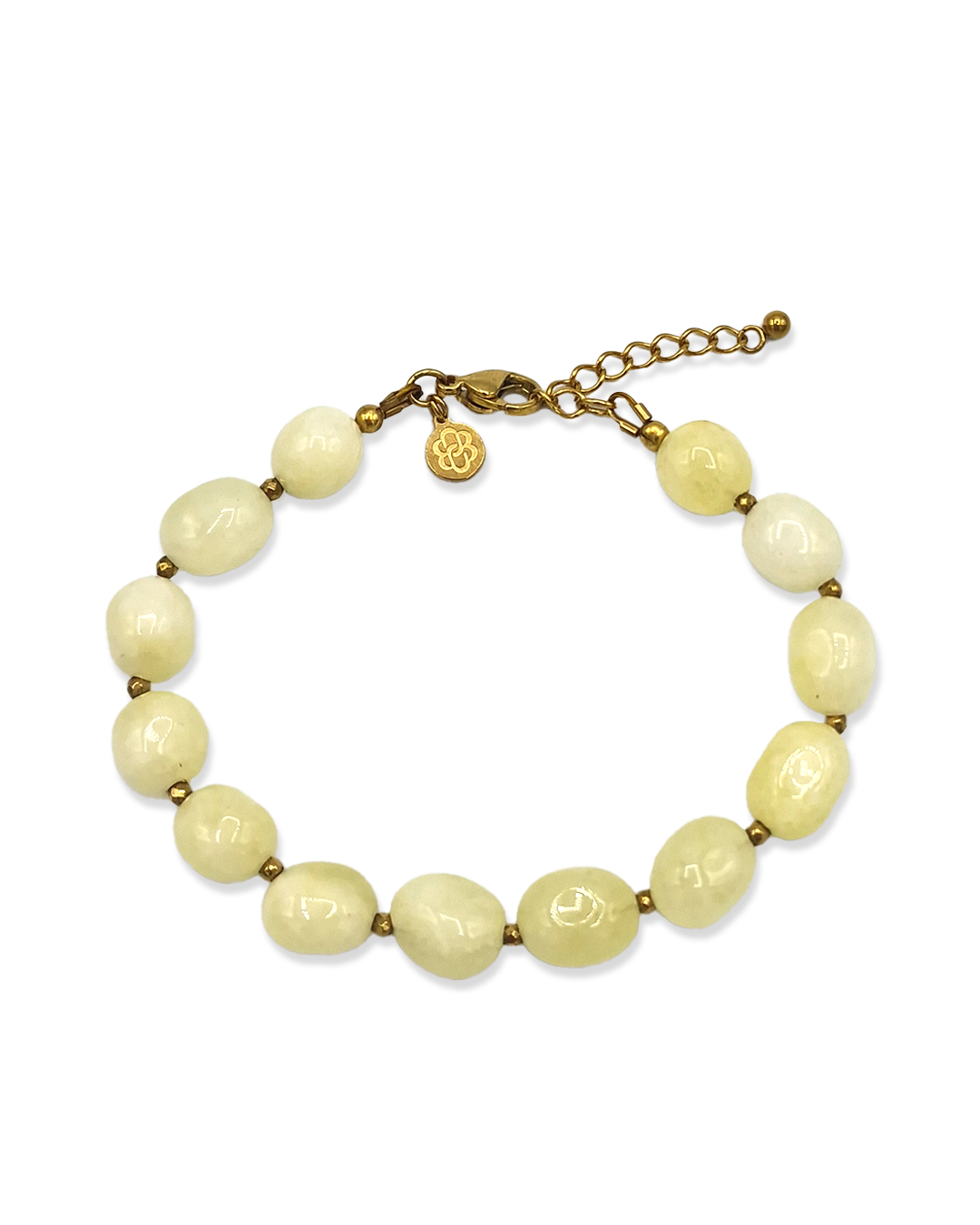 Warm, zacht en helemaal on-trend. De Butter Yellow armband, gemaakt van natuurlijke chalcedoon natuursteen kralen, brengt precies de juiste balans tussen subtiel en krachtig. De botergele tint is een van de trendkleuren voor de lente van 2025 en geeft je look een frisse, moeiteloze touch. Draag hem solo of combineer met andere armbanden voor een gelaagd effect.