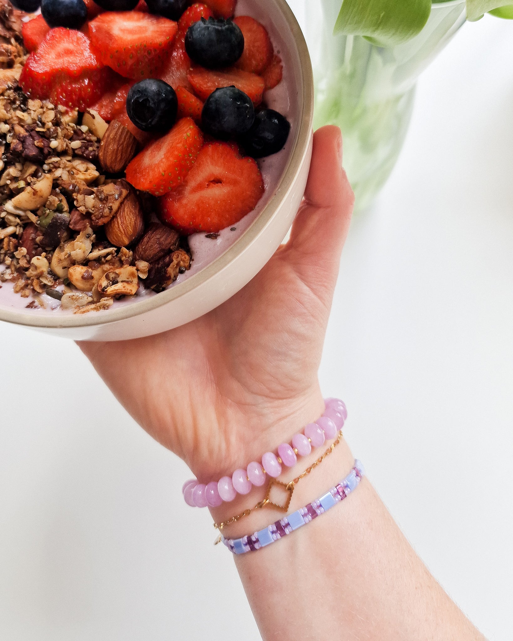 Armbandje met halfedelsteen/natuursteen kralen en kleine glaskralen in lila kleur. Perfect om te combineren met de Candy kettingen!