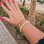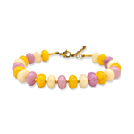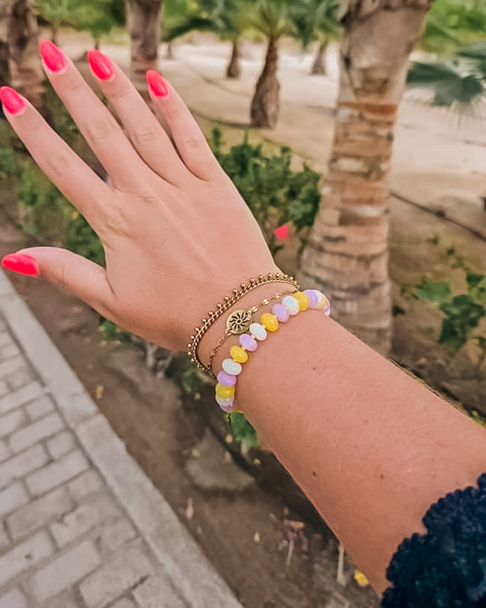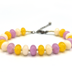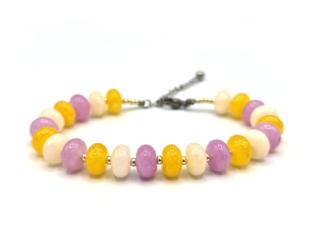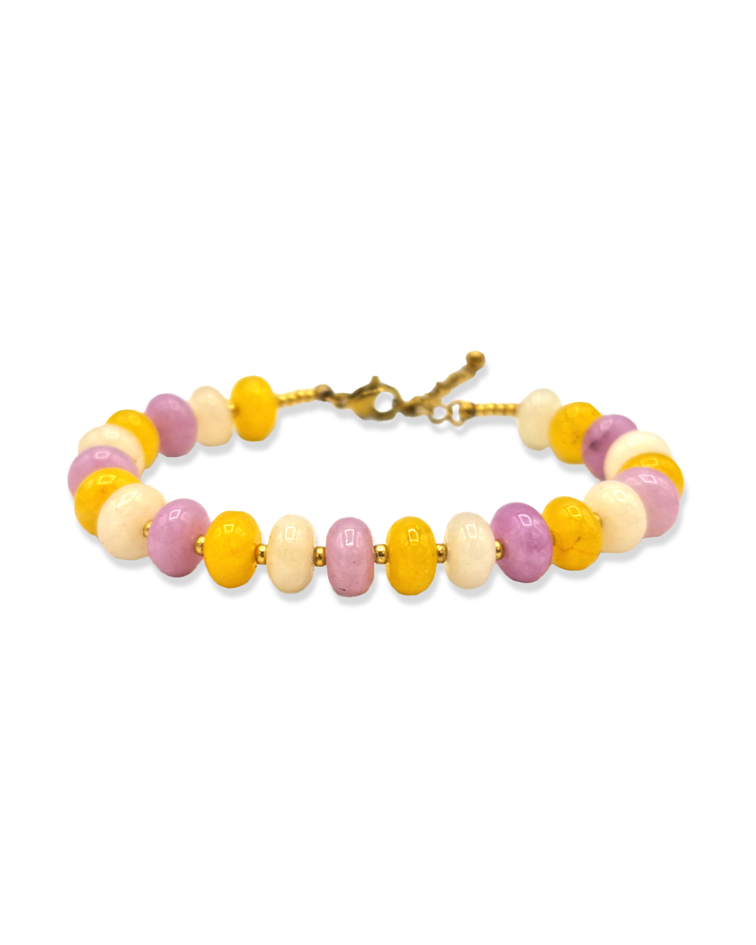 Armbandje met halfedelsteen/natuursteen kralen en kleine glaskralen in lila, geel en crème kleur. Perfect om te combineren met de Candy kettingen!