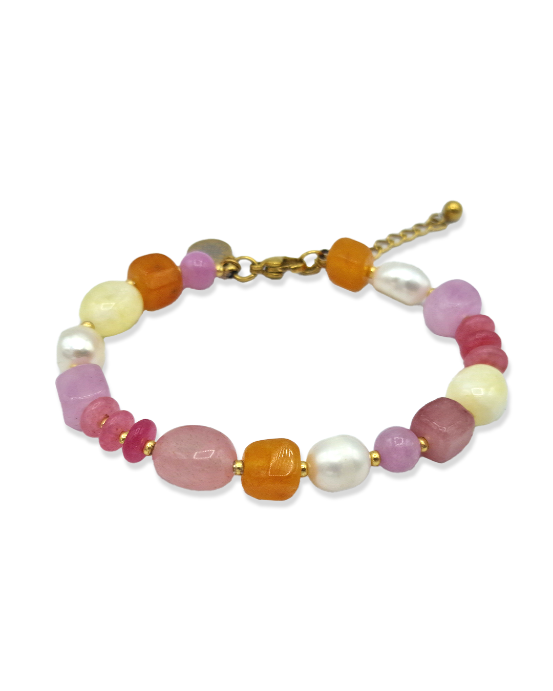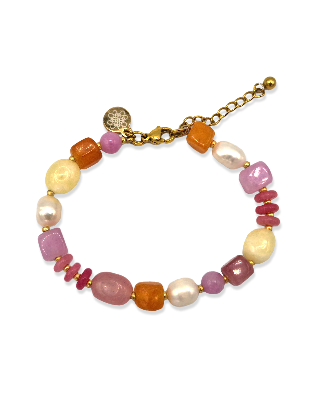Armband met pastel roze, gele en oranje kralen. Met zoetwaterparels. Zo leuk!