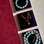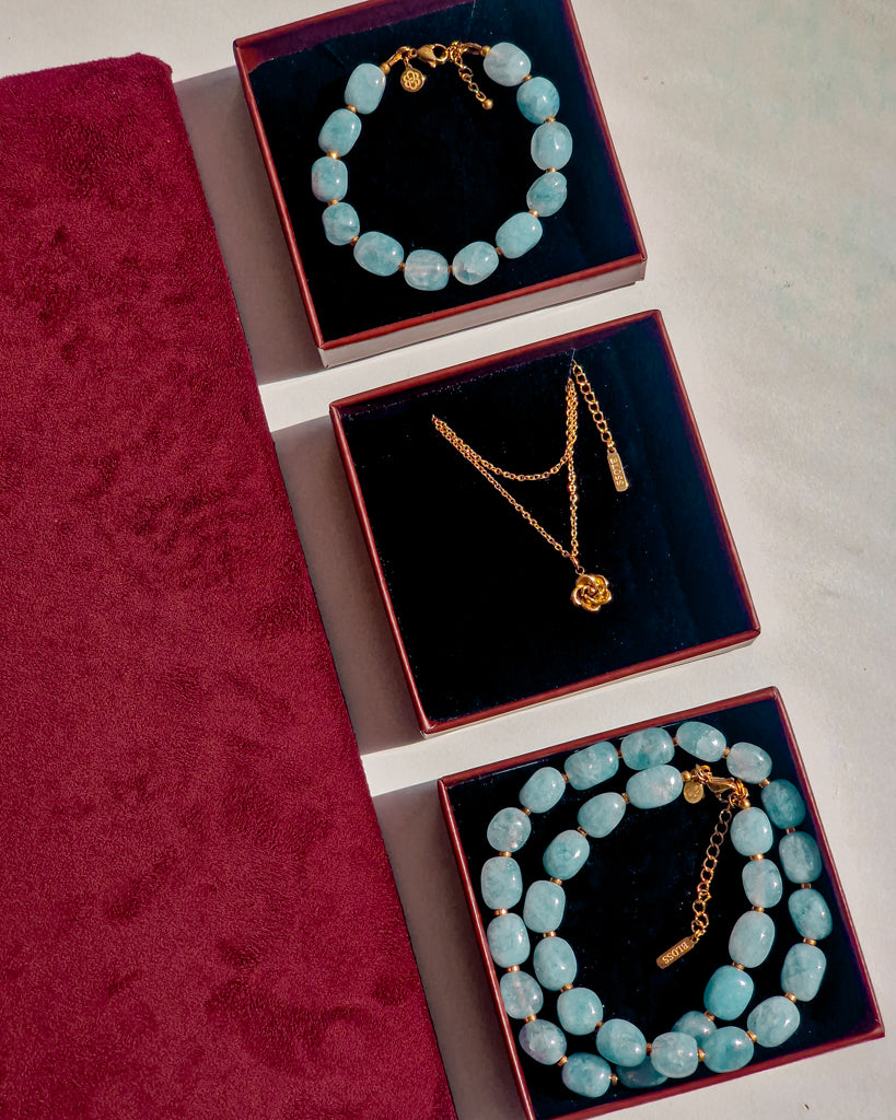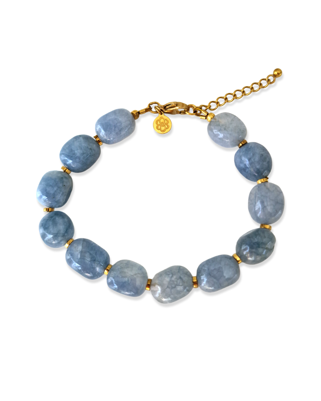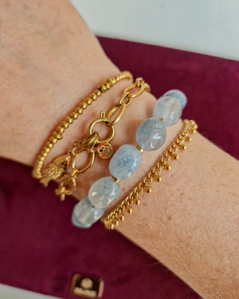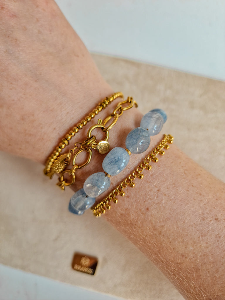 Zachtblauw, rustig en krachtig tegelijk, deze armband is er eentje die je zonder twijfel elke dag omdoet. De gladde stenen geven ‘m een natuurlijke feel, terwijl het goud subtiel opvalt.
