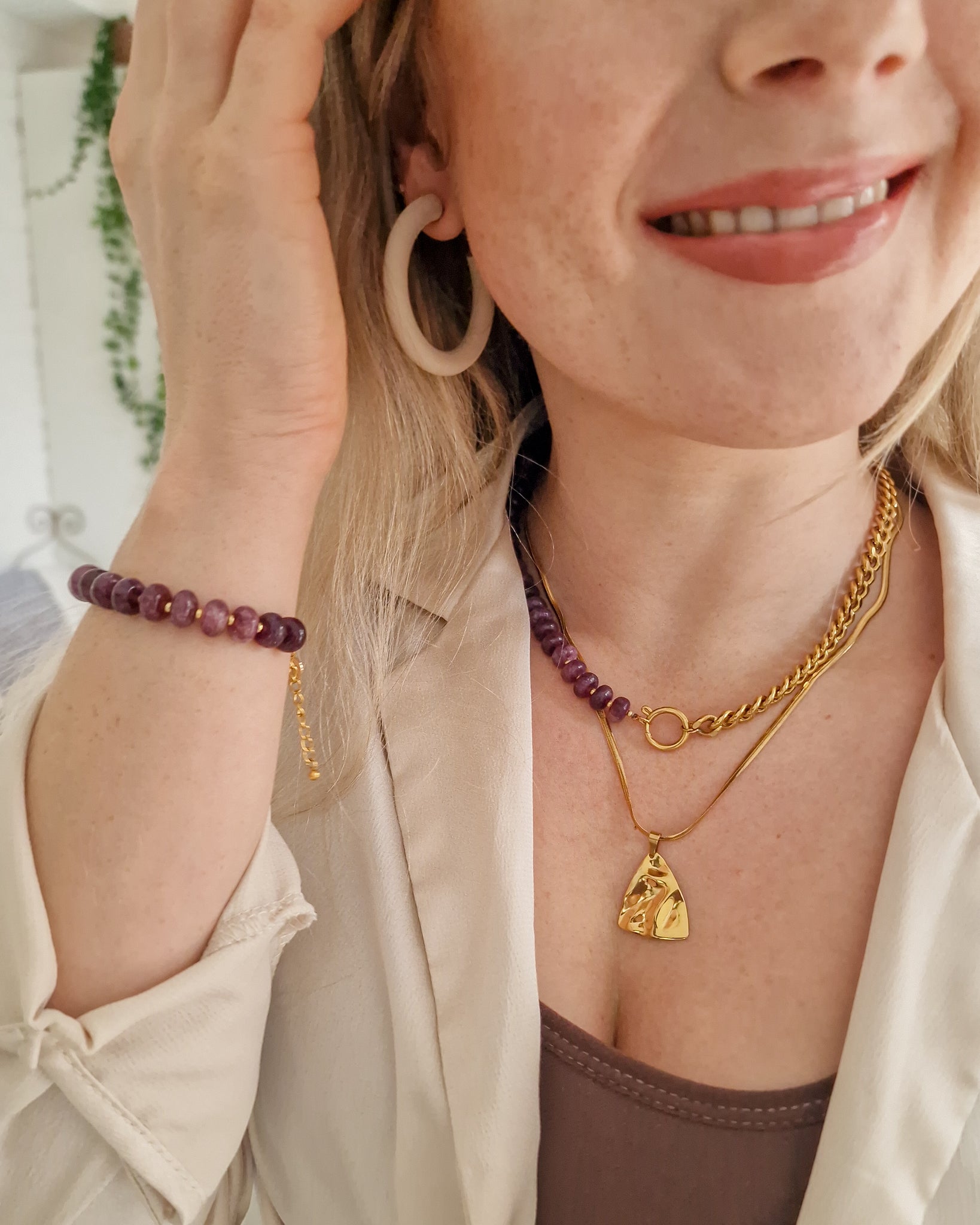 Een diepe paarse pracht: onze Plum Berry armband! Gemaakt van hoogwaardige paarse chalcedoon kralen, elke kraal is een uniek kunstwerk op zich. De armband is met liefde met de hand gemaakt in Nederland en voorzien van duurzaam roestvrij staal dat zijn glans behoudt. Voeg een vleugje kleur en elegantie toe aan elke outfit met deze schitterende armband!