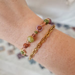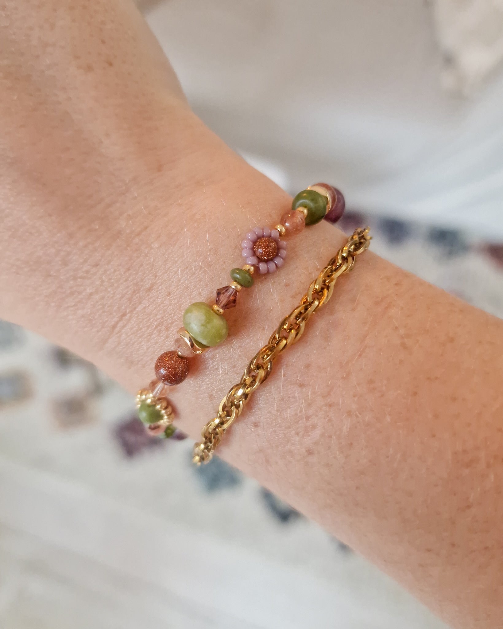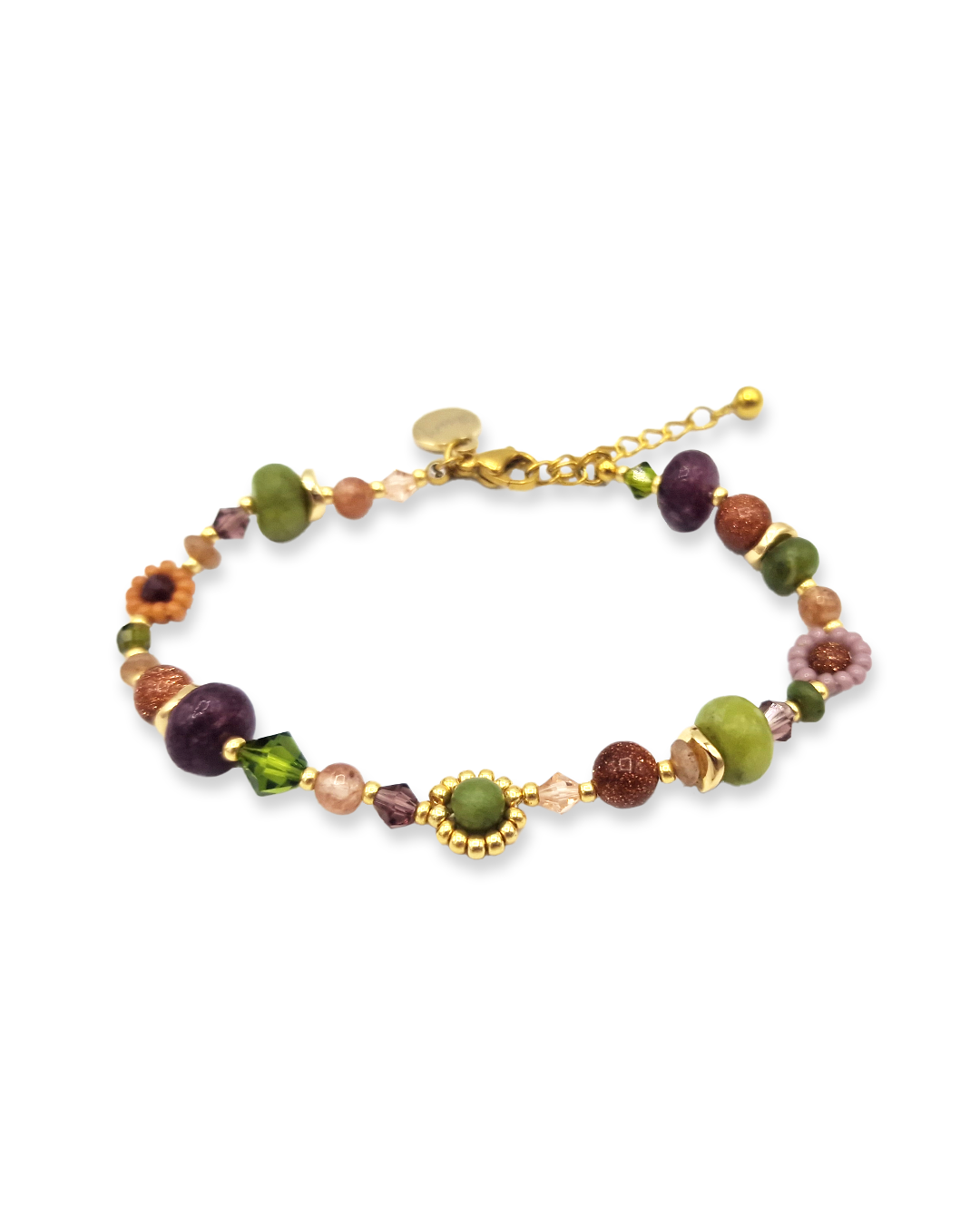 Met zijn rijke combinatie van dieppaarse, olijfgroene, sunstone bruine, lichtpaarse, donkergroene, roze en gouden kralen, is deze armband een ware blikvanger. Elk stuk is met de hand gemaakt in Nederland en voorzien van duurzaam stainless steel, waardoor je verzekerd bent van een uniek en kwalitatief sieraad dat niet zal verkleuren.