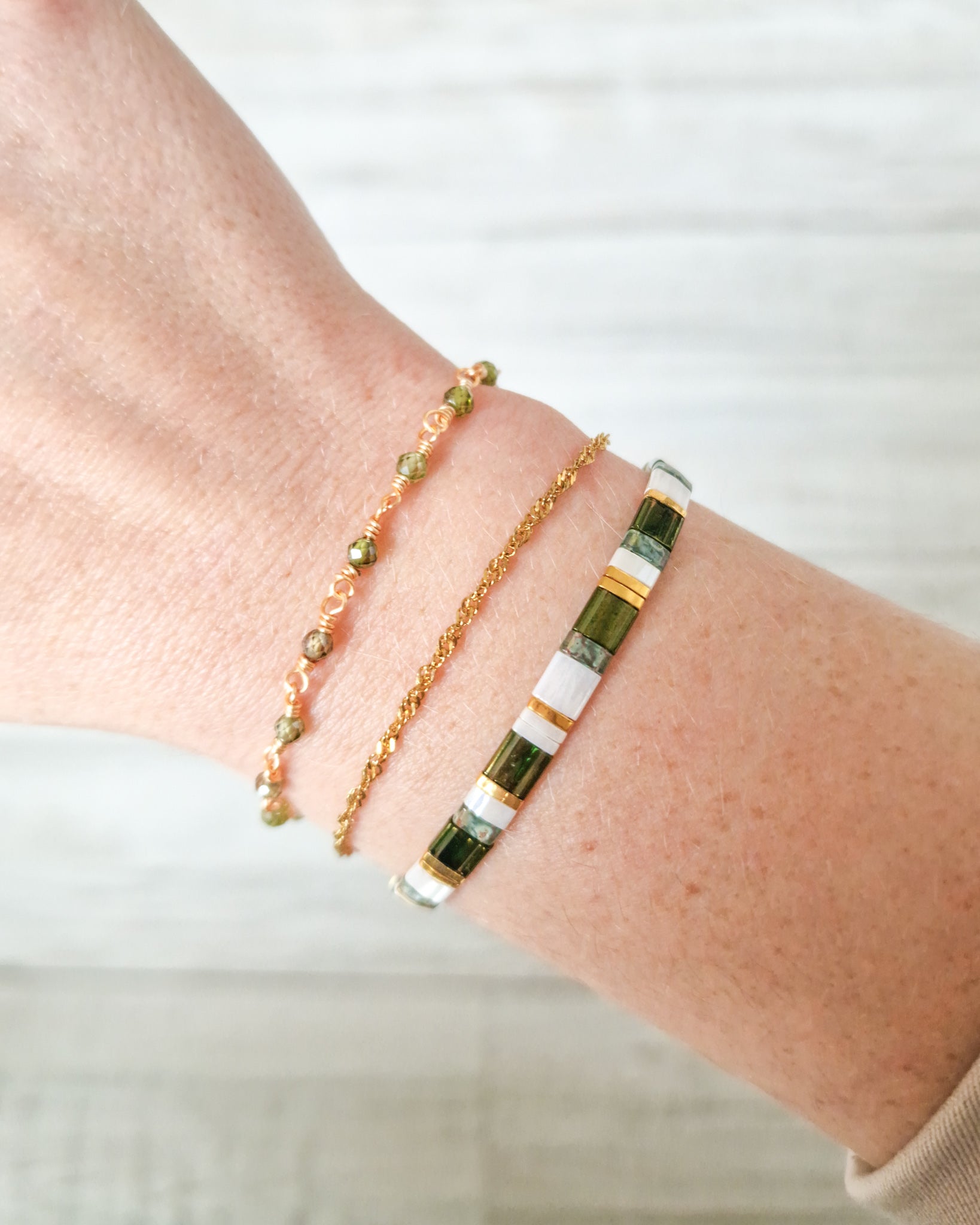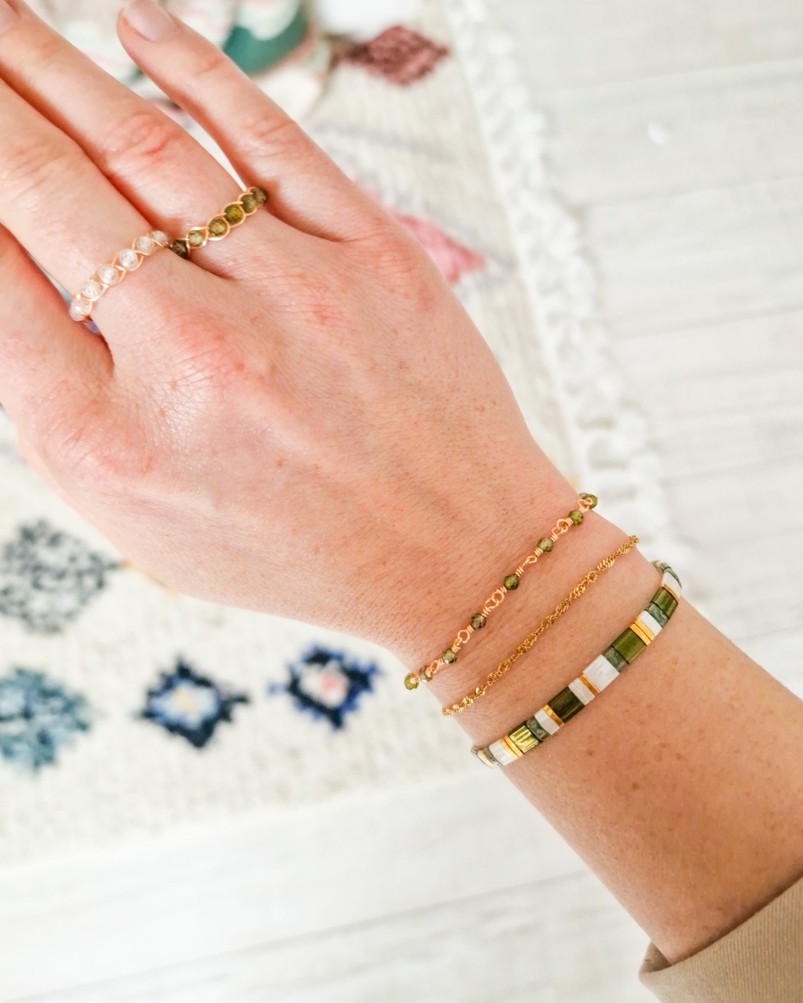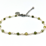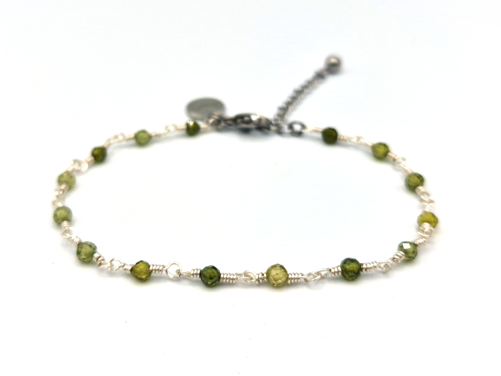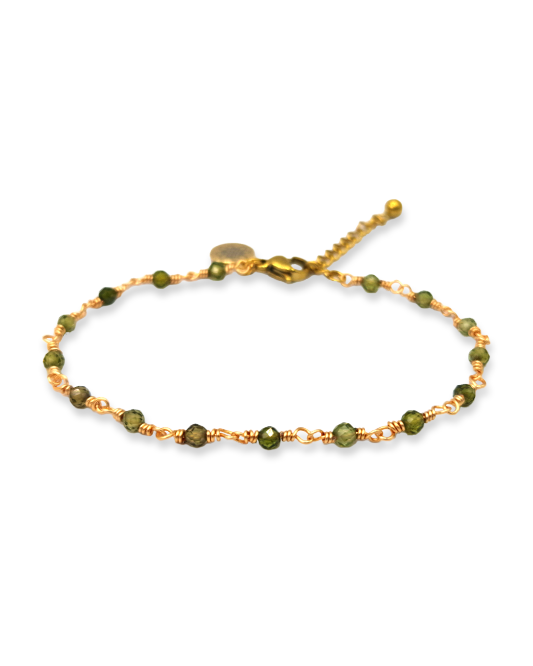 Wire-wrapped armbandje met half-edelsteen Peridot kraaltjes. Deze kraaltjes zijn facet geslepen waardoor ze een subtiele shimmer hebben. Verkrijgbaar in zilver en goud.