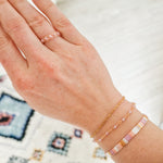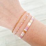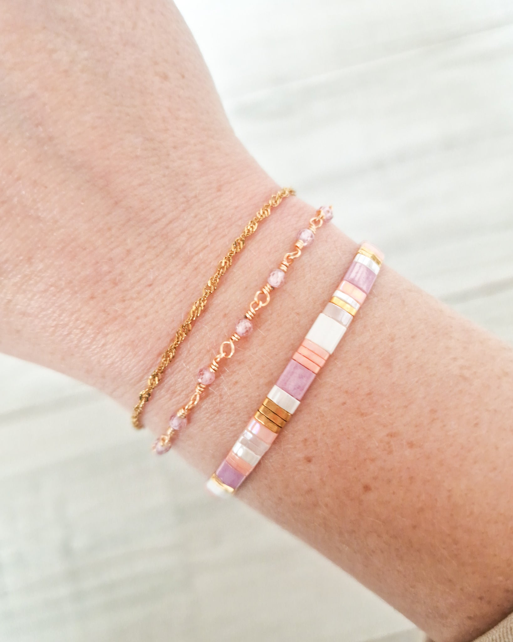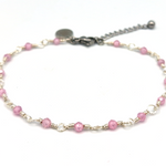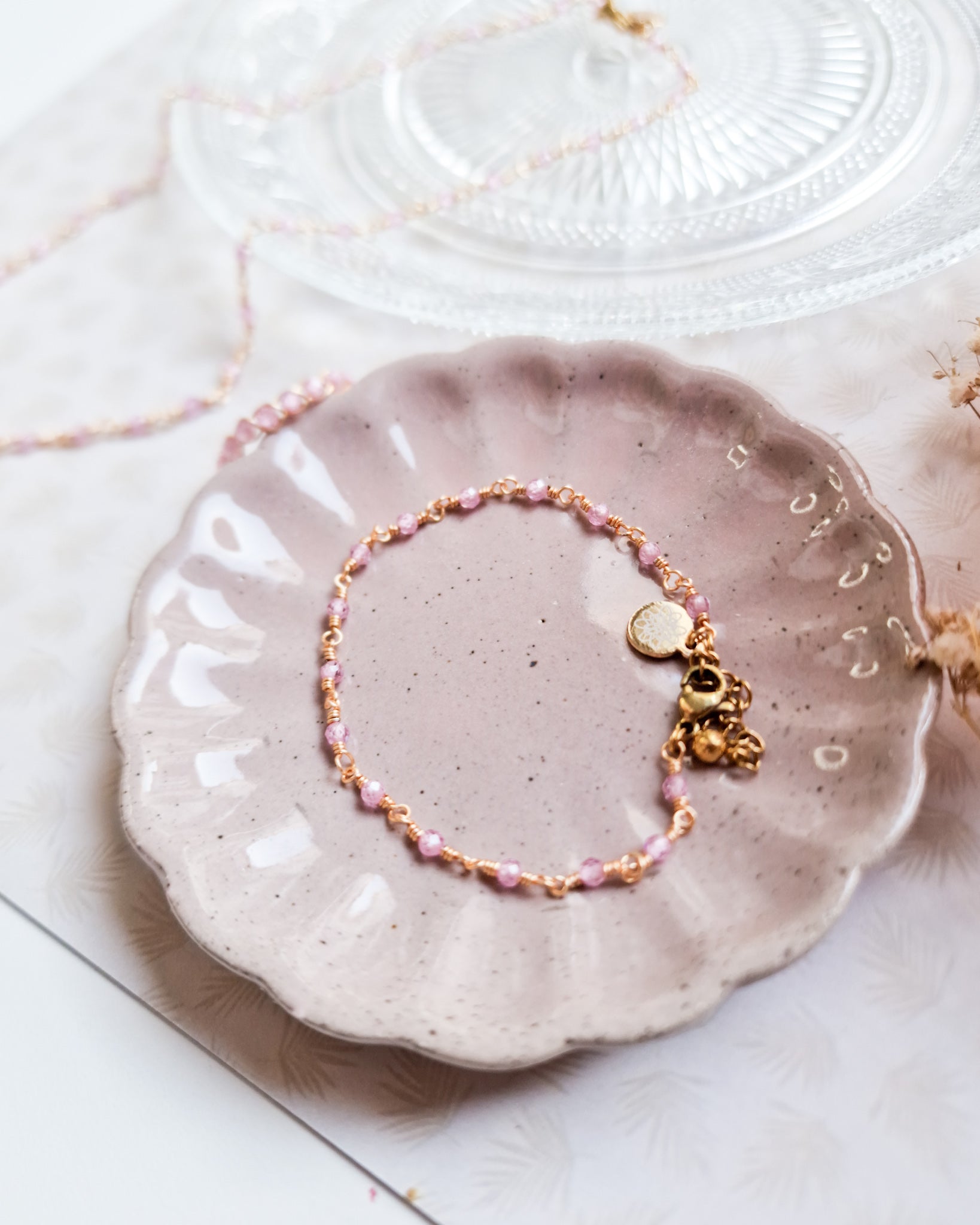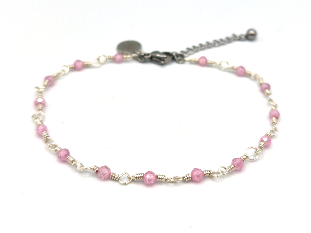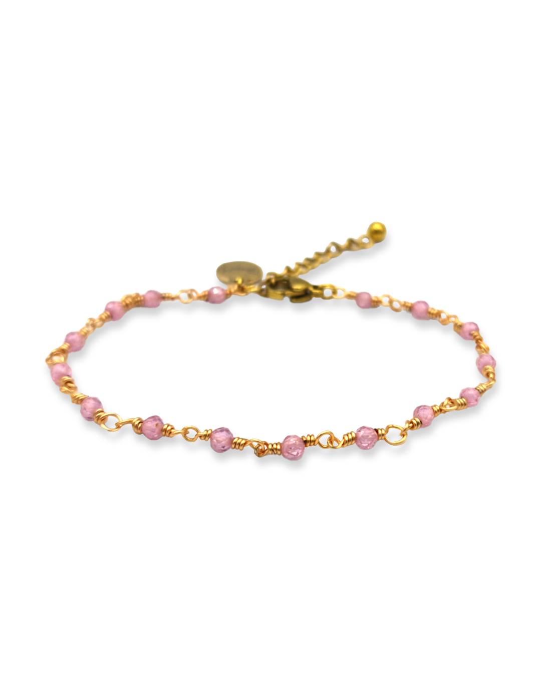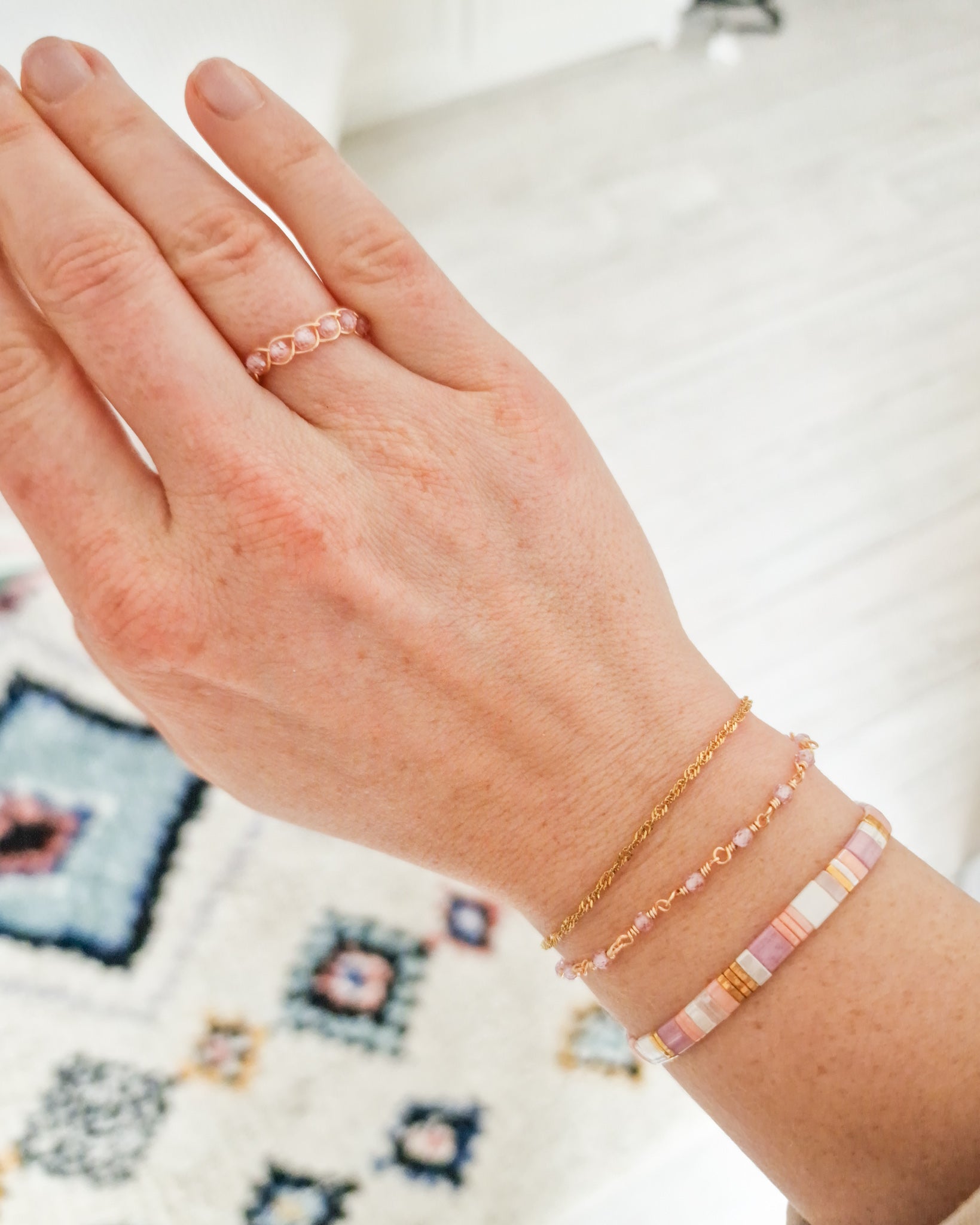 Wire-wrapped armbandje met half-edelsteen Rose quartz kraaltjes. Deze kraaltjes zijn facet geslepen waardoor ze een subtiele shimmer hebben. Verkrijgbaar in zilver en goud.