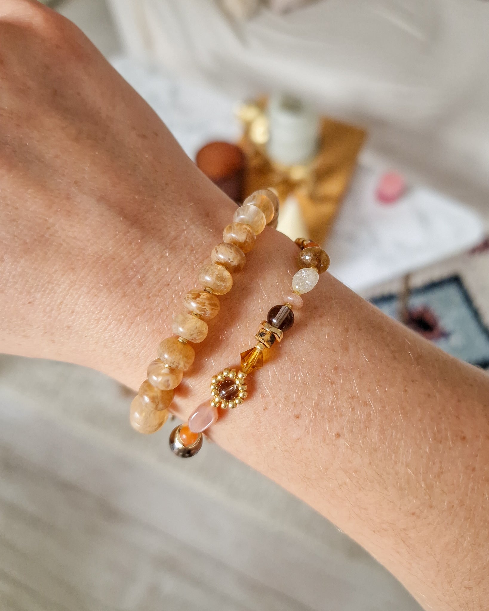 De zonovergoten tinten van onze Sunkissed Beige armband! Gemaakt van prachtige amber chalcedoon kralen en duurzaam stainless steel, straalt deze armband een tijdloze elegantie uit. Elk stuk is met liefde met de hand gemaakt in Nederland, waardoor je verzekerd bent van een uniek en kwalitatief sieraad dat niet zal verkleuren.