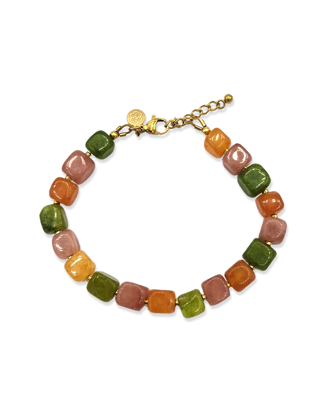 Een mix van warme, aardse tinten die direct doen denken aan zwoele zomeravonden. De Warm Summer Nights armband is gemaakt van vierkante natuurlijke chalcedoon natuursteen kralen in rijke tonen van groen, abrikoos en rozenhout. De speelse vorm en subtiele gouden details maken dit sieraad een veelzijdige toevoeging aan je collectie. Draag hem solo of combineer met andere armbanden voor een moeiteloos gelaagde look.