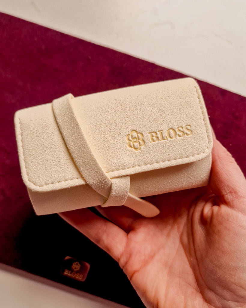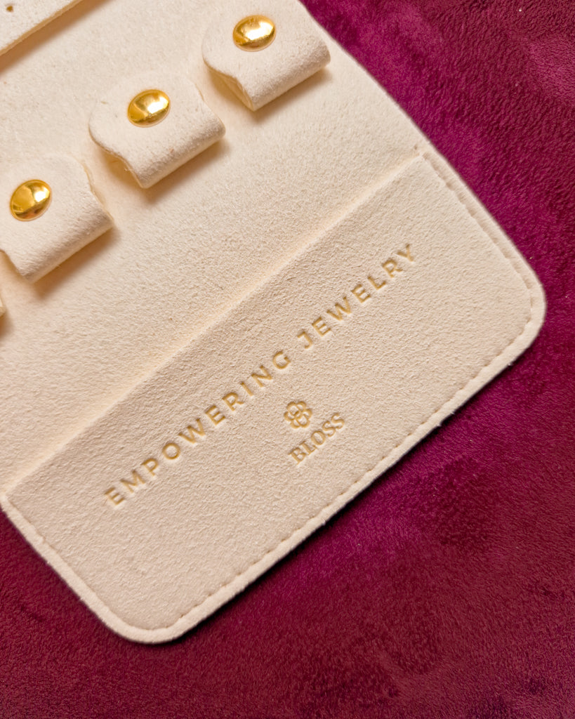 Dankzij meerdere vakjes blijven je kettingen, armbanden, ringen en oorbellen perfect op hun plek – zonder klitten of krassen. De buitenkant is bedrukt met het BLOSS logo en binnenin vind je onze empowering message: Empowering Jewelry.