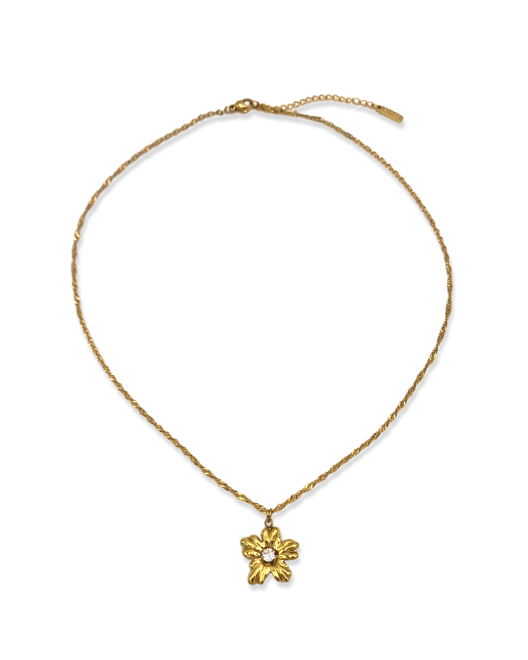 Een vleugje speelsheid met een sprankelende touch! De Flower Pendant ketting heeft een verfijnde twisted chain met een gedetailleerde bloemenhanger, afgewerkt met een fonkelende zirkonia steen in het midden. Perfect om solo te dragen voor een subtiele, elegante look of te combineren met andere kettingen voor een moeiteloos gelaagd effect. Stijlvol, vrolijk en altijd passend!