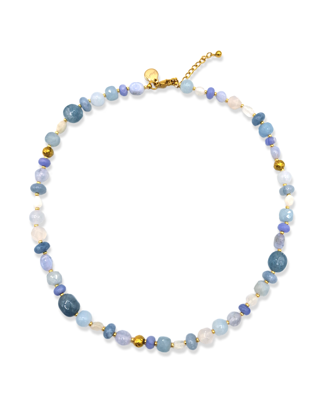 Ketting met natuursteen kralen en kleine glaskralen in verschillende blauwe kleuren