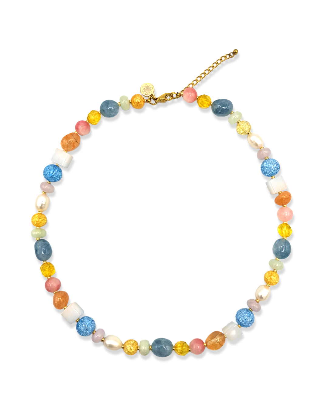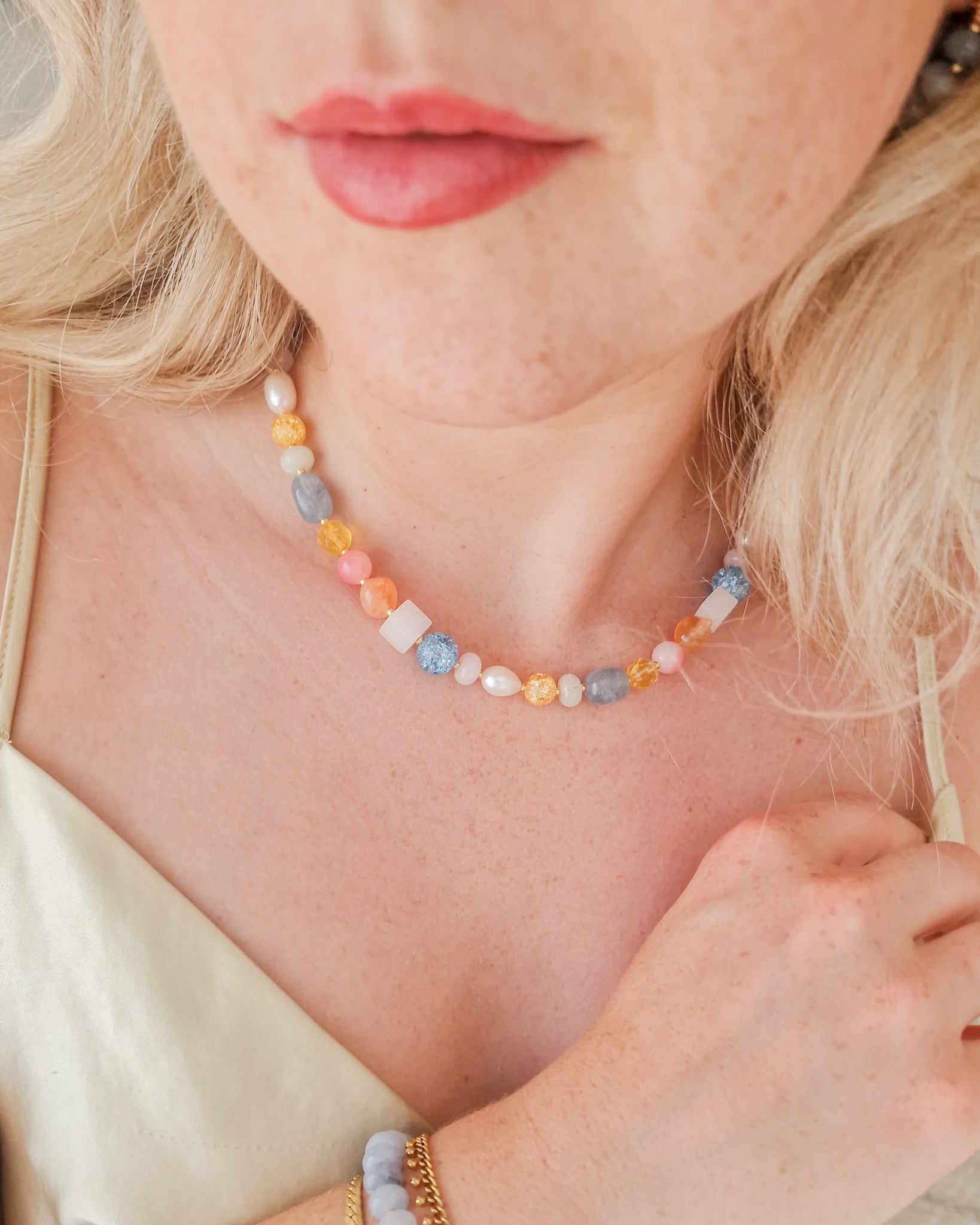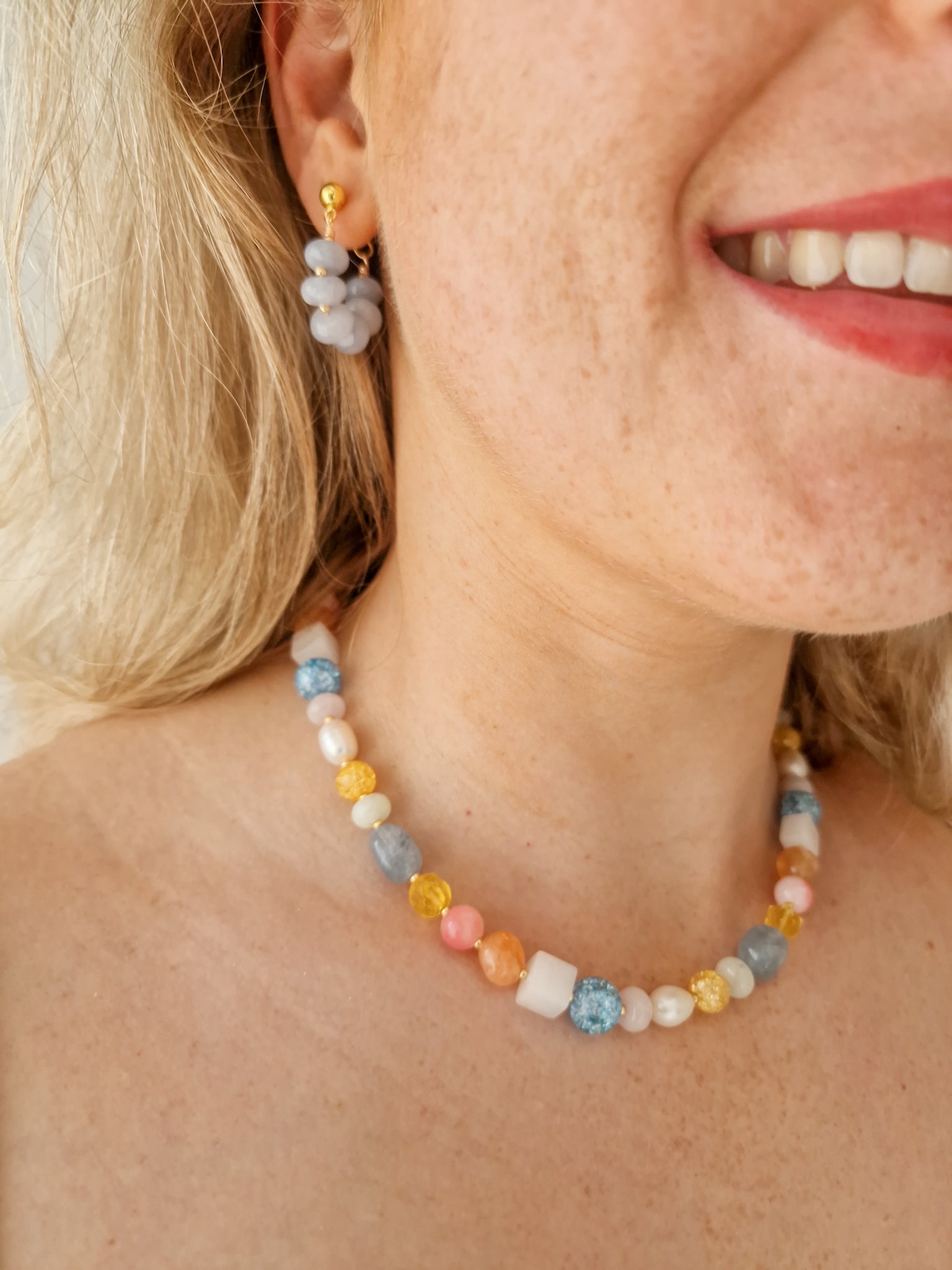 Ketting met natuursteen kralen en kleine glaskralen in verschillende blauwe kleuren