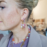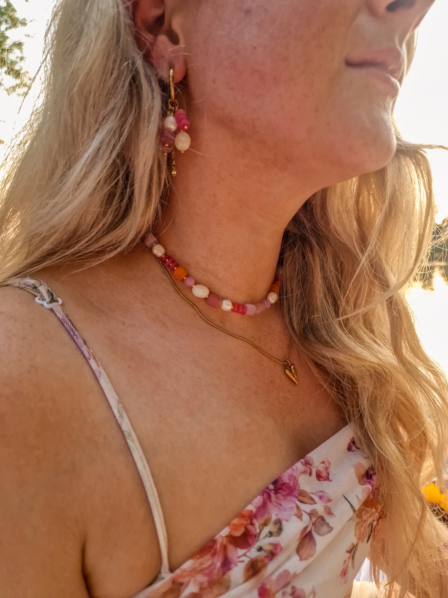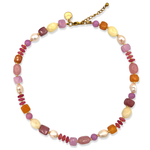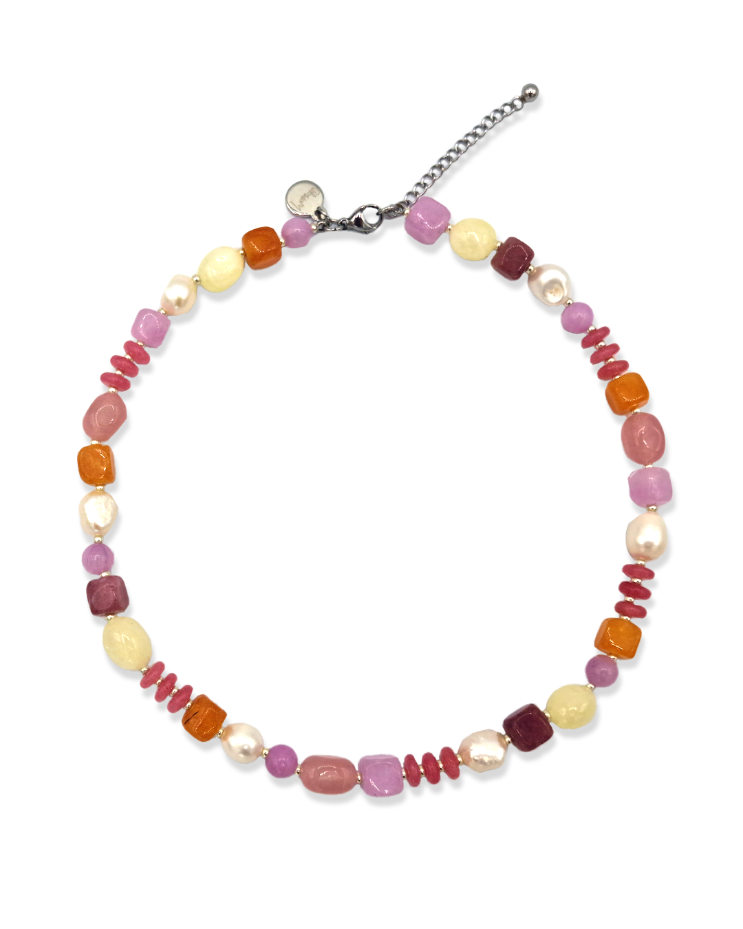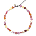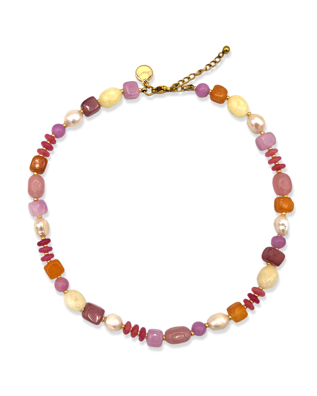 Ketting met natuursteen kralen en kleine glaskralen in verschillende pastel roze en gele kleuren.