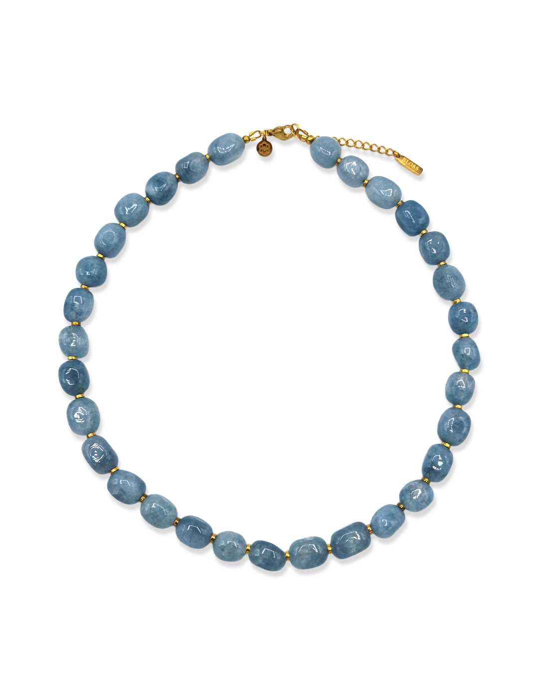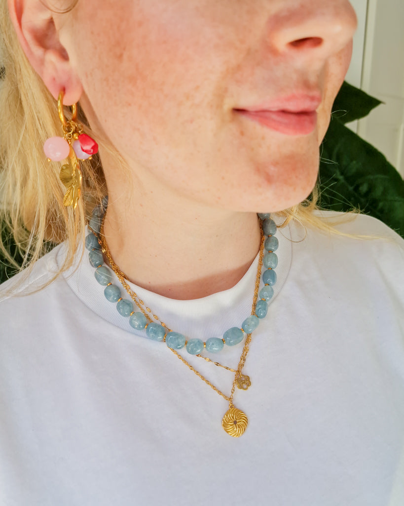Zachtblauw, sterk statement. De Light Blue Stone ketting is gemaakt van natuurlijke chalcedoon kralen in een frisse, luchtige tint die meteen opvalt. De organisch gevormde kralen geven ‘m een stoere edge, terwijl de gouden accenten zorgen voor een verfijnde touch. Draag ‘m solo voor een rustige power look of combineer met andere kettingen voor een kleurrijke layering. Clean, cool & confident, net als jij.