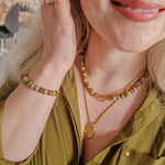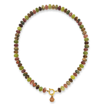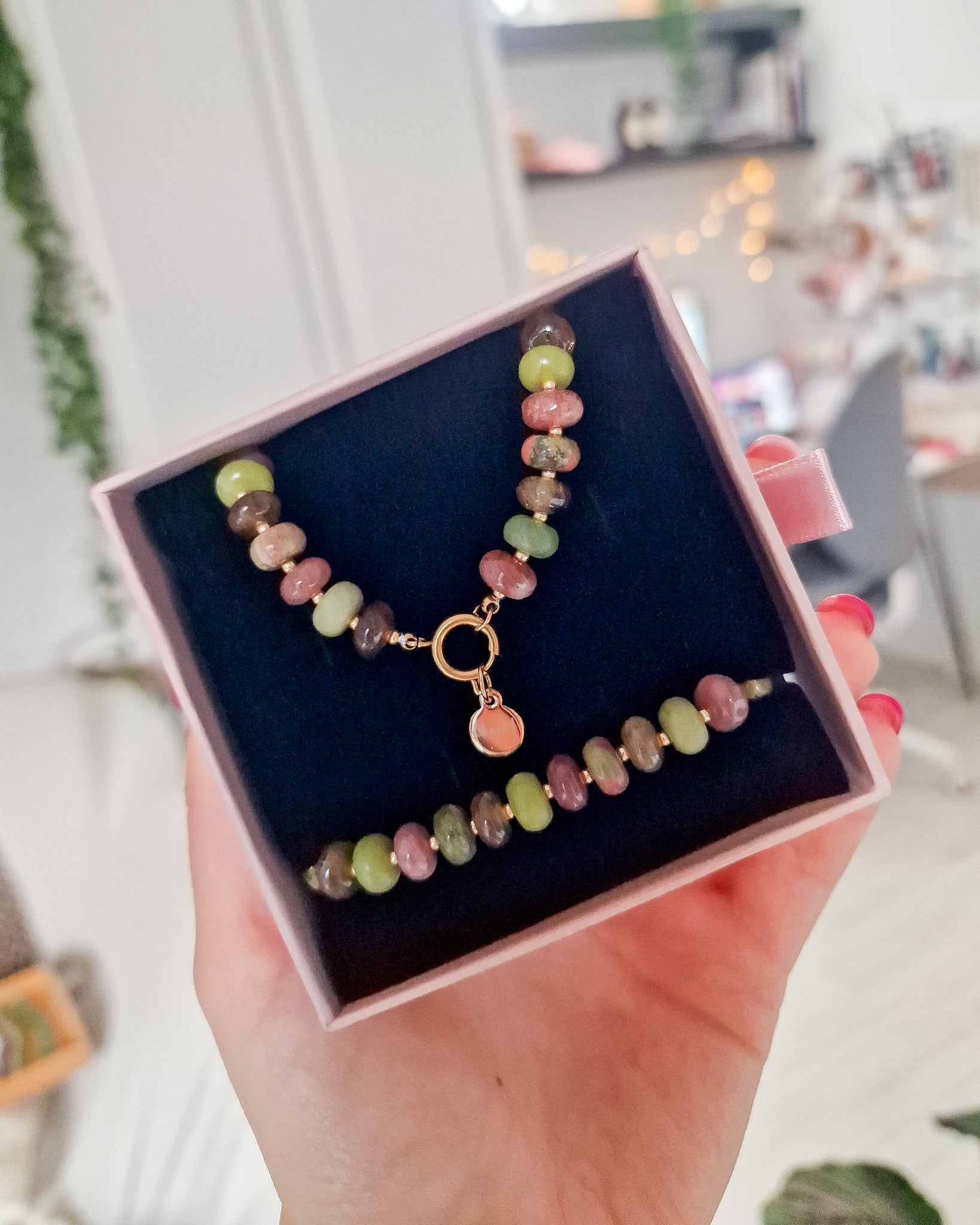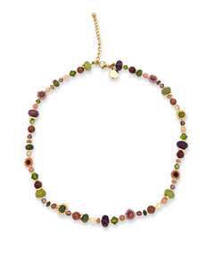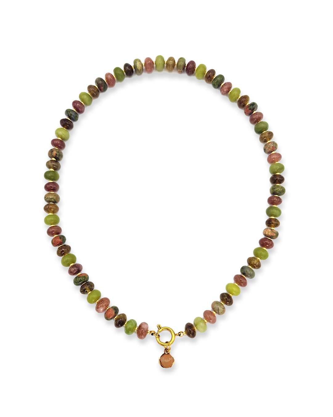 Laat jezelf betoveren door de levendige kleuren van onze Pink Moss ketting! Deze prachtige ketting is gemaakt van een mix van natuursteen kralen in verschillende tinten oud roze, donkerbruin, olijfgroen en gemêleerd roze en groen. Elk stuk is met de hand gemaakt in Nederland en voorzien van een handig 10mm slot voor hangers. Voeg een speelse twist toe aan je look met deze unieke ketting!