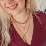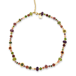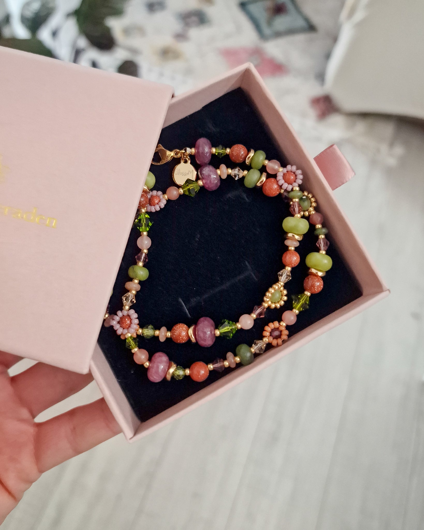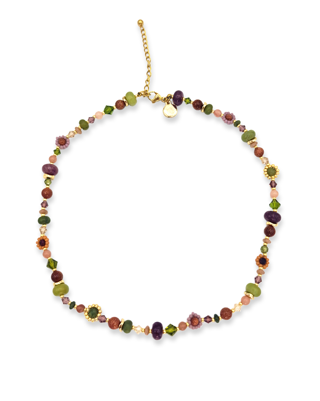 Een weelderige combinatie van dieppaarse, olijfgroene, sunstone bruine, lichtpaarse, donkergroene, roze en gouden kralen, deze ketting is een waar kunstwerk. Met handgemaakte bloemdetails en hoogwaardig stainless steel, is dit stuk perfect voor degenen die houden van een vleugje luxe. Elk stuk is met zorg met de hand gemaakt in Nederland voor een unieke en onvergetelijke uitstraling!