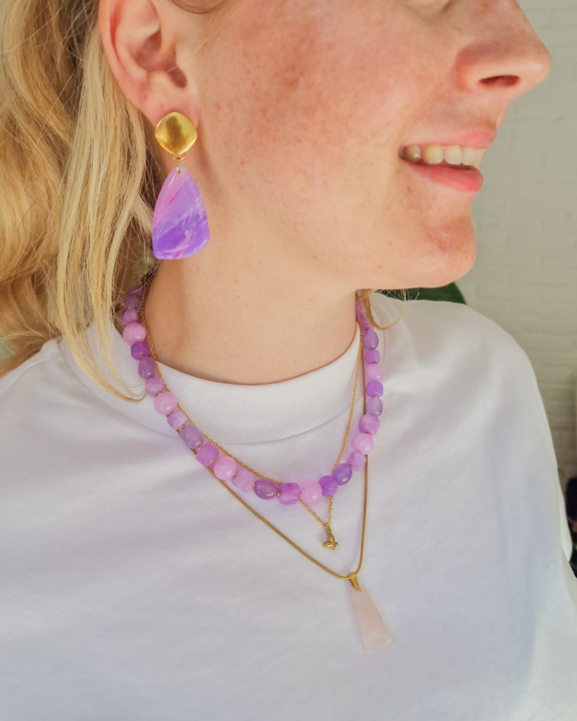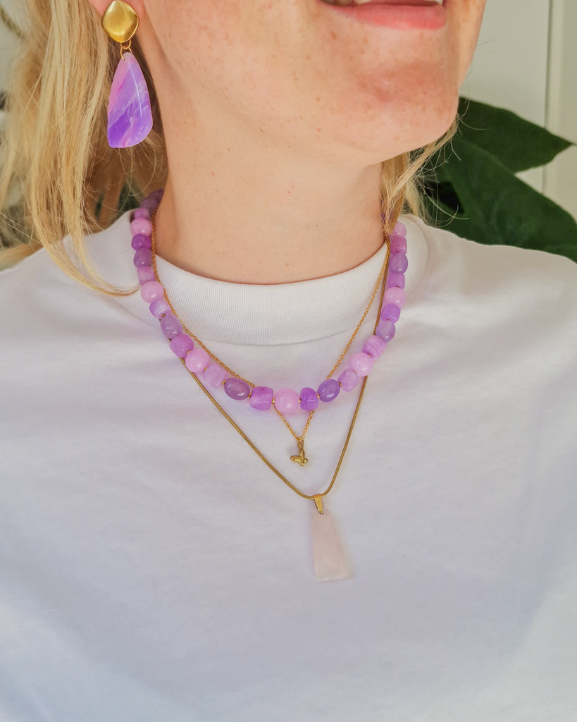 All shades of power. De Purple Mix Stone ketting combineert ronde en vierkante chalcedoon kralen in tinten lavendel, lila en violet, voor een speelse, maar elegante look. De afwisseling in vorm en kleur geeft deze ketting een eigenwijze twist, terwijl de gouden details zorgen voor een chique finish. Draag ‘m solo voor impact of mix ‘m met andere kettingen voor een bold BLOSS-statement.