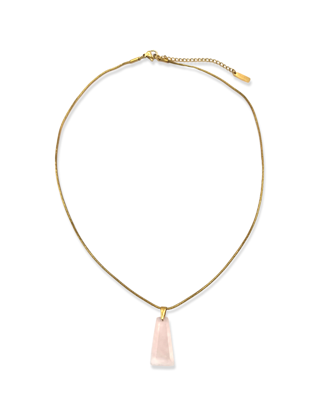 Zacht, tijdloos en verfijnd. De Rose Quartz Pendant ketting combineert een elegante gouden ketting met een subtiele rozenkwarts hanger in een strakke, taps toelopende vorm. De delicate roze tint voegt een frisse, vrouwelijke touch toe aan elke look. Perfect om solo te dragen voor een minimalistische uitstraling of te combineren met andere kettingen voor een gelaagd effect.