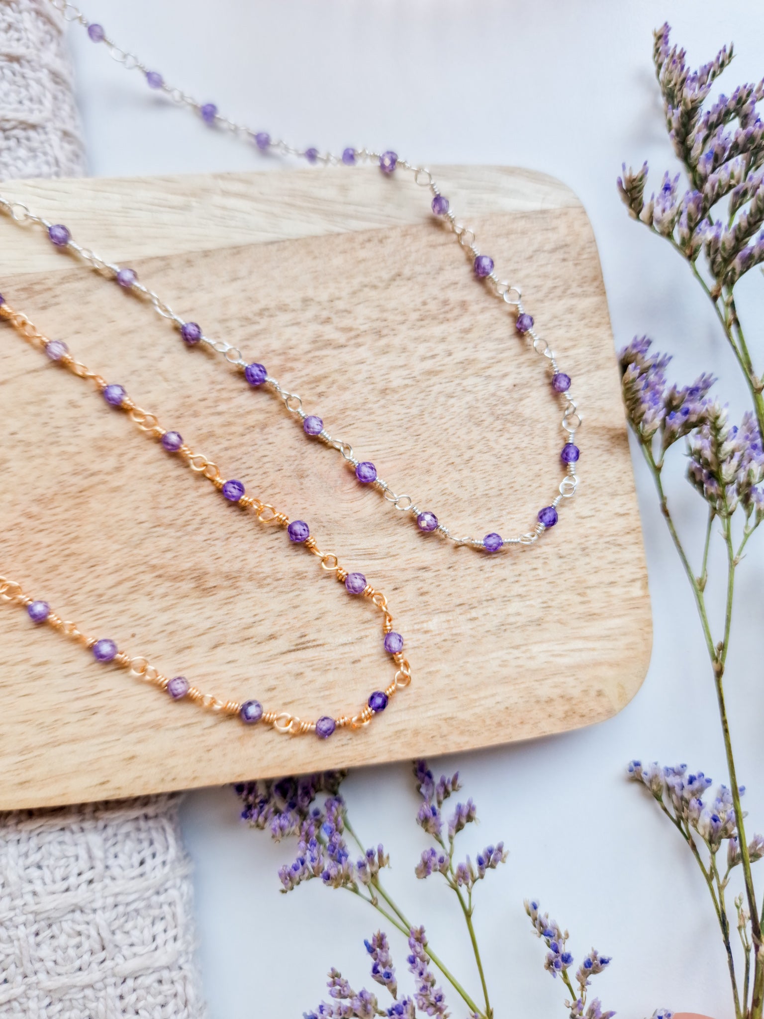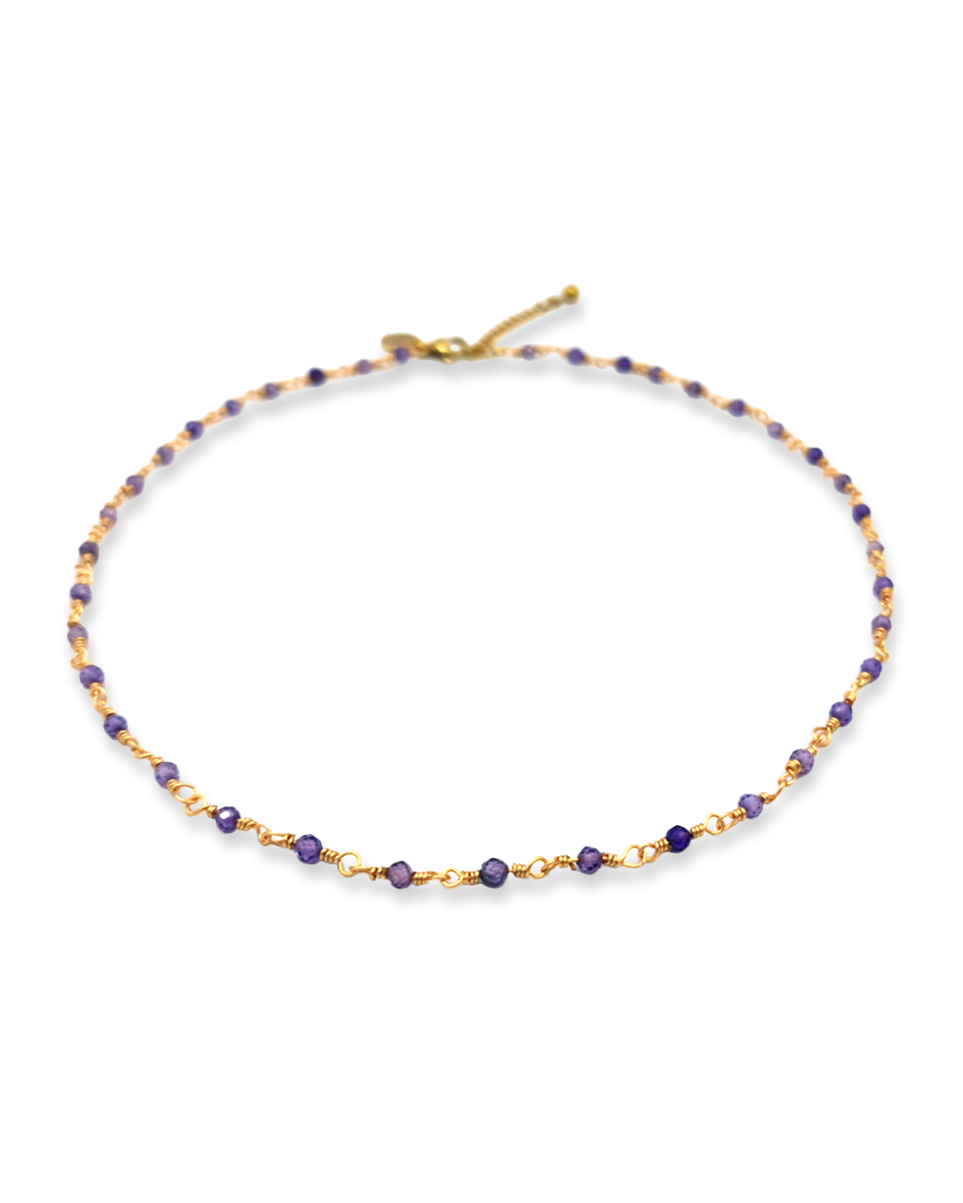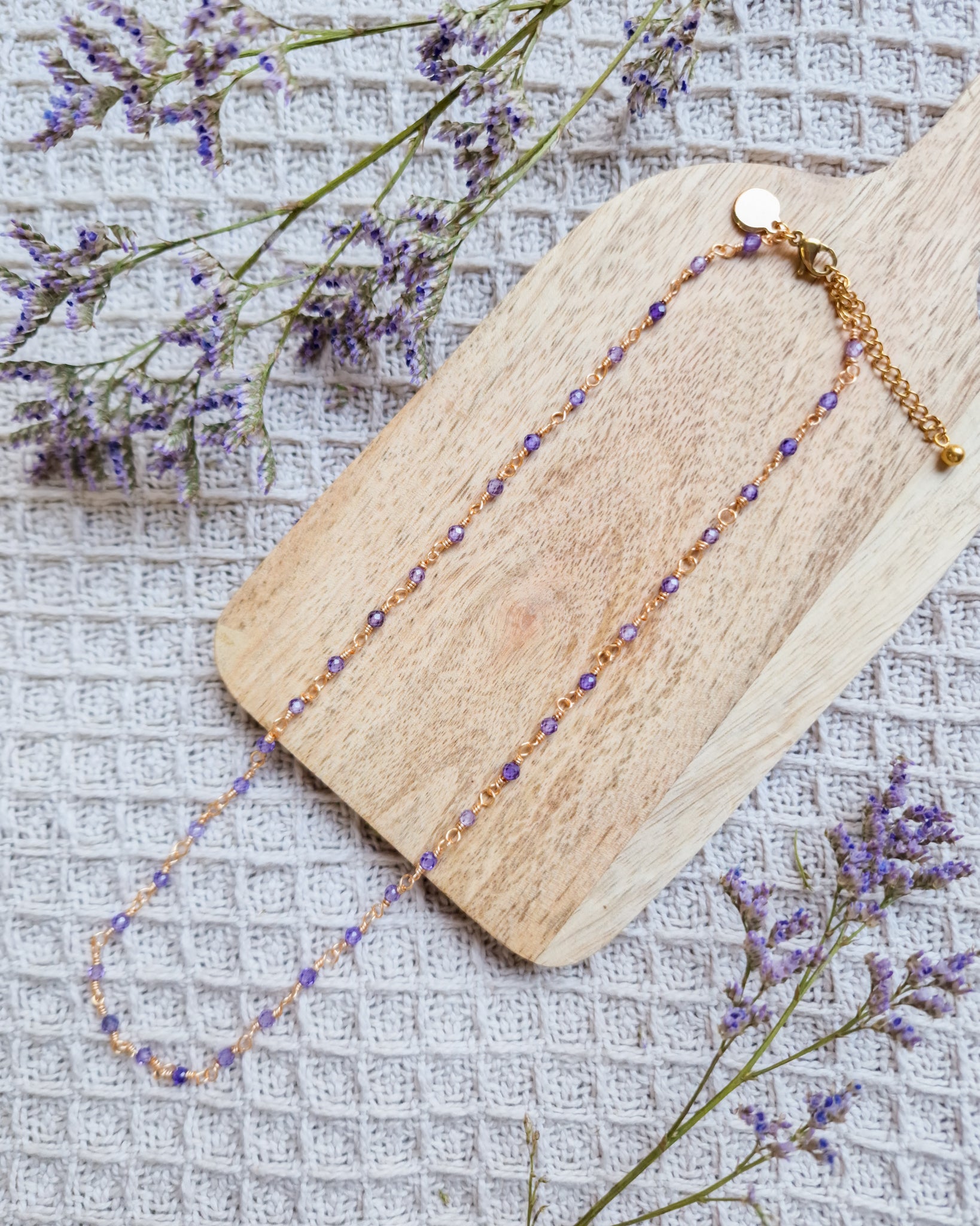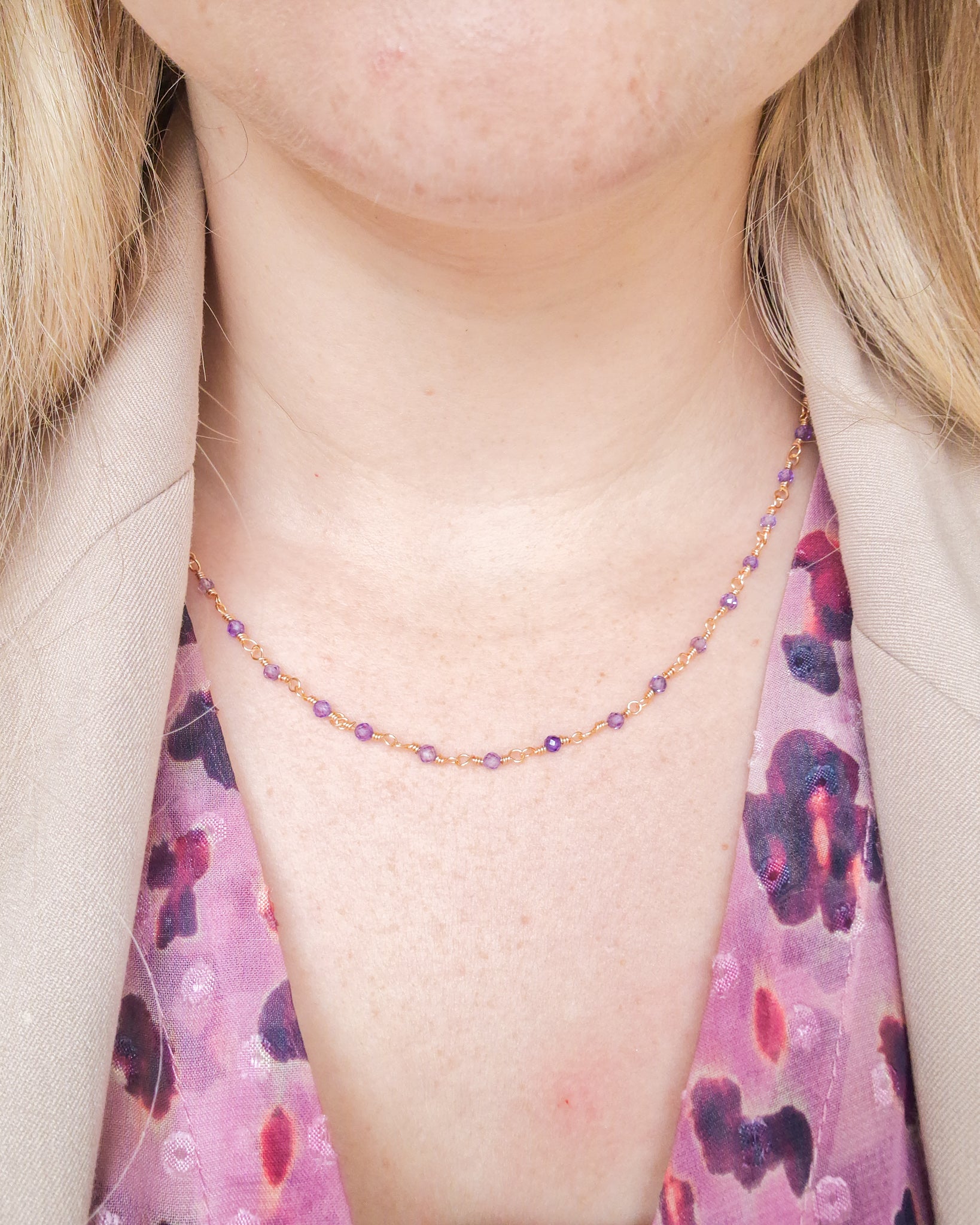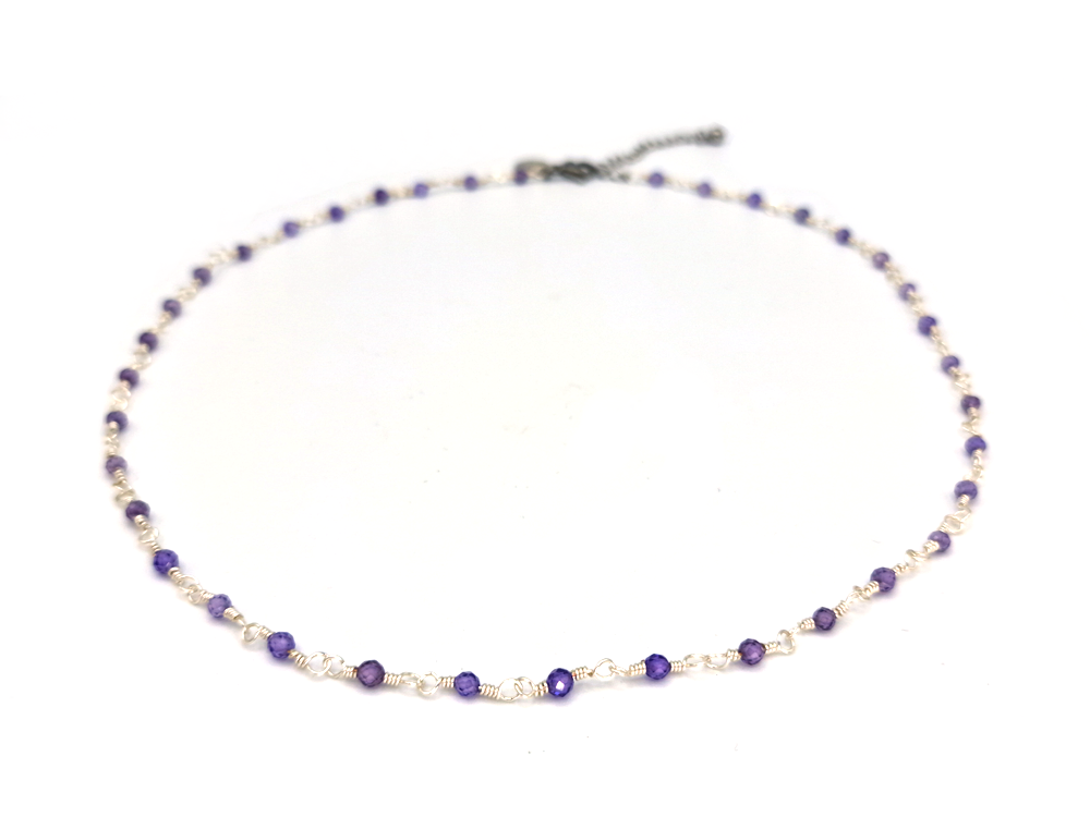 Wire-wrapped ketting met natuursteen Amethyst kraaltjes. Deze kraaltjes zijn facet geslepen waardoor ze een subtiele shimmer hebben.