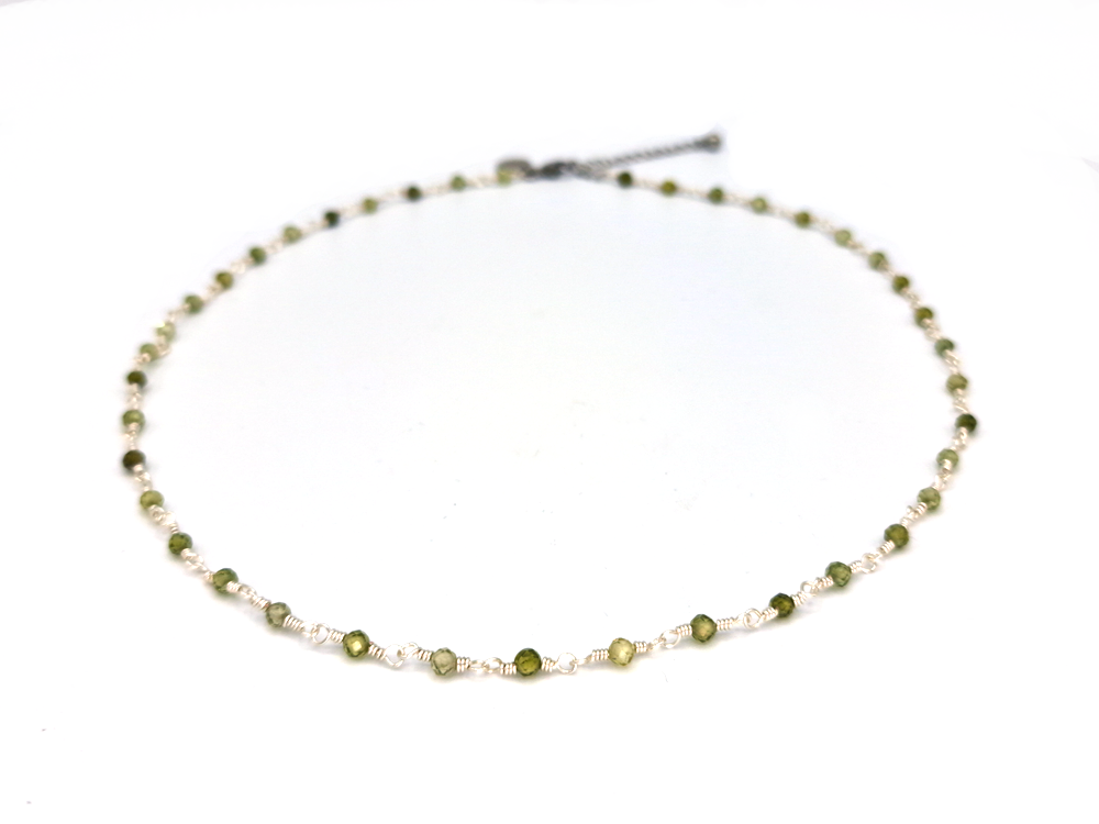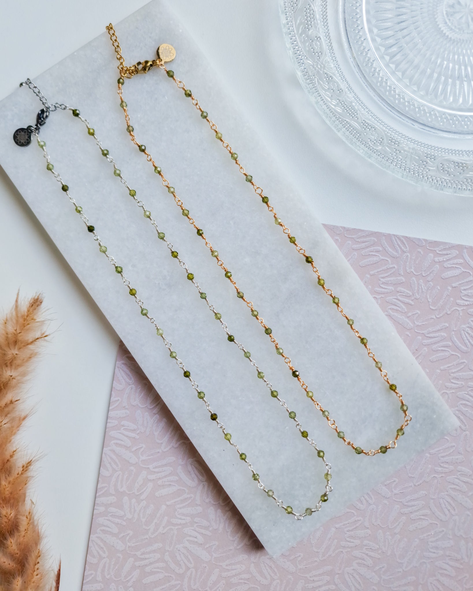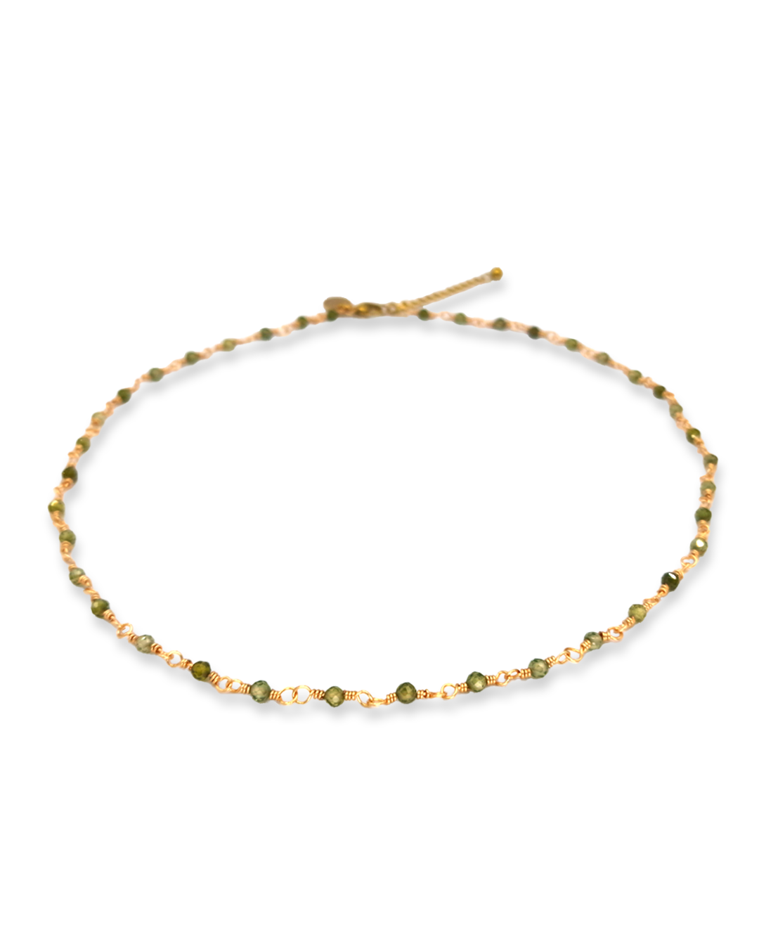 Wire-wrapped ketting met natuursteen Peridot groene kraaltjes. Deze kraaltjes zijn facet geslepen waardoor ze een subtiele shimmer hebben.