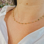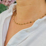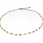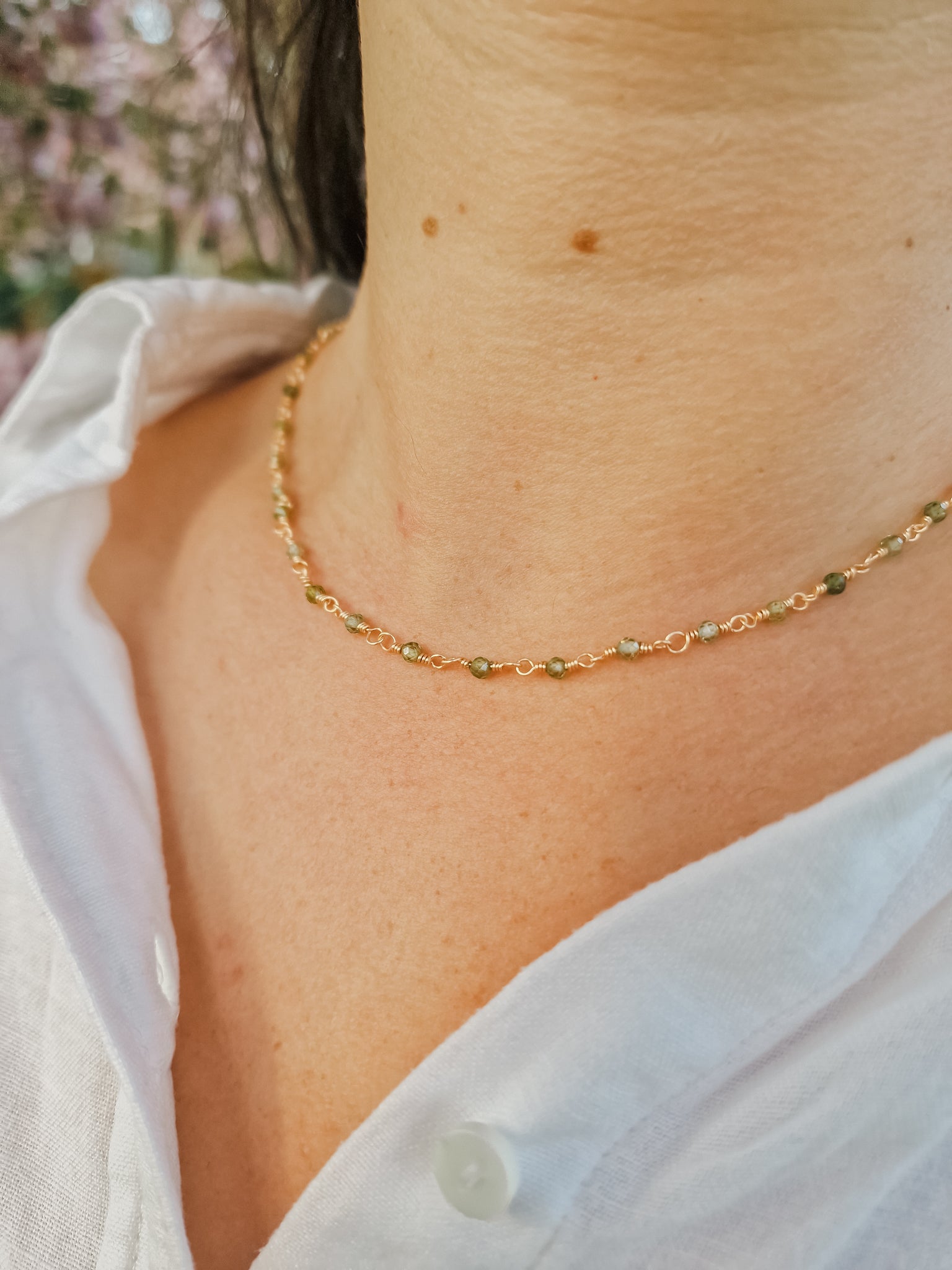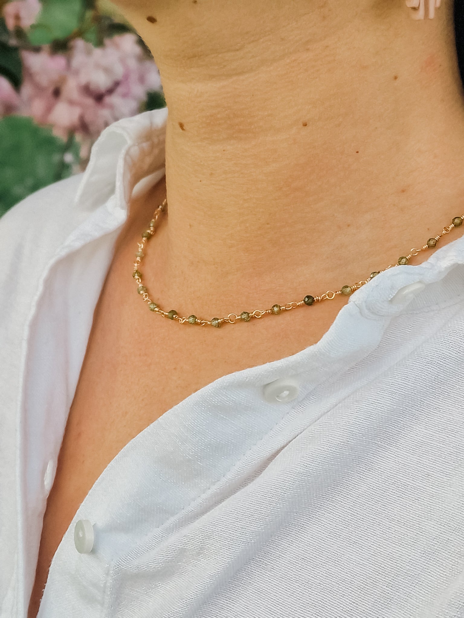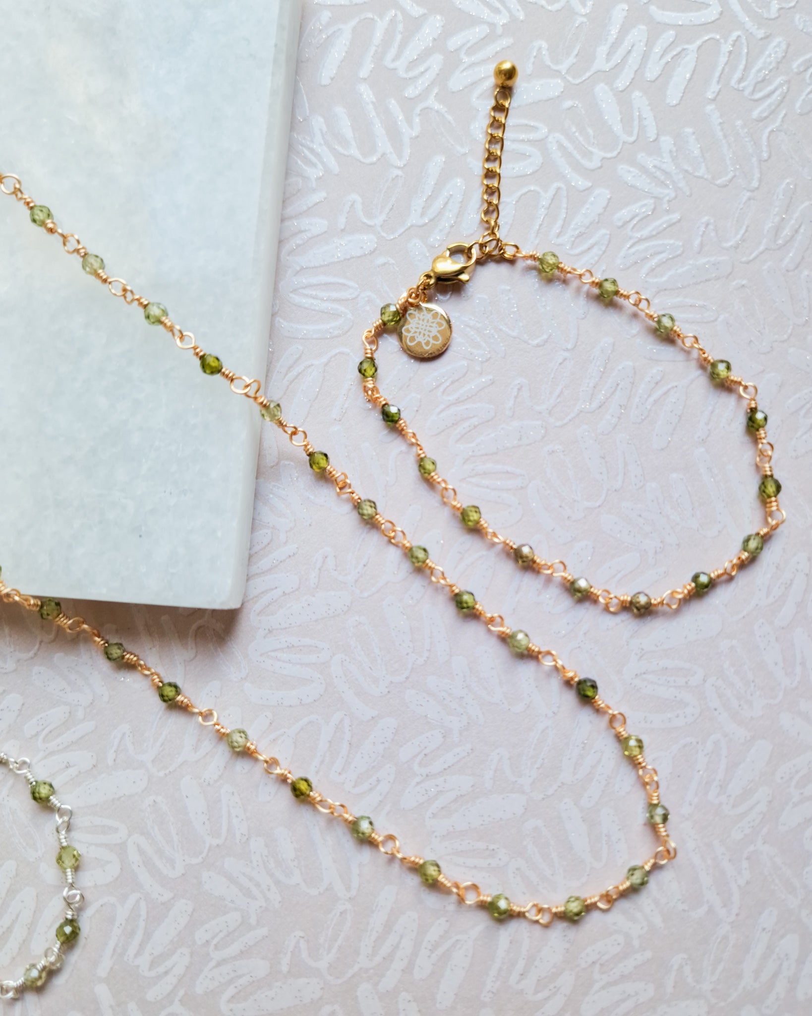 Wire-wrapped ketting met natuursteen Peridot groene kraaltjes. Deze kraaltjes zijn facet geslepen waardoor ze een subtiele shimmer hebben.