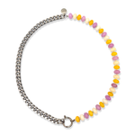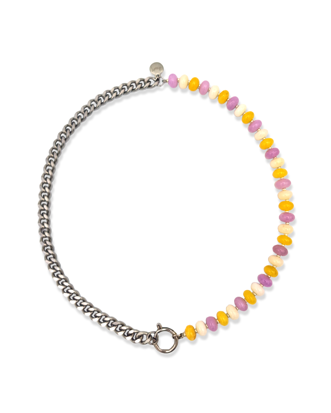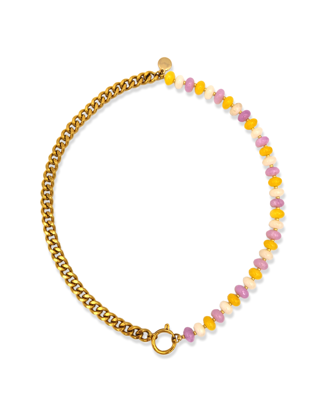 Ketting met natuursteen kralen en kleine glaskralen in lila, geel en crème kleur.