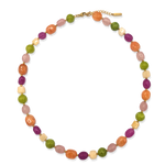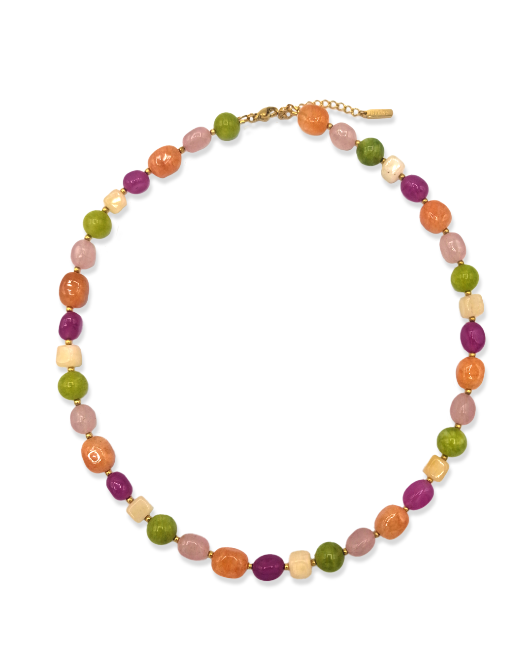 Klaar voor kleur? De Summer Vibes ketting is een speelse mix van chunky chalcedoon kralen in frisgroen, abrikoos, roze, paars en butter yellow. Elke kraal heeft zijn eigen vorm en glans, waardoor geen ketting exact hetzelfde is. Perfect om je look een vrolijke, zelfverzekerde boost te geven, of je nu naar het strand gaat of naar een feestje. Bold, kleurrijk en puur BLOSS.