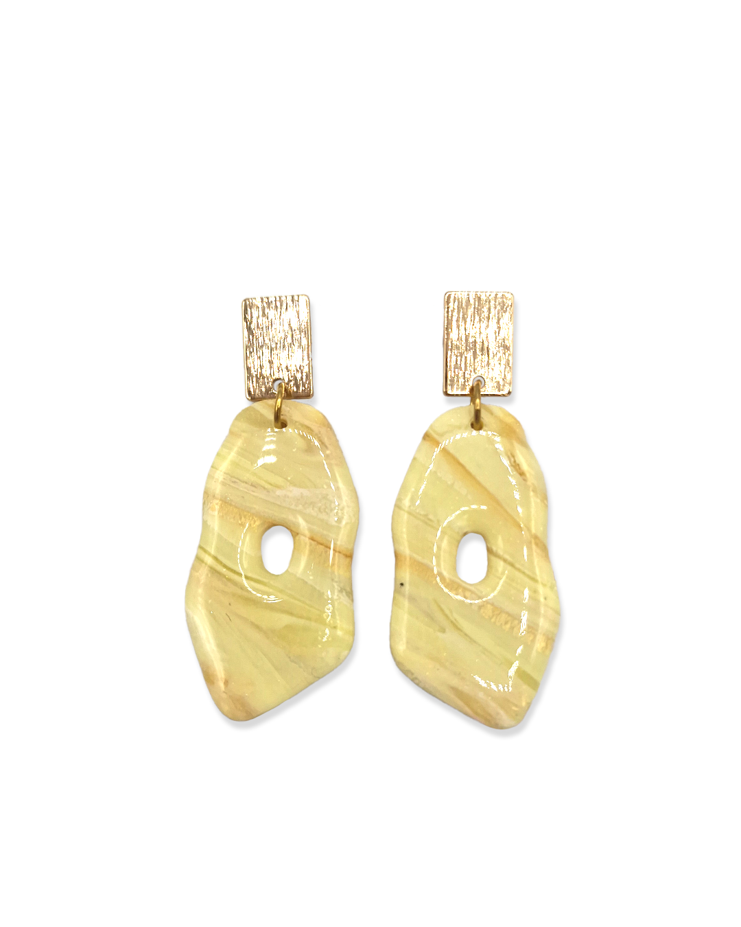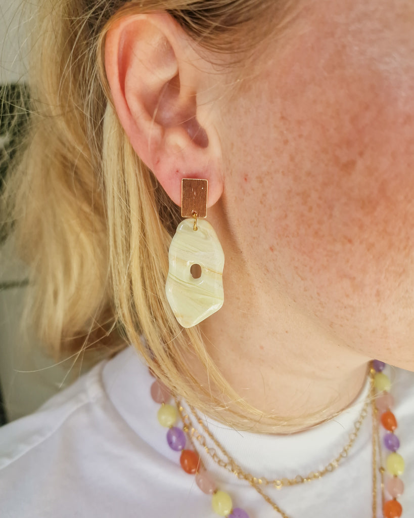 Organisch, speels en vol karakter. De Yellow Stone Organic oorbellen hebben een unieke, asymmetrische vorm in zachte marmer-achtige butter yellow tinten, bevestigd aan een stoer rechthoekig stekertje met structuur. Licht van gewicht, maar groots in uitstraling. Perfect voor wie durft, en graag haar eigen stijl bepaalt. Bold & effortless, precies wat BLOSS wil zijn.