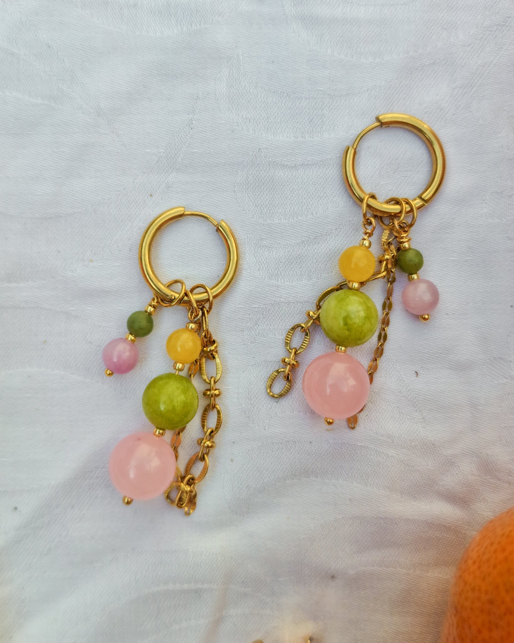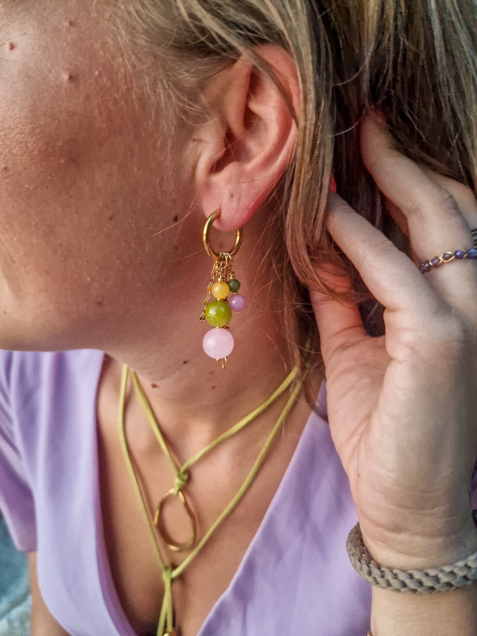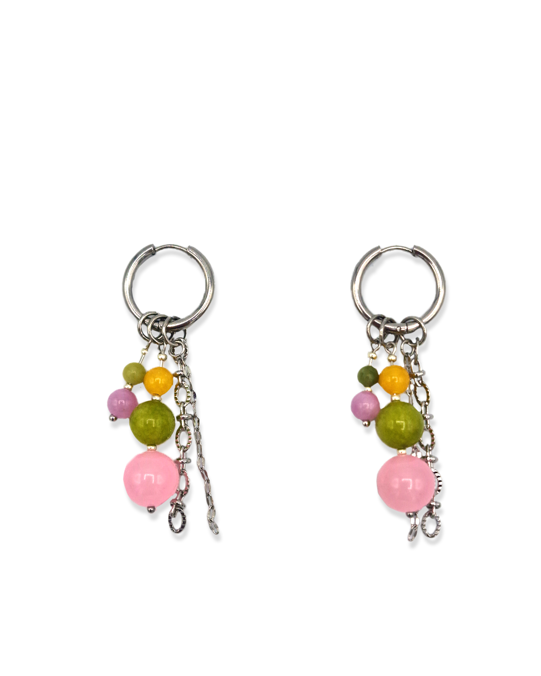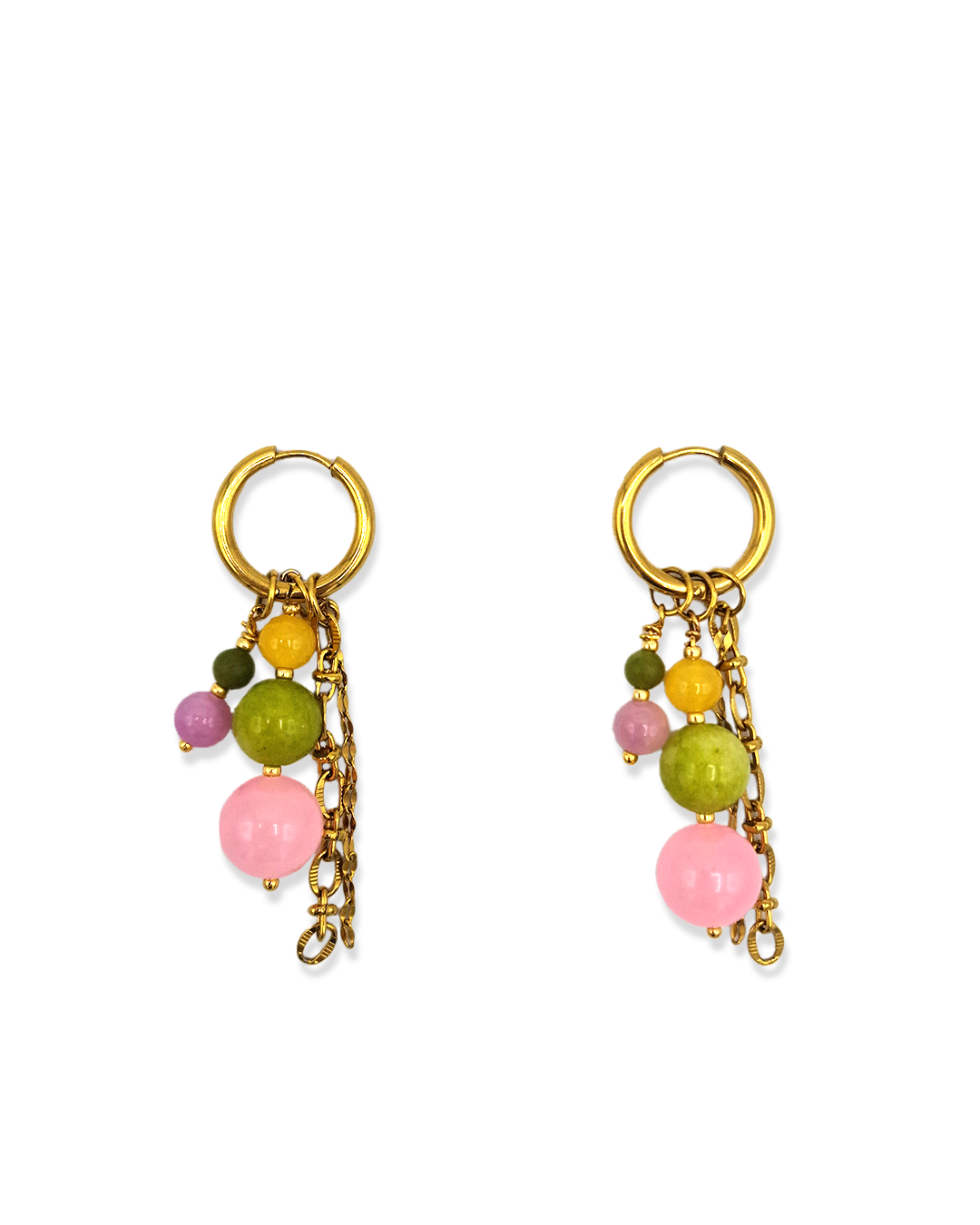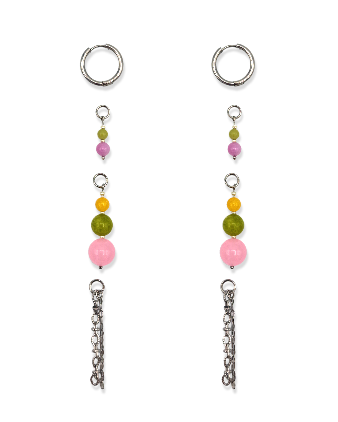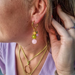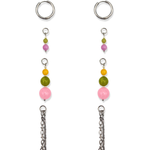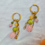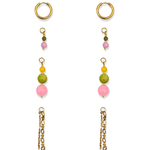 Oorbellen met roze, groene en gele kralen. Het bevat 3 losse hangers, waardoor de oorbellen op vier manieren te dragen zijn!