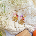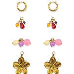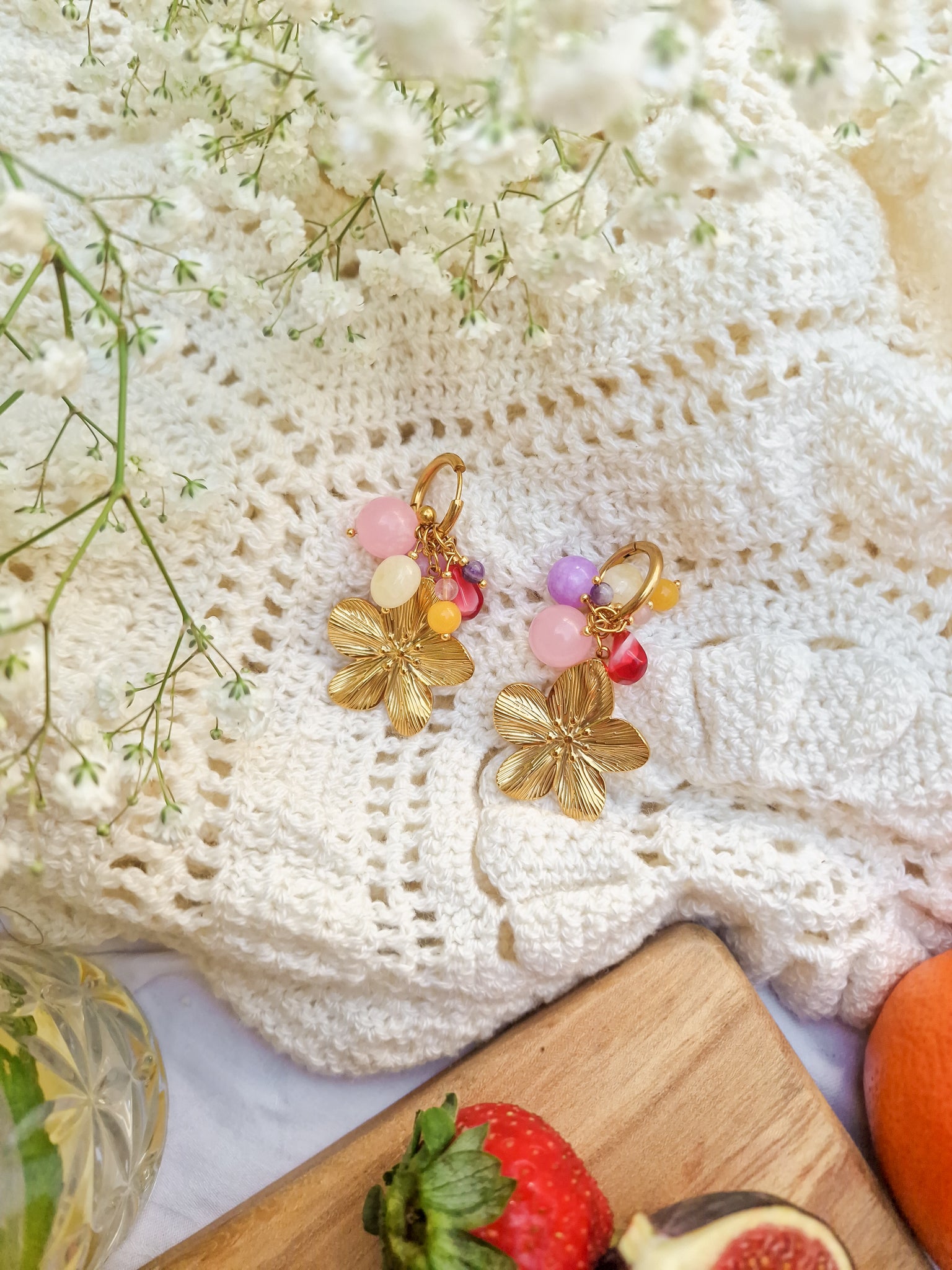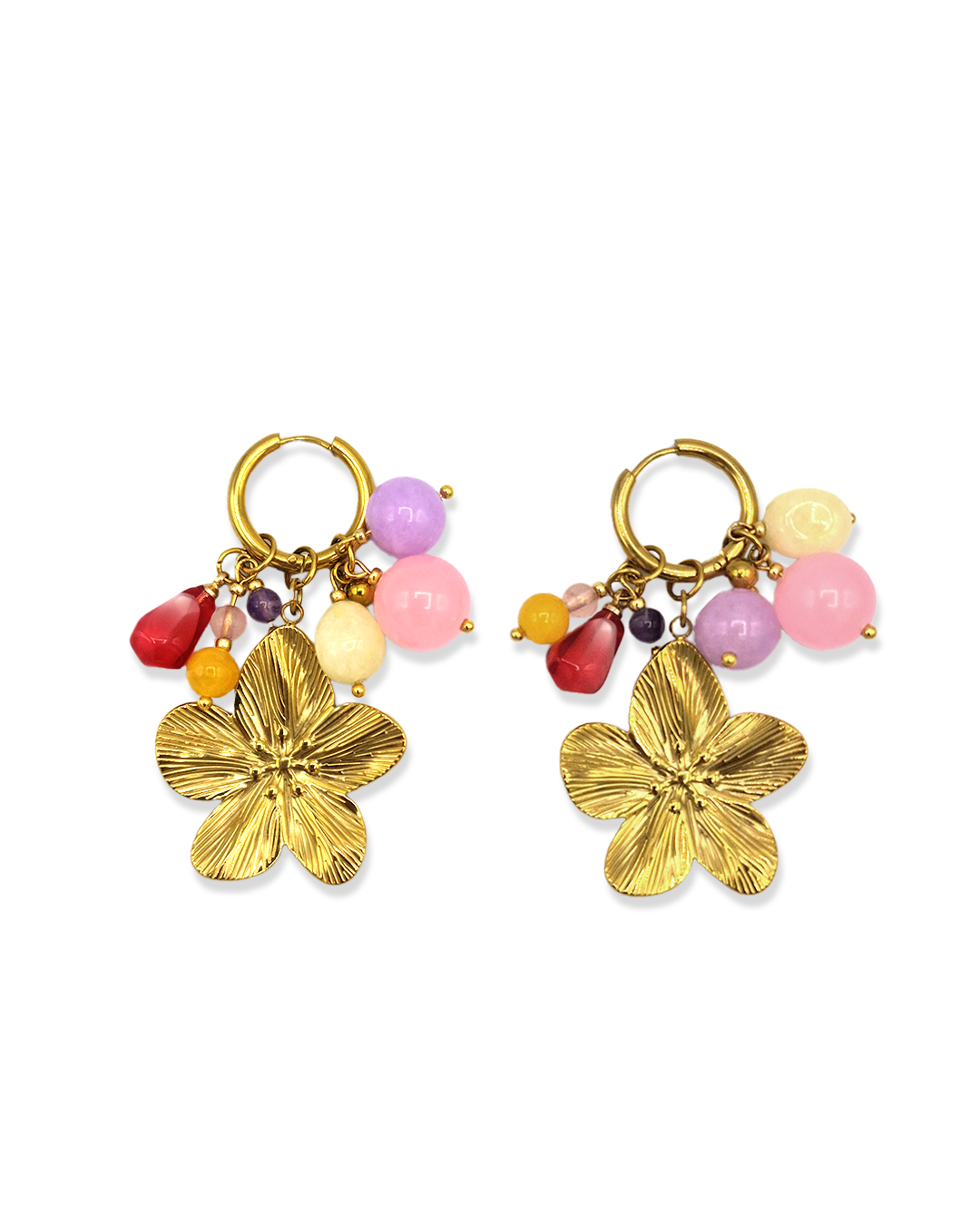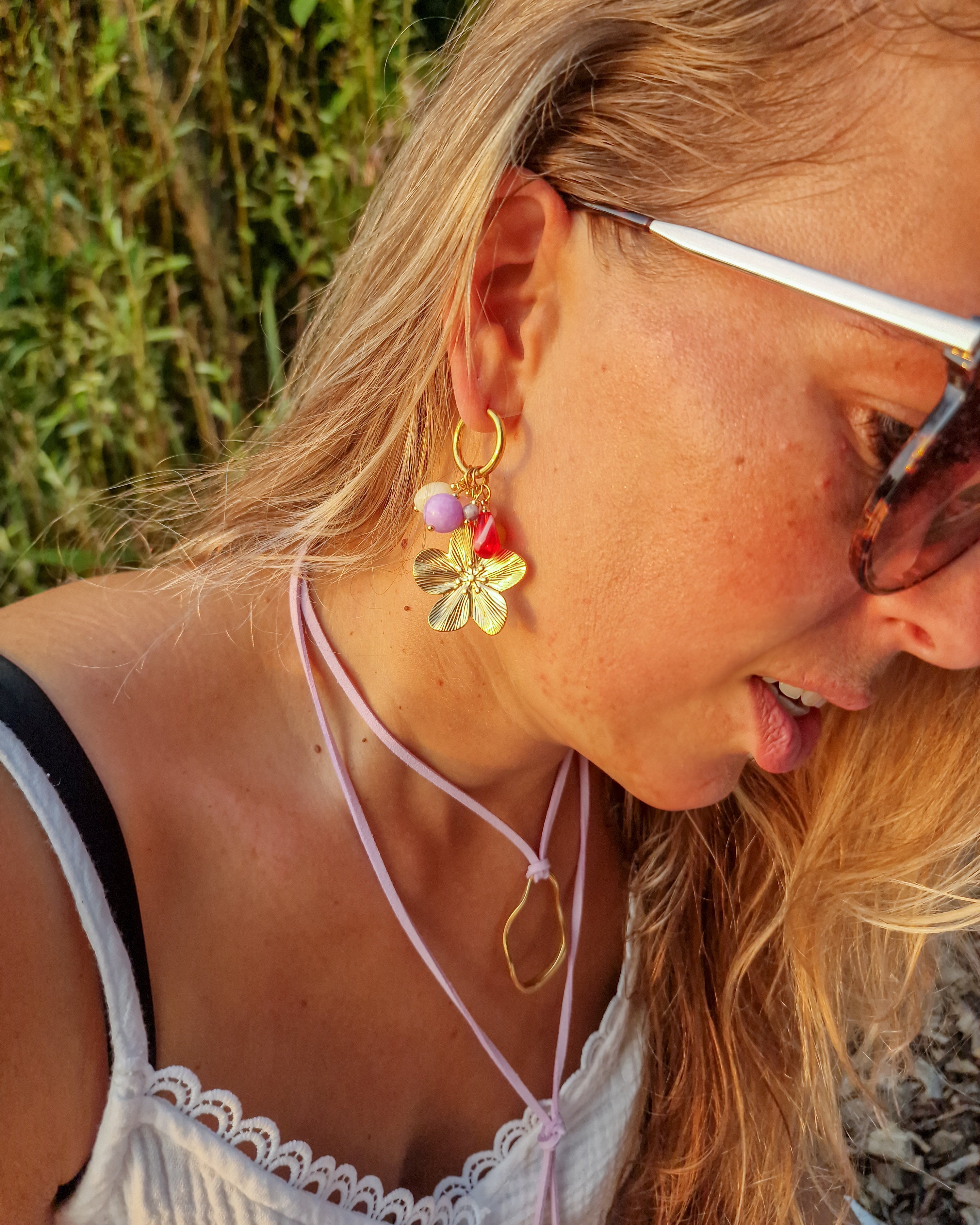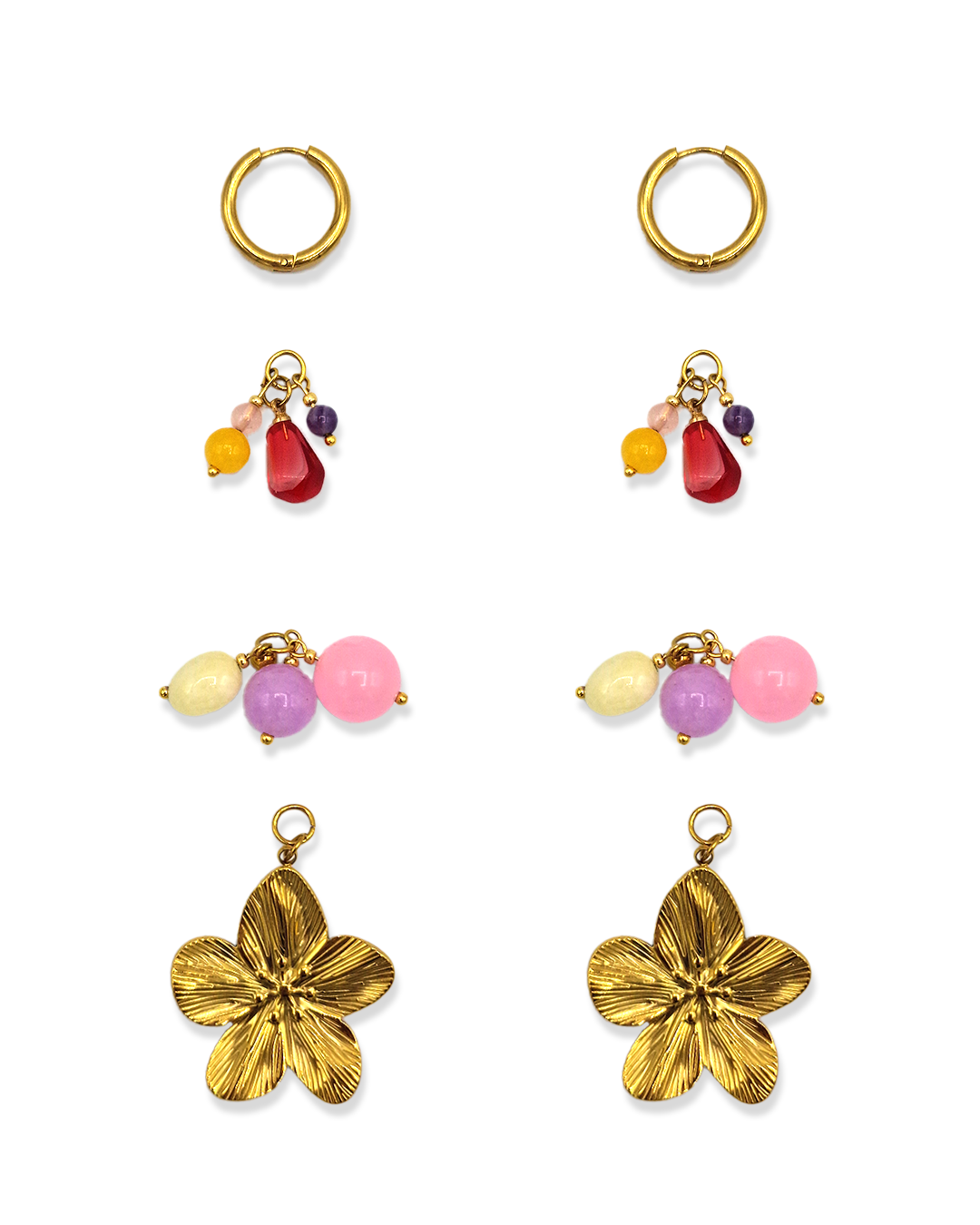Oorbellen met roze, paarse, gele en rode kralen en bloemhanger. Het bevat 3 losse hangers, waardoor de oorbellen op vier manieren te dragen zijn!