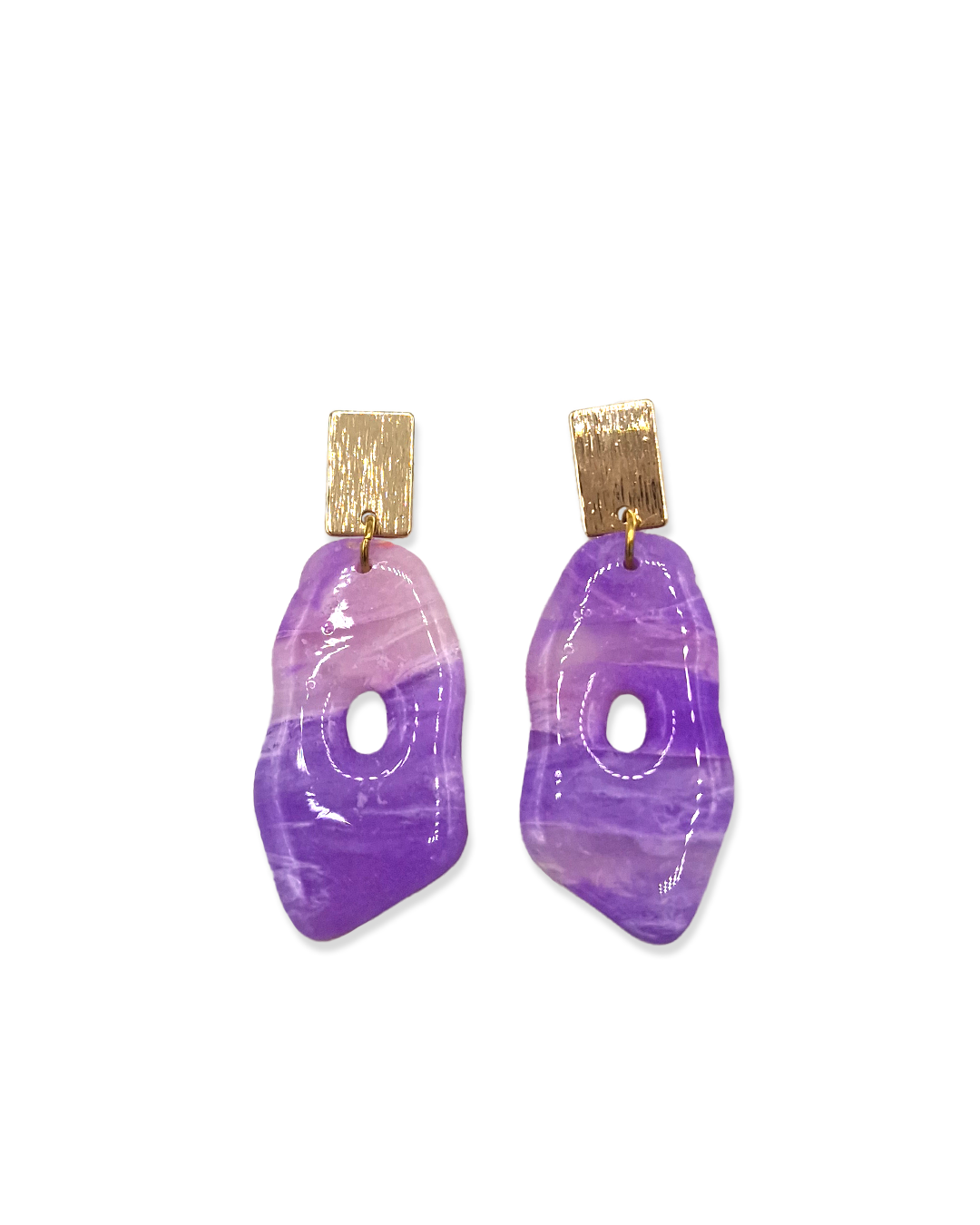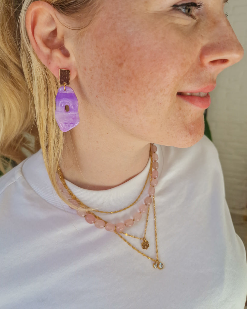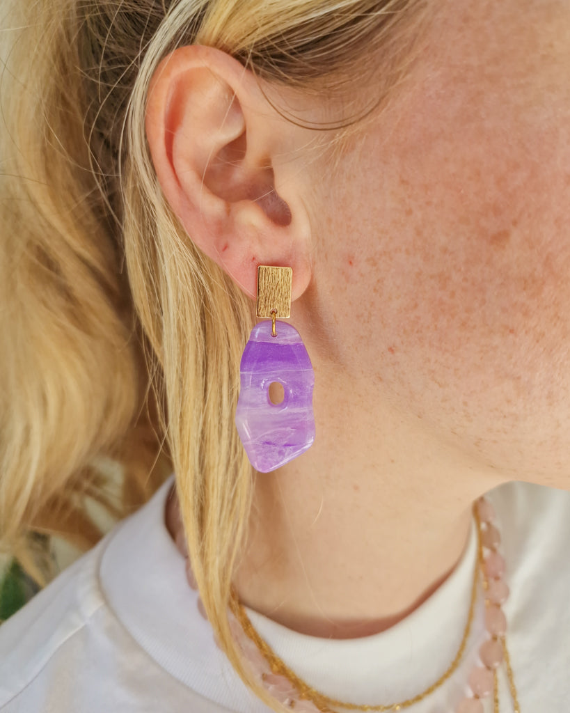 Voor wie houdt van imperfect perfect. Deze organisch gevormde oorbellen met een opvallende lila steen en ruwe gouden top zijn eigenwijs en stijlvol tegelijk. Elk paar is nét een beetje anders, en dat is precies de charme.