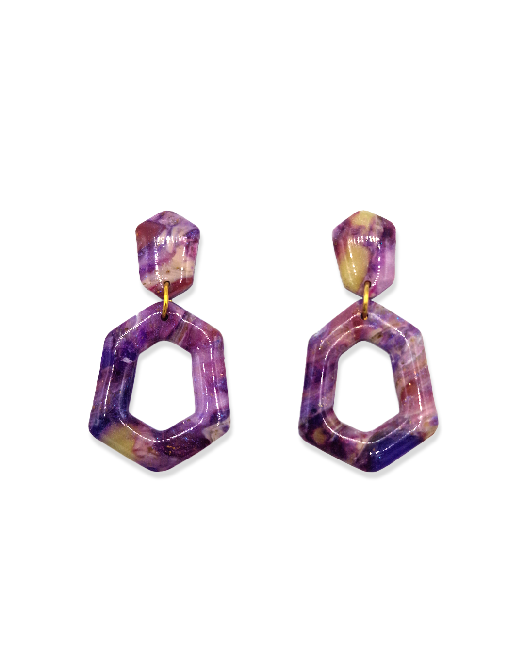 Lichtgewicht klei oorbellen met paarse en gele watercolor effect.