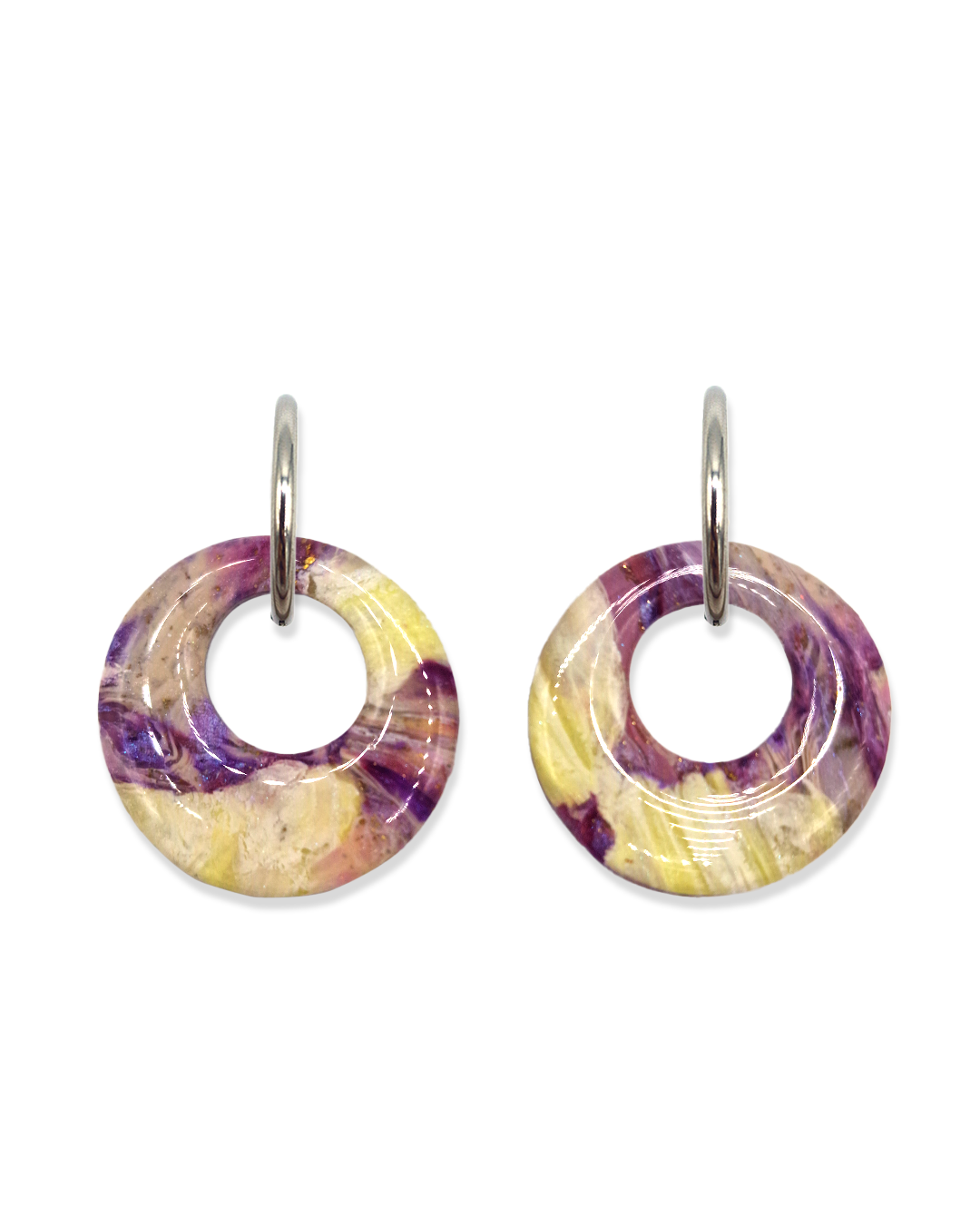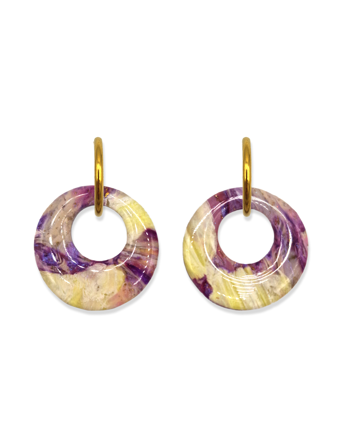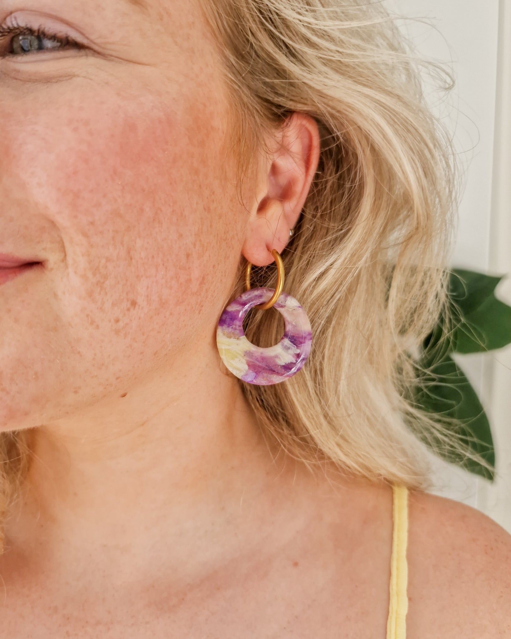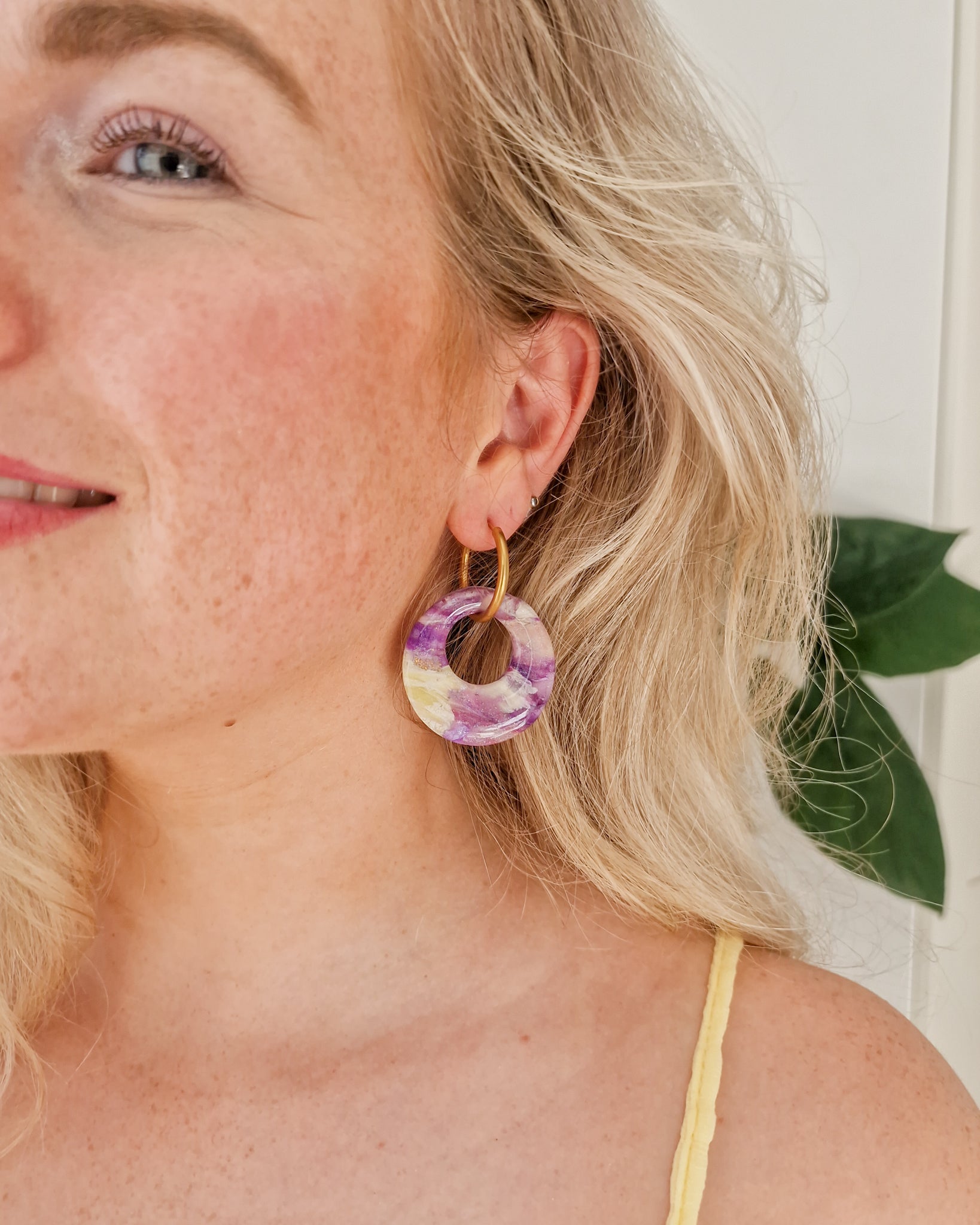 Lichtgewicht klei oorbellen met paarse en gele watercolor effect. Deze oorbellen zijn dubbelzijdig, met op de achterkant een lila paarse kleur.