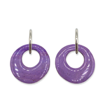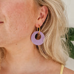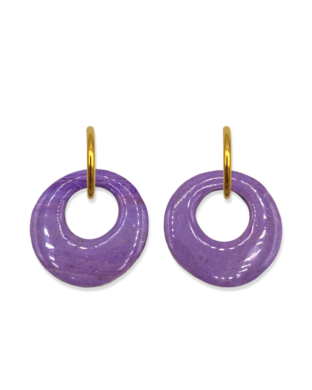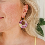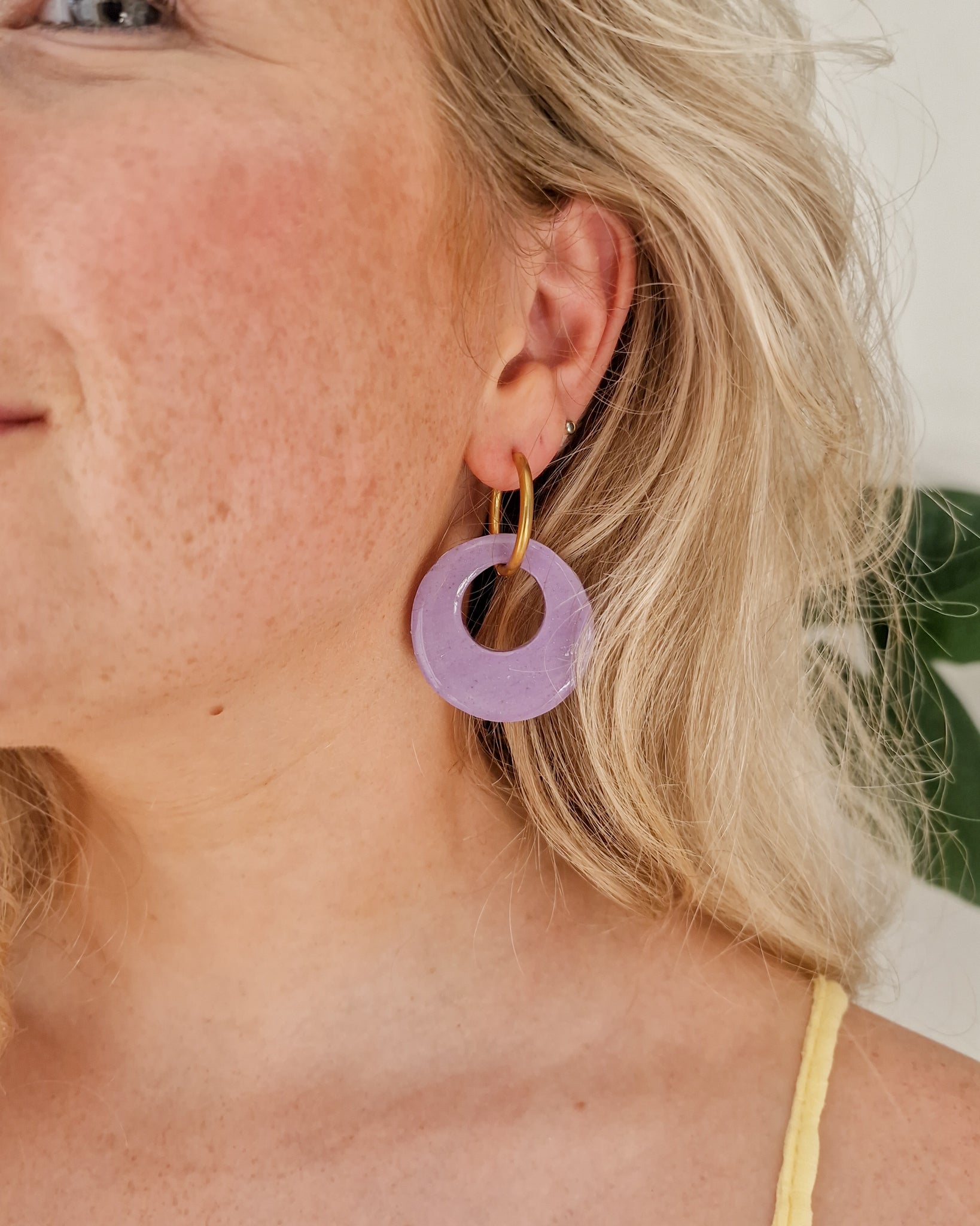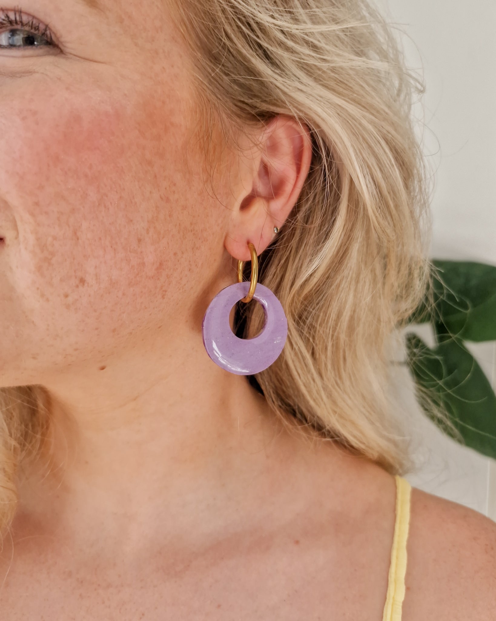 Lichtgewicht klei oorbellen met paarse en gele watercolor effect. Deze oorbellen zijn dubbelzijdig, met op de achterkant een lila paarse kleur.