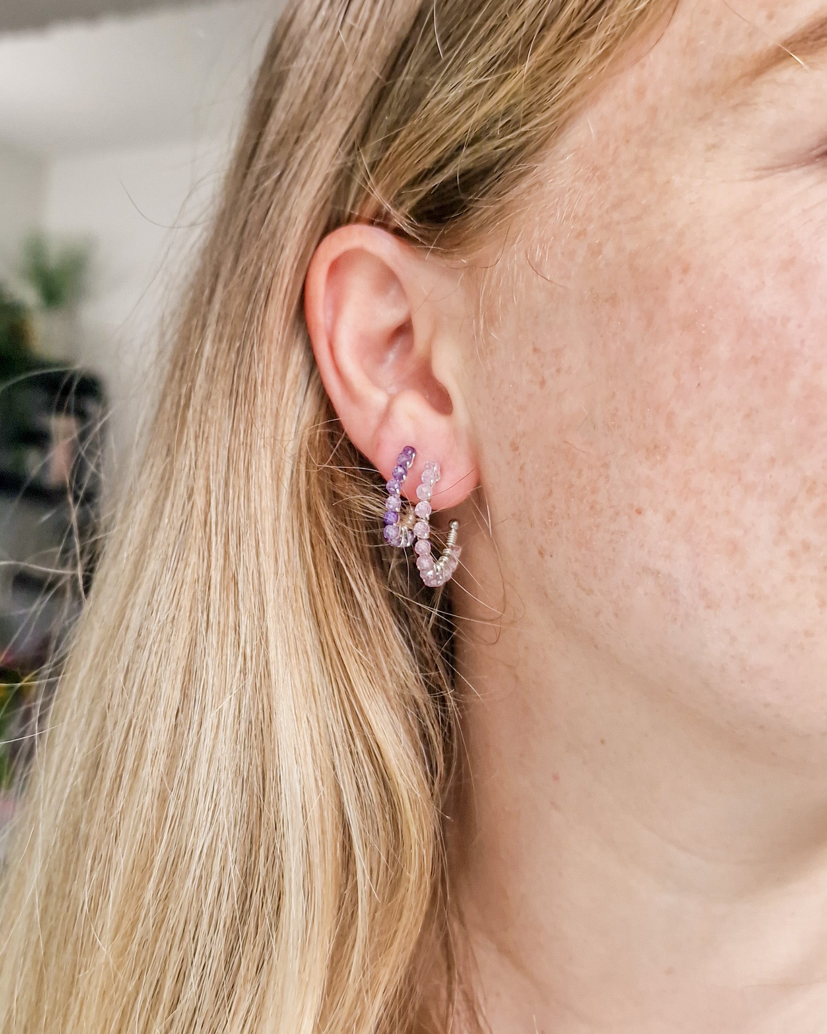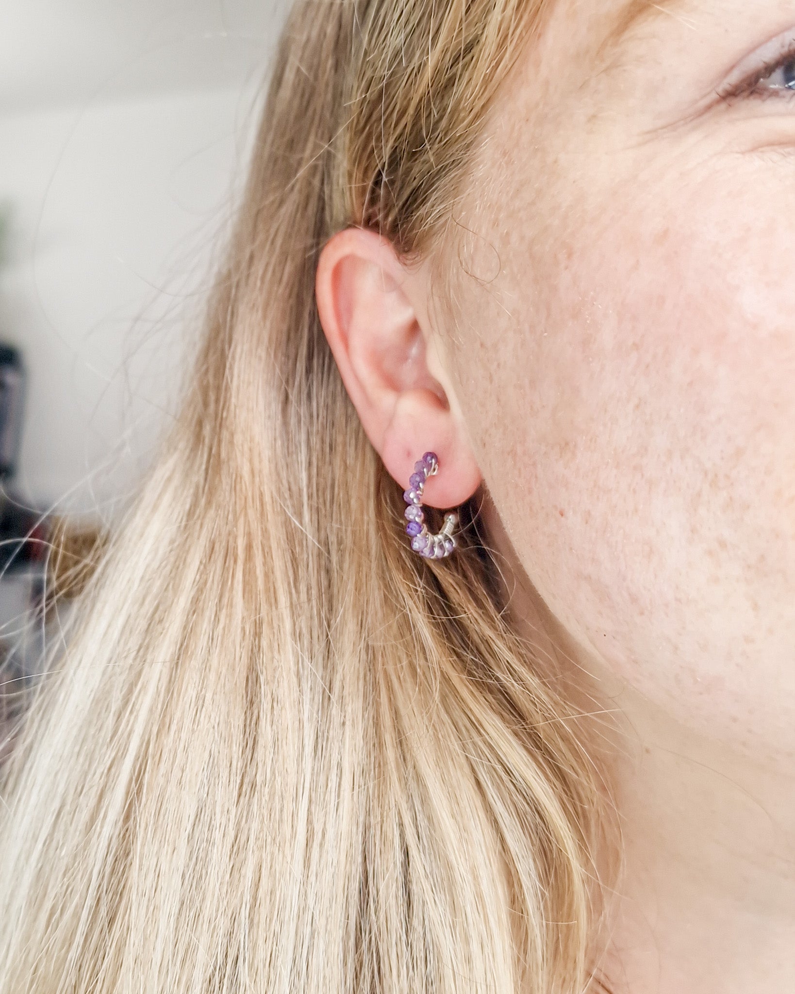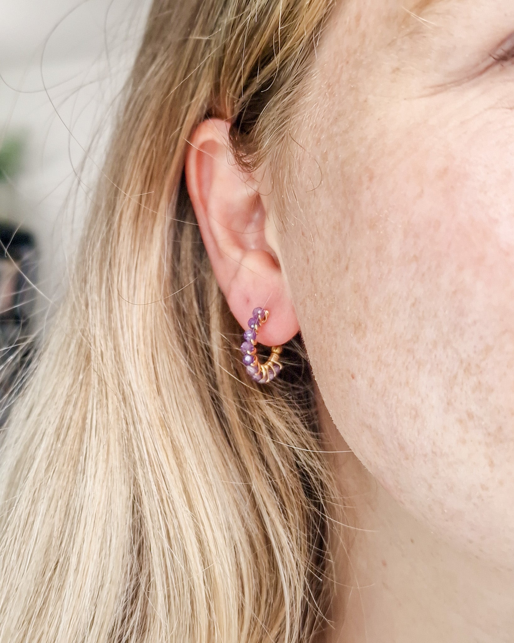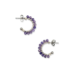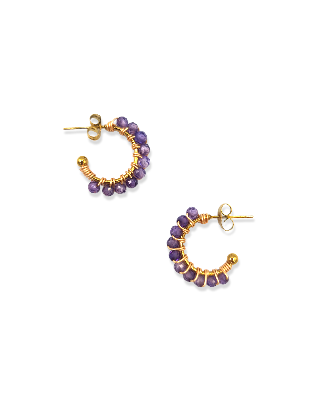 Wire-wrapped oorringetjes met half-edelsteen Amethyst kraaltjes. Deze kraaltjes zijn facet geslepen waardoor ze een subtiele shimmer hebben. Verkrijgbaar in zilver en goud.