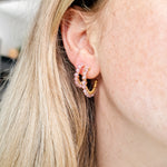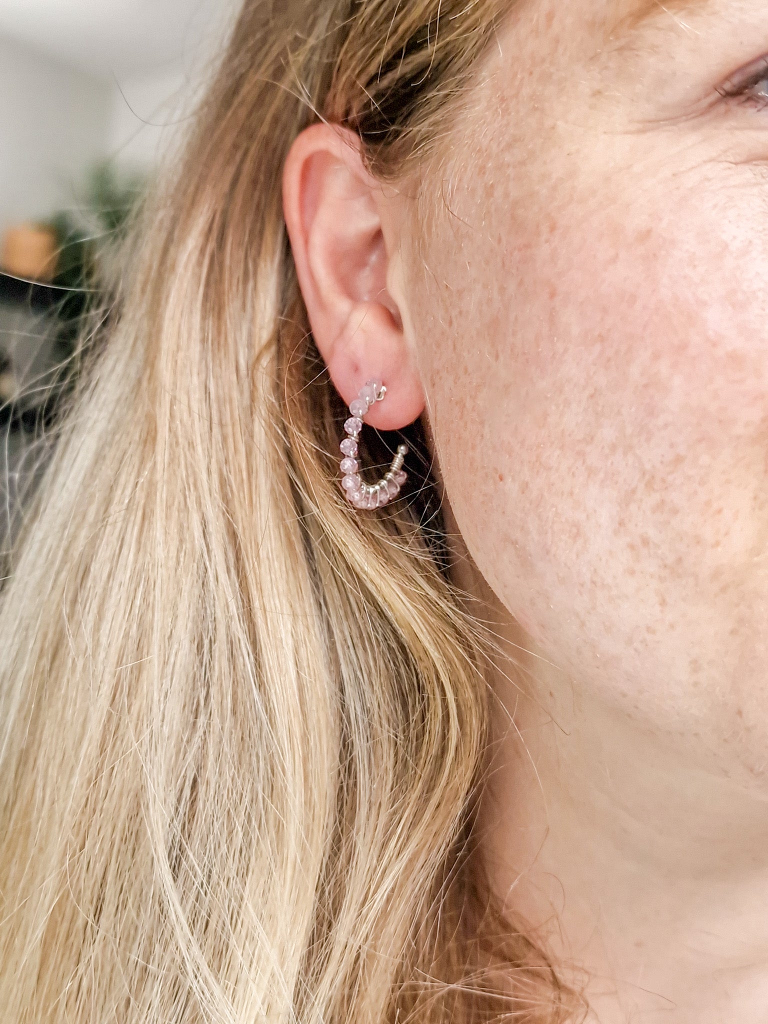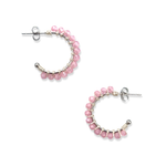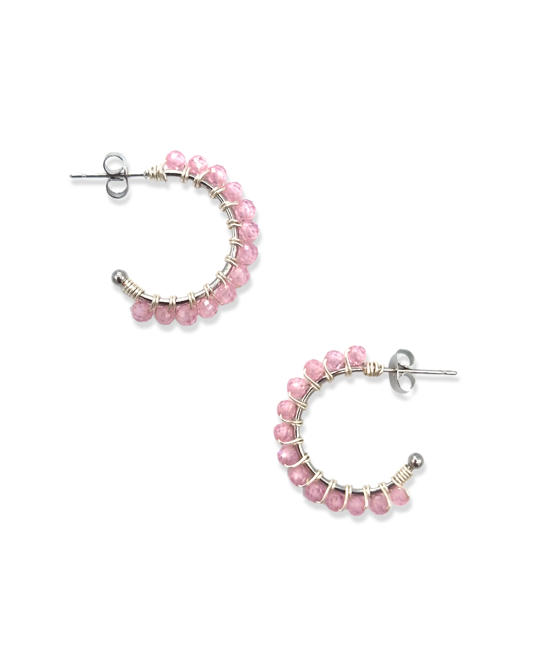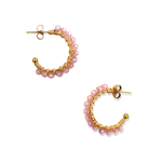 Wire-wrapped oorringetjes met half-edelsteen Rose Quartz kraaltjes. Deze kraaltjes zijn facet geslepen waardoor ze een subtiele shimmer hebben. Verkrijgbaar in zilver en goud.