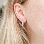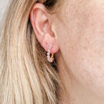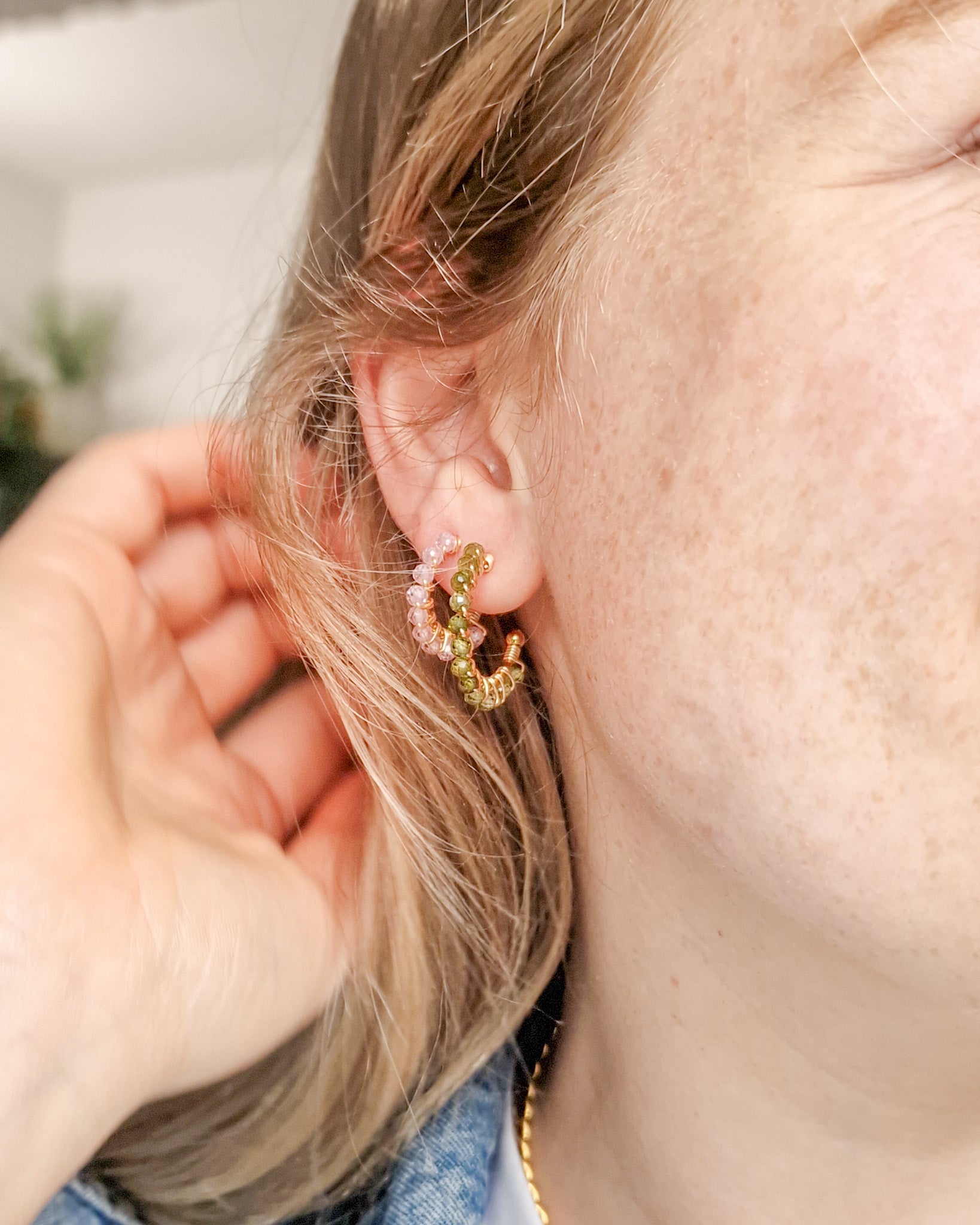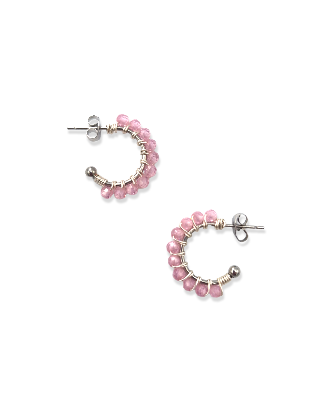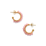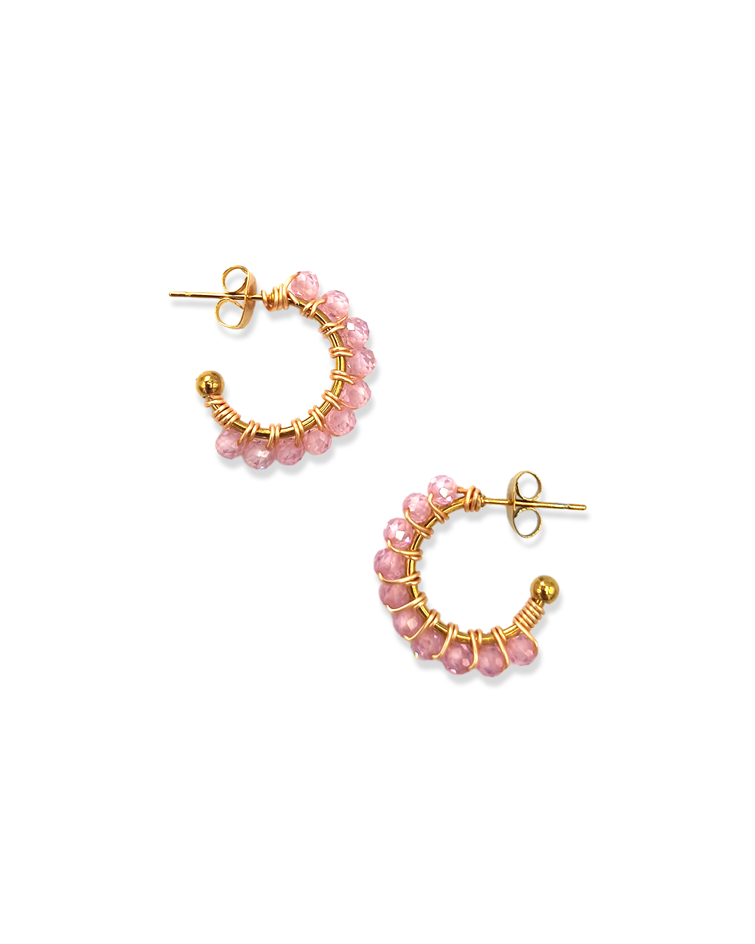 Wire-wrapped oorringetjes met half-edelsteen Rose quartz kraaltjes. Deze kraaltjes zijn facet geslepen waardoor ze een subtiele shimmer hebben. Verkrijgbaar in zilver en goud.