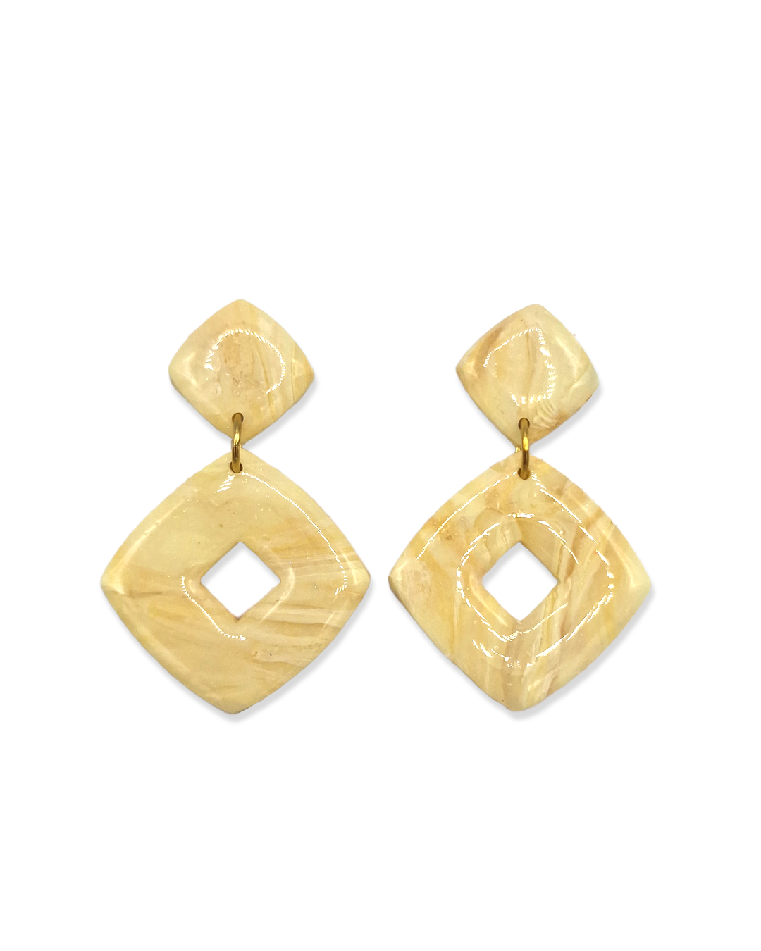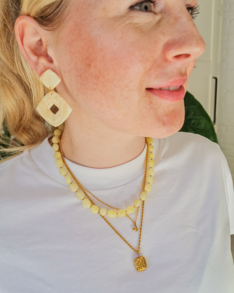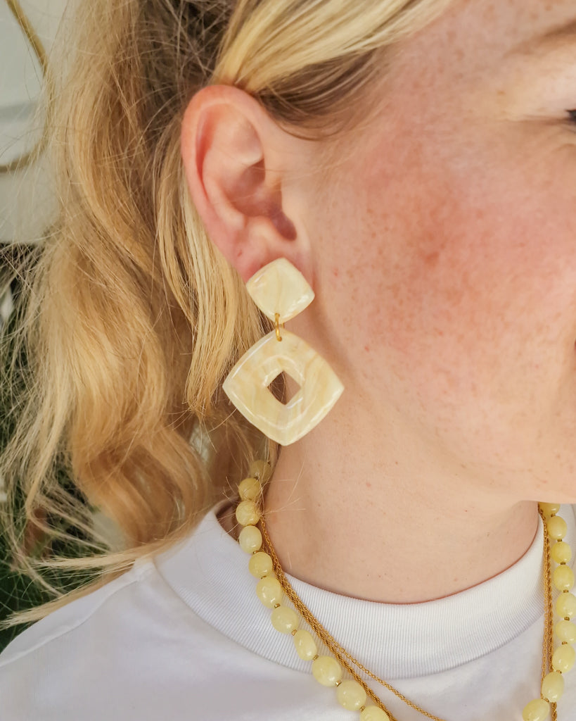 Voor de days you feel like standing out. De Yellow Stone Square oorbellen hebben een krachtige geometrische vorm in zachte, marmerachtige butter yellow tinten. Lichtgewicht, maar met impact, perfect voor een diner, feestje of gewoon je favoriete jeans en tee. Voeg instant power toe aan je look met deze bold beauties. Helemaal BLOSS.