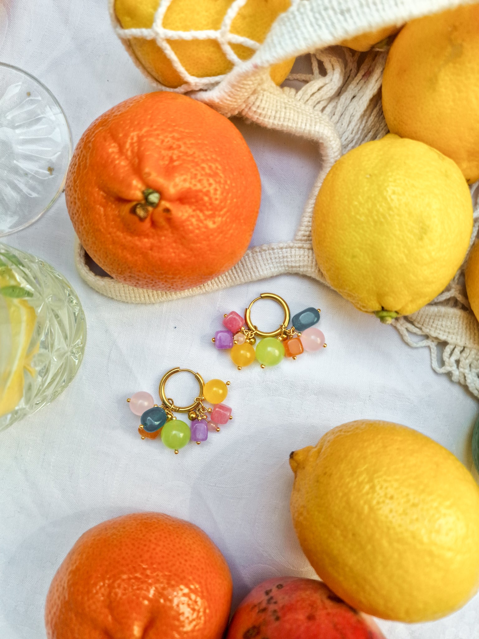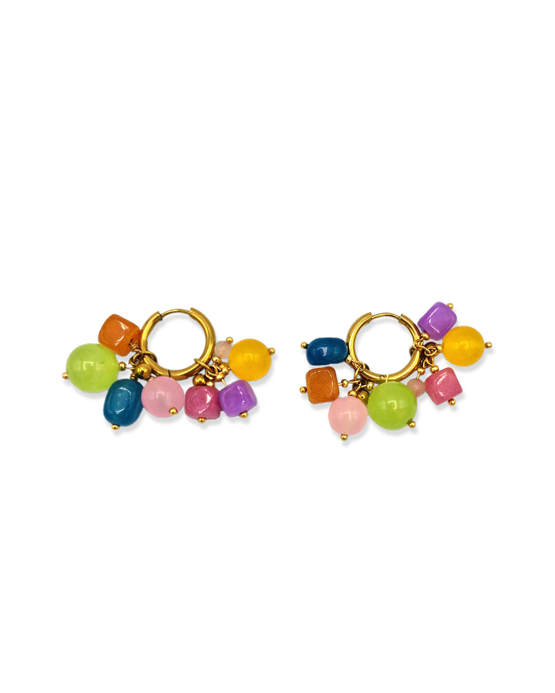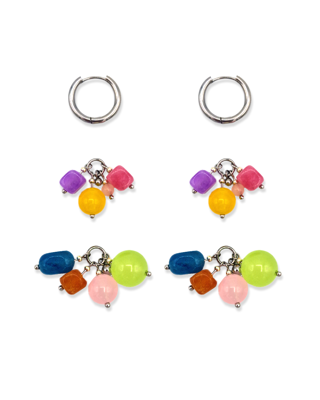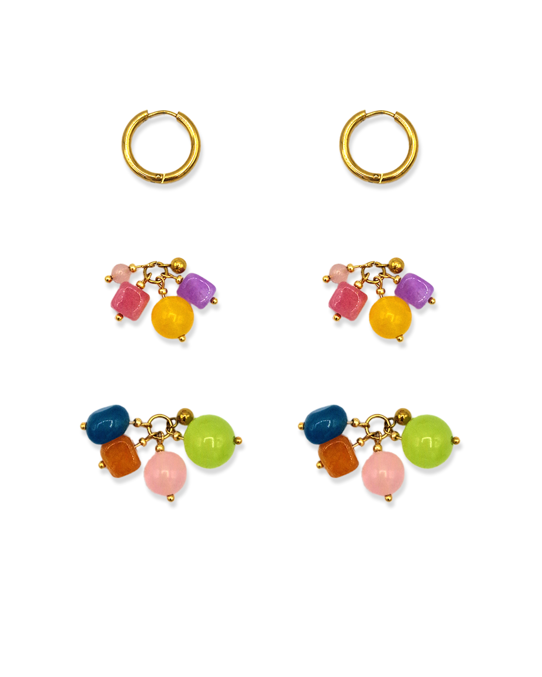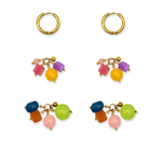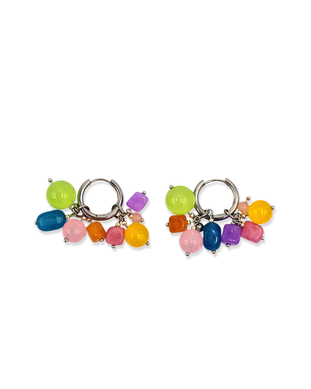 Oorbellen met roze, paarse, blauwe, oranje, groene en gele kralen. Het bevat 2 losse hangers, waardoor de oorbellen op drie manieren te dragen zijn!