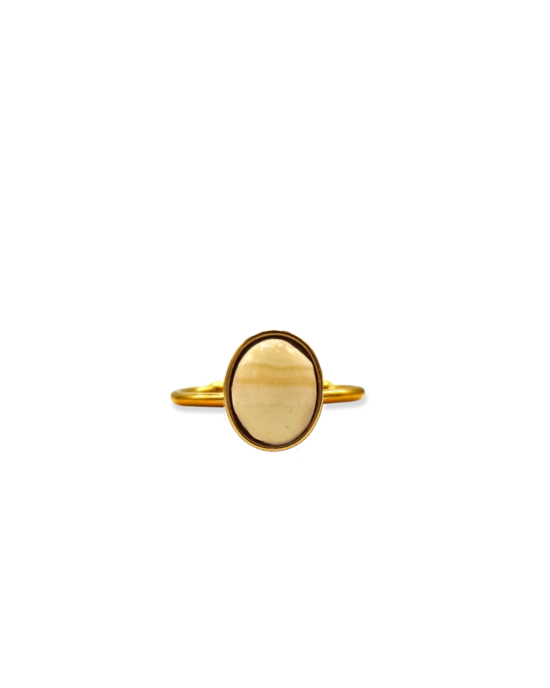 Soft shape, sculpted simplicity. De Butter Oval Mini Ring brengt warmte in je look met zachte zand- en crèmetinten. Een subtiel statement dat elke outfit net dat beetje kracht geeft.