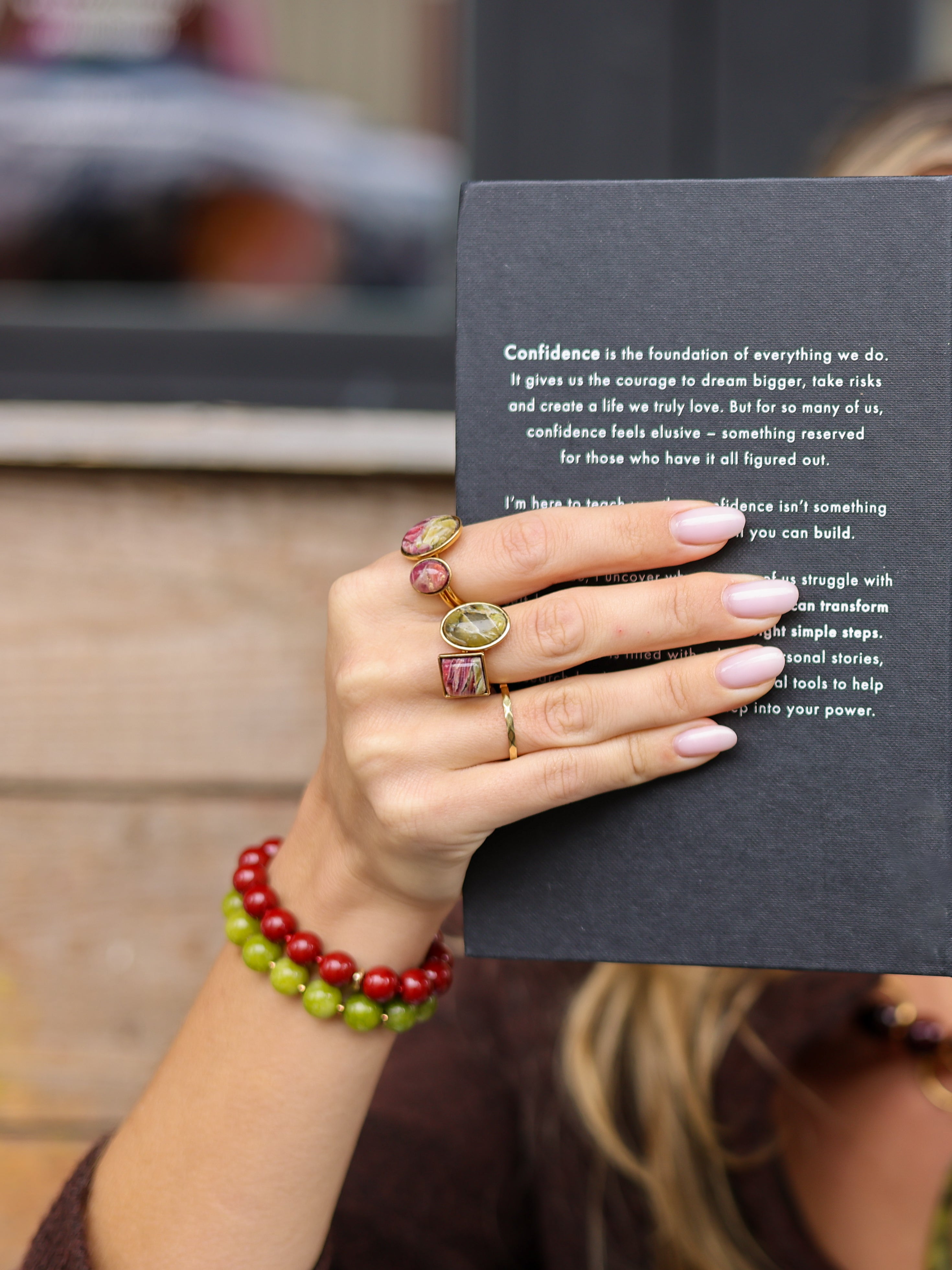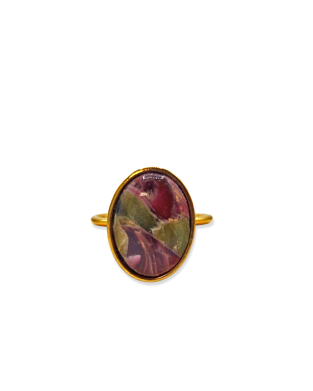 Bold color, balanced shape. Een harmonieuze mix van groentinten en merlotrood, gevangen in een zachte ovale vorm. De Merlot Green Oval Ring is een echte sculpt piece — krachtig en elegant tegelijk.