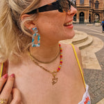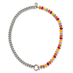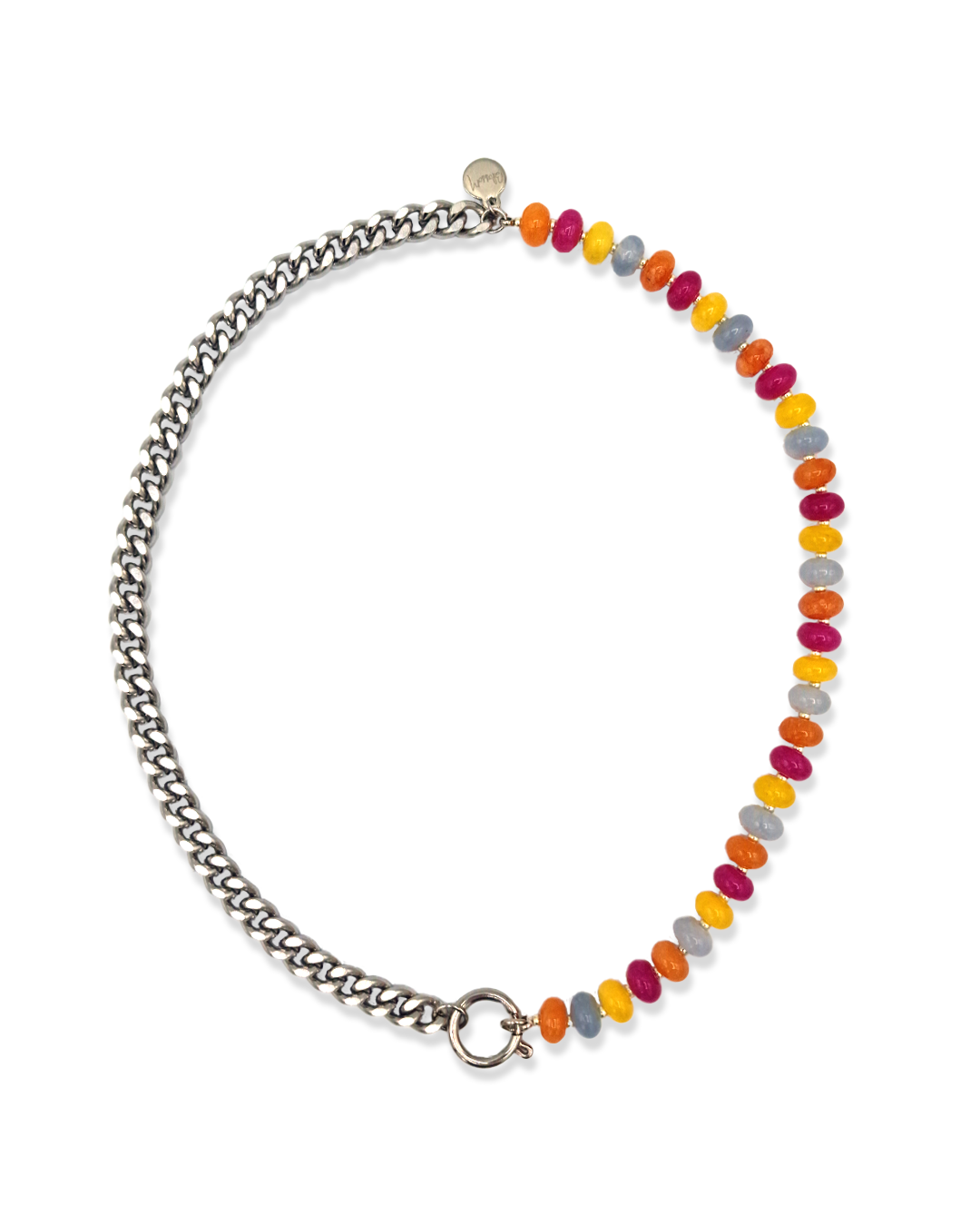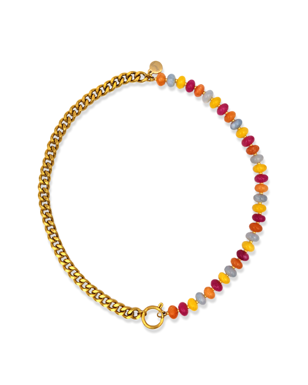 Ketting met natuursteen kralen en kleine glaskralen in lichtblauw, geel en oranje kleur.