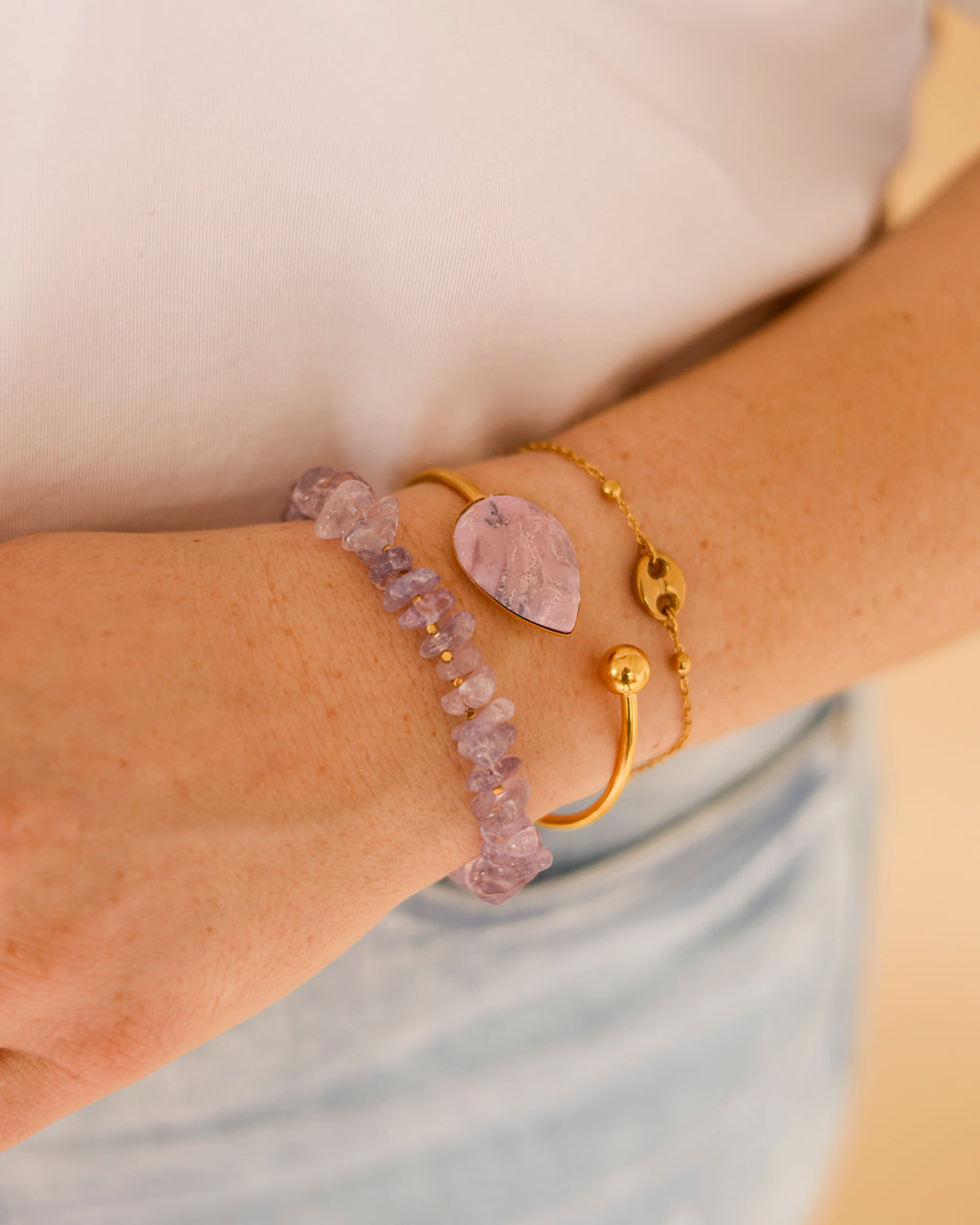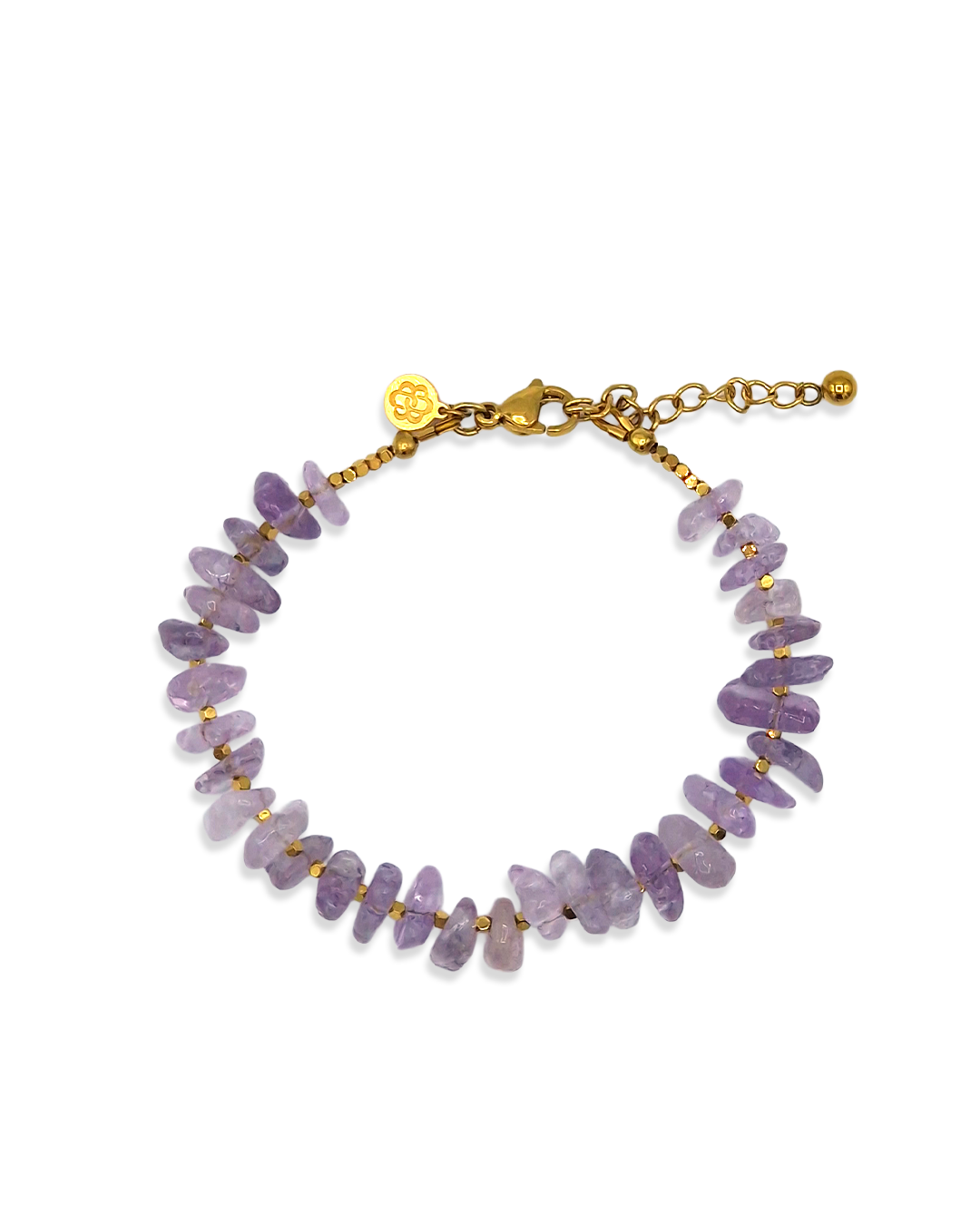 Voeg een krachtig kleuraccent toe met de Light Amethyst armband. De transparante, lila-kleurige kralen vangen het licht en geven je pols een energieke vibe. Door het strakke ontwerp en de gouden afwerking is dit je go-to item voor elke dag. Je stelt hem eenvoudig af op jouw maat met de verlengketting. β¨π