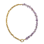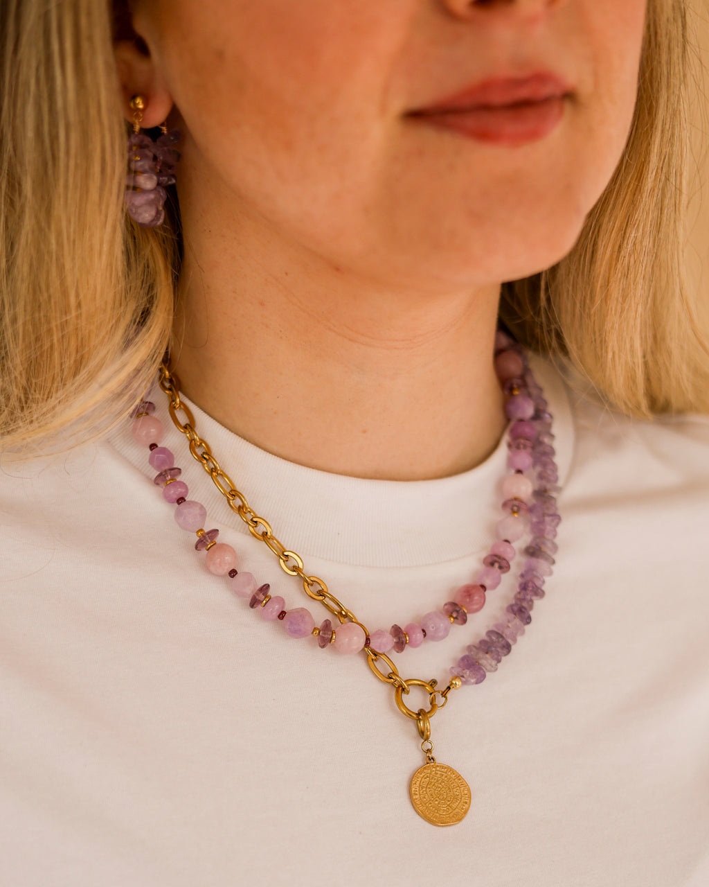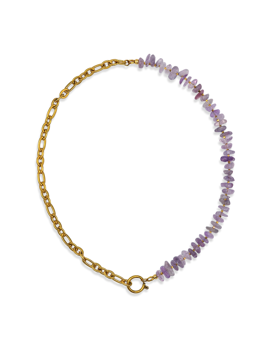 Maak een statement met deze Light Amethyst ketting. De transparante, lila-kleurige kralen vangen het licht en geven je halslijn direct een frisse en energieke uitstraling. Door het strakke ontwerp met gouden spacers is dit je ideale go-to item voor elke dag. Je draagt hem solo op een basic wit shirt of mixt hem met gouden layer chains voor een eigenzinnige stack. ✨💜