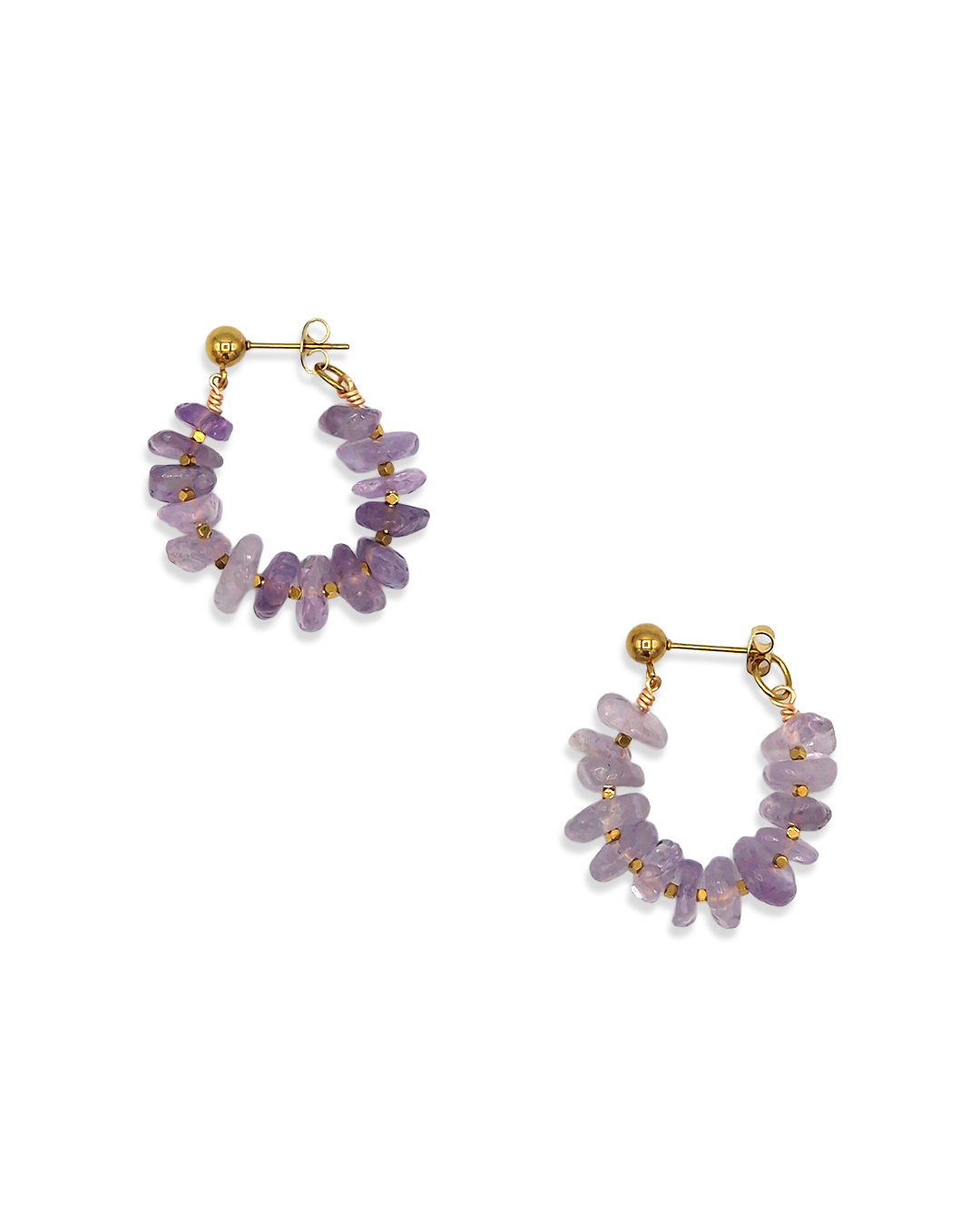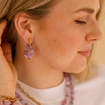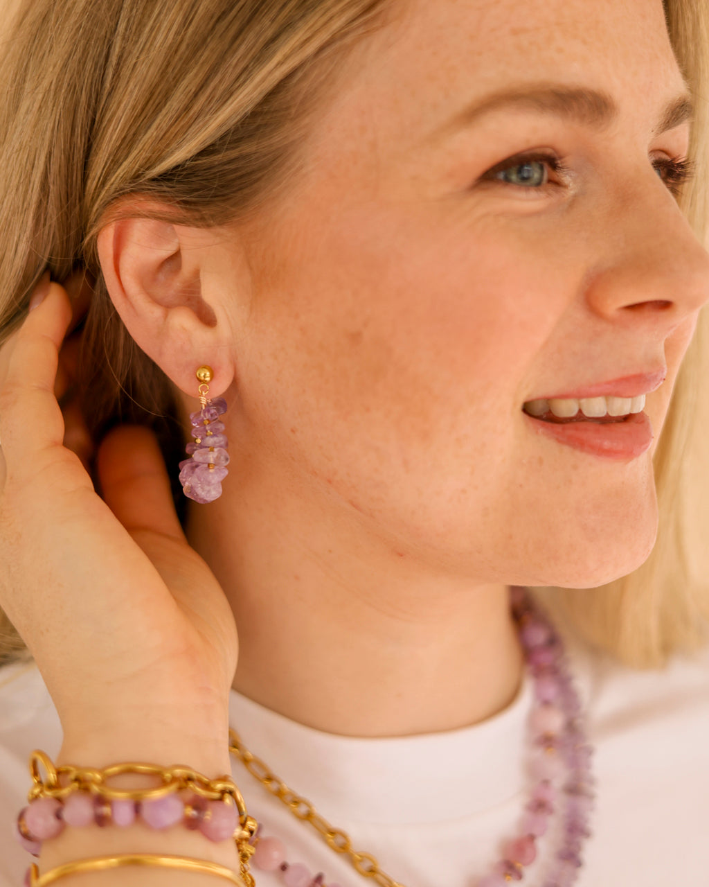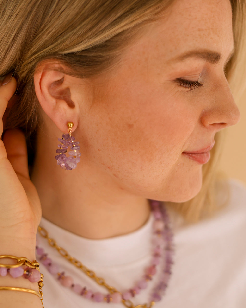 Zet een krachtig kleuraccent met deze Amethyst Light oorbellen. De goudkleurige, bewerkte rand omlijst een lila steen die je gezicht direct oplicht. Je draagt deze studs net zo makkelijk naar je werk als tijdens een avond uit. Een onmisbaar item voor je dagelijkse rotatie dat altijd een zelfverzekerde indruk achterlaat. ✨💜