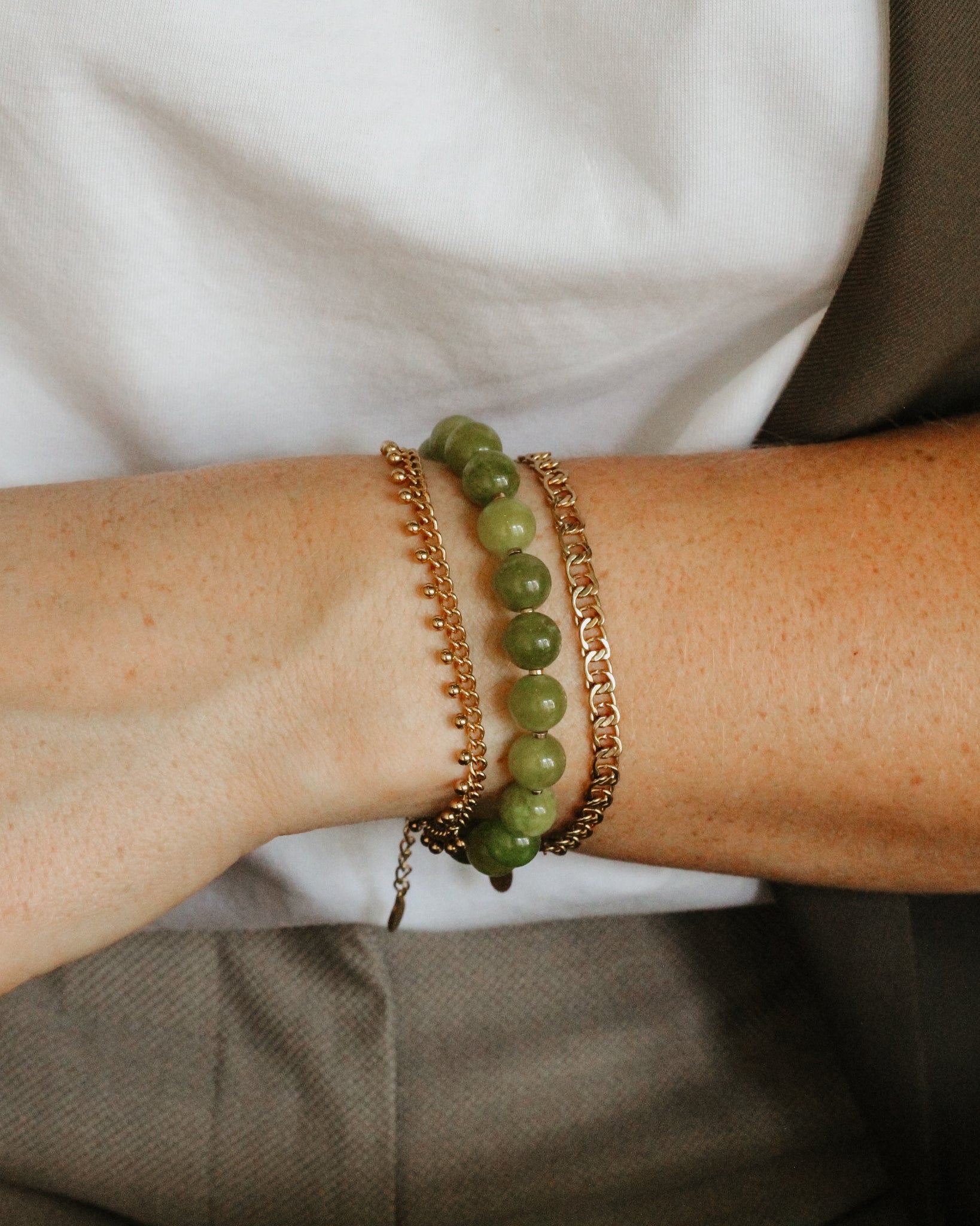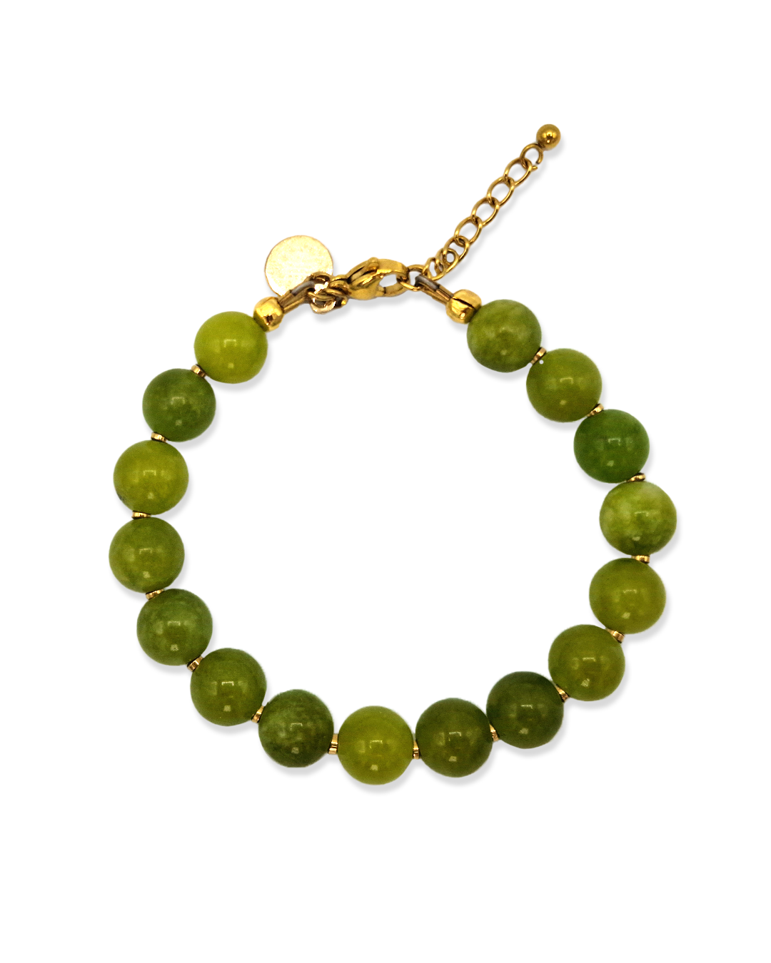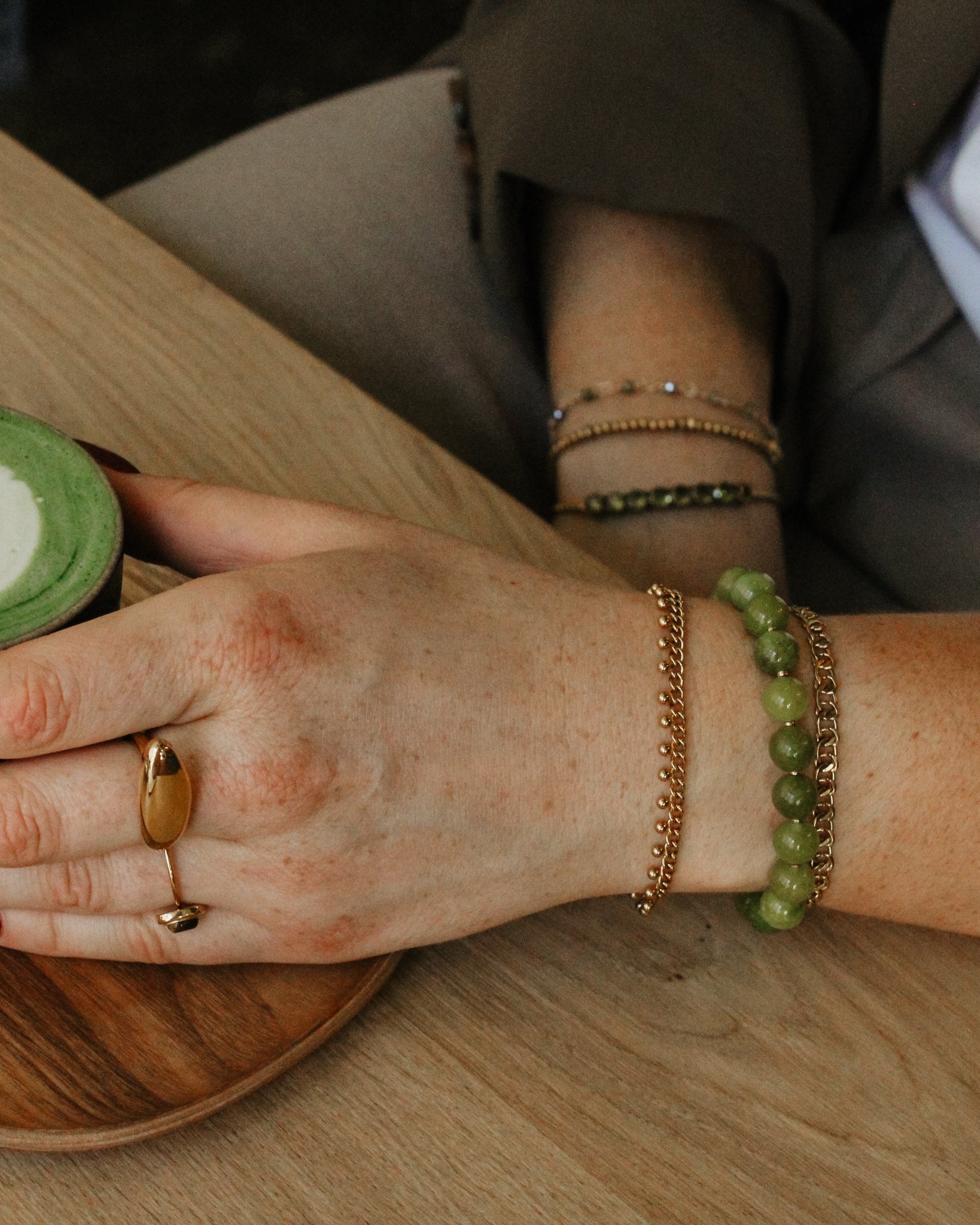 Breng de warme kleuren van het seizoen in je look met de Matcha Green Beads armband uit de Fall for Confidence collectie. Ontworpen om je stijl moeiteloos te versterken en je zelfvertrouwen te vergroten, zonder dat je je garderobe hoeft te vernieuwen! Gemaakt met Olivine Green Jade natuursteen kralen.