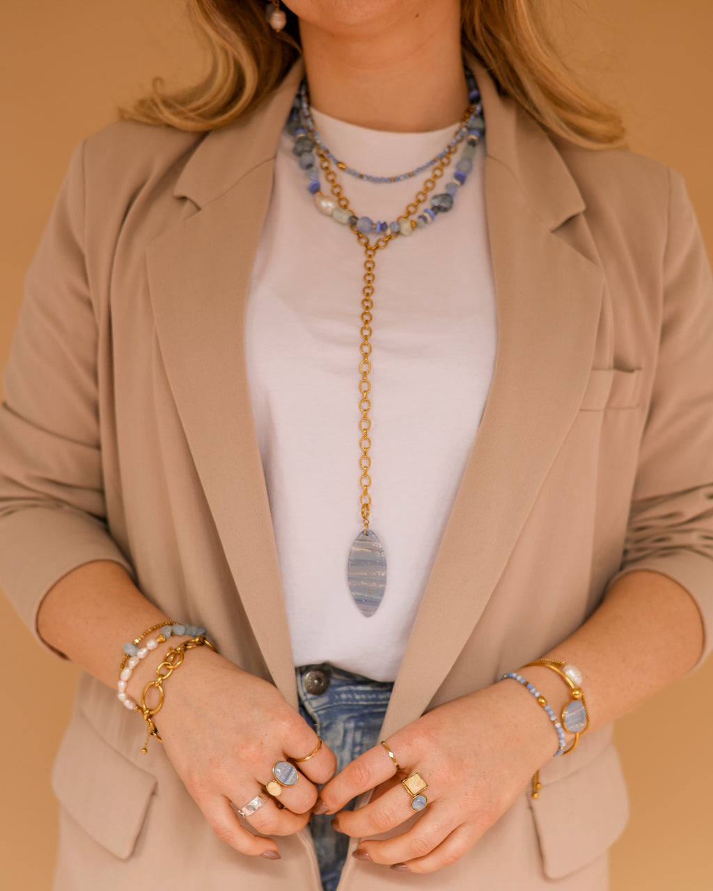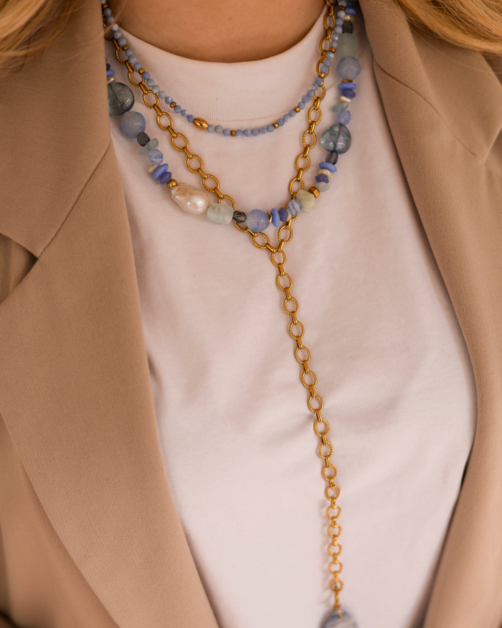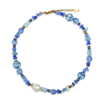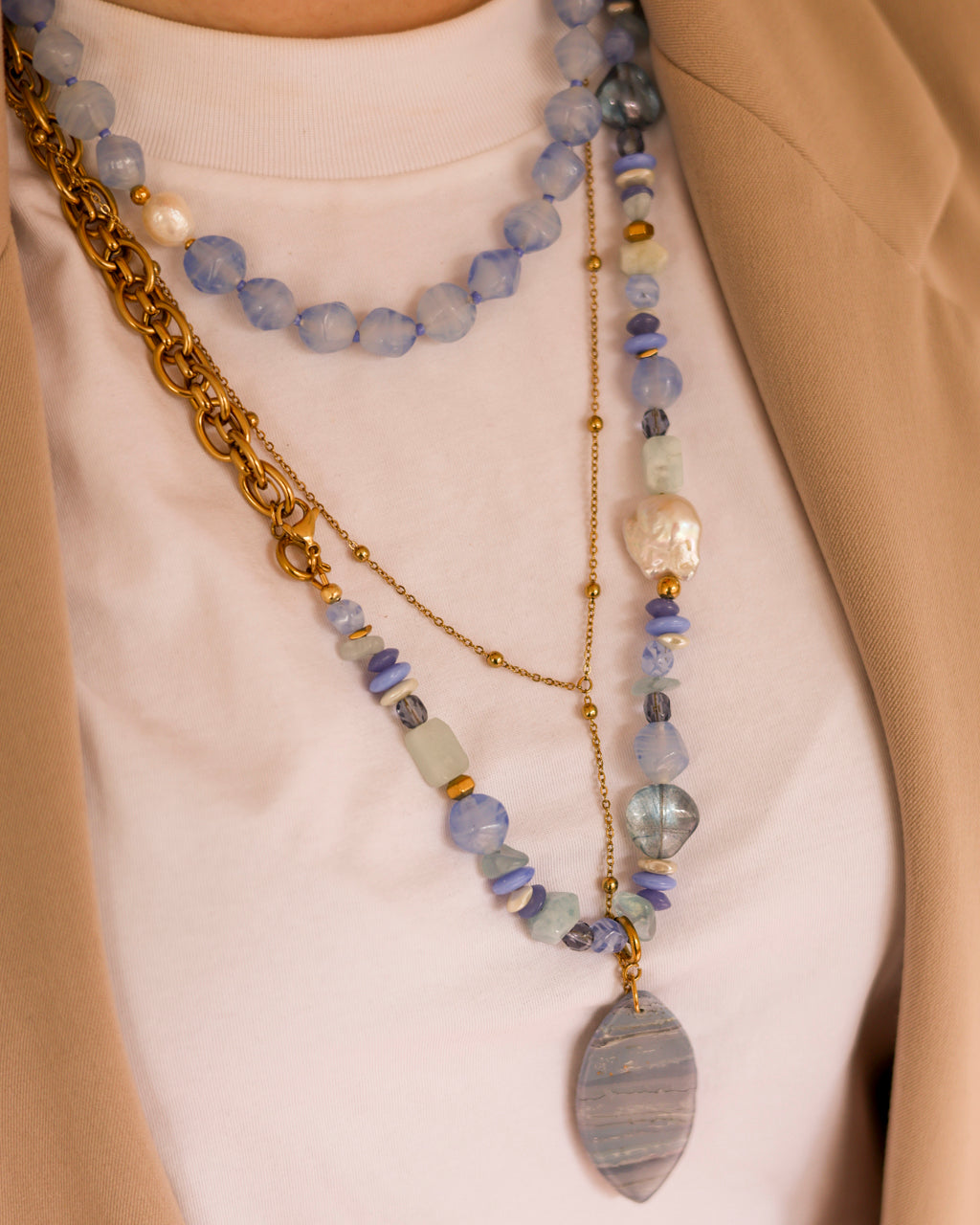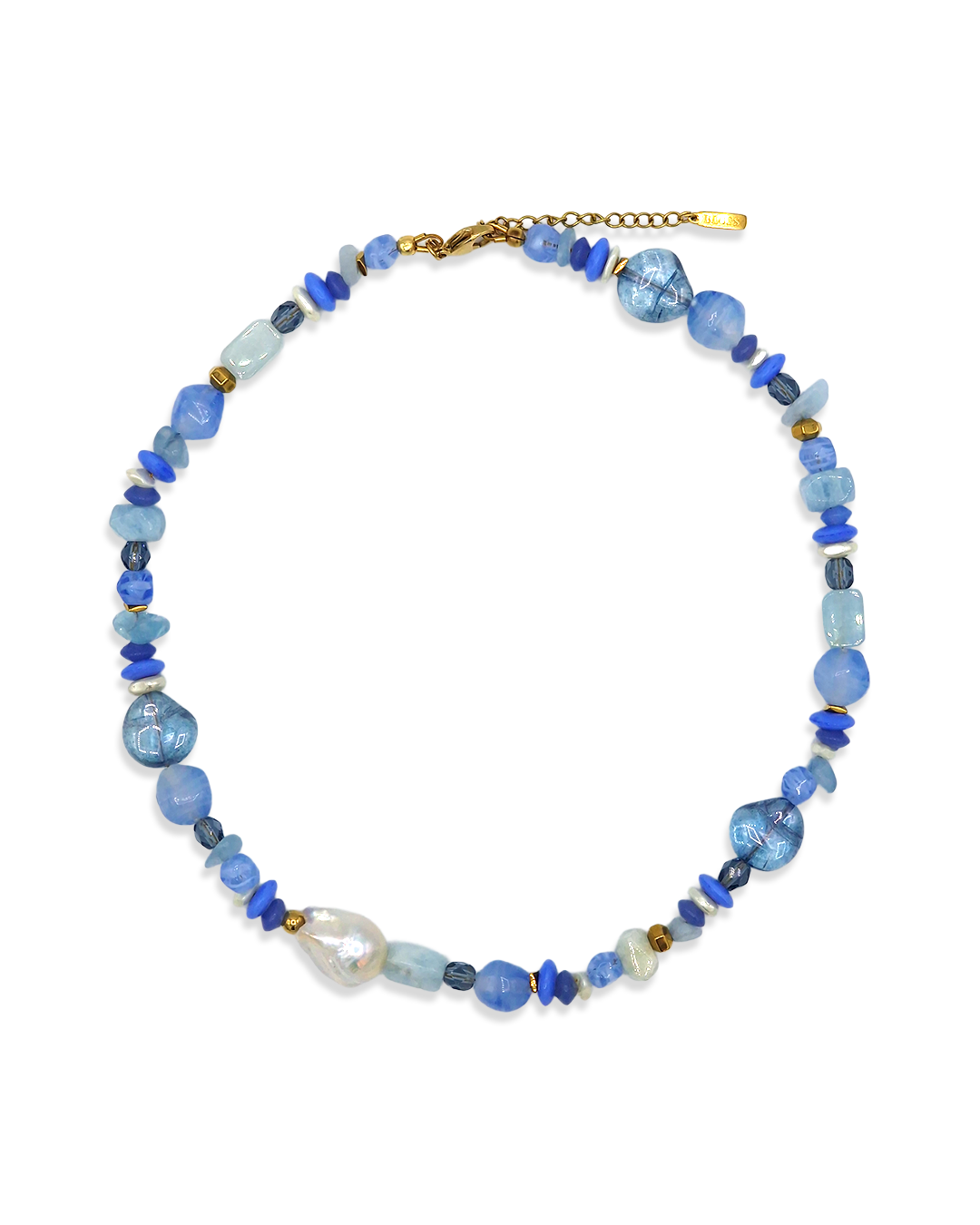 De Ocean Wave ketting is een energiek sieraad met een unieke compositie. In dit ontwerp wisselen blauwe Aquamarine natuursteen, glaskralen en fonkelende Swarovski kralen elkaar af voor een gelaagd effect. De grote, organische barokparel vormt het krachtige middelpunt van de ketting. Met de goudkleurige accenten en de stevige sluiting is dit een ambitieus item dat elke basislook naar een hoger niveau tilt. Draag hem als eyecatcher op een strakke outfit voor maximale impact! 🌊✨