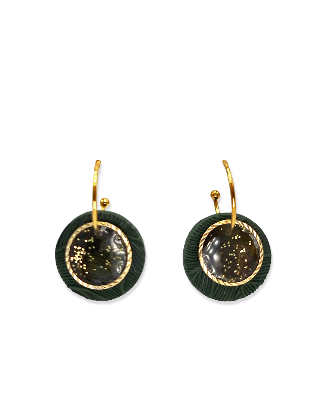 Deze oorbellen geven een subtiel maar duidelijk statement. De diepe emerald kleur voelt krachtig en modern. De ronde vorm met een glitterende resin stone in het midden vangt licht op een rustige maar zichtbare manier. De oorring maakt het geheel speels, clean en makkelijk te dragen bij zowel feestlooks als everyday outfits met een beetje extra.
